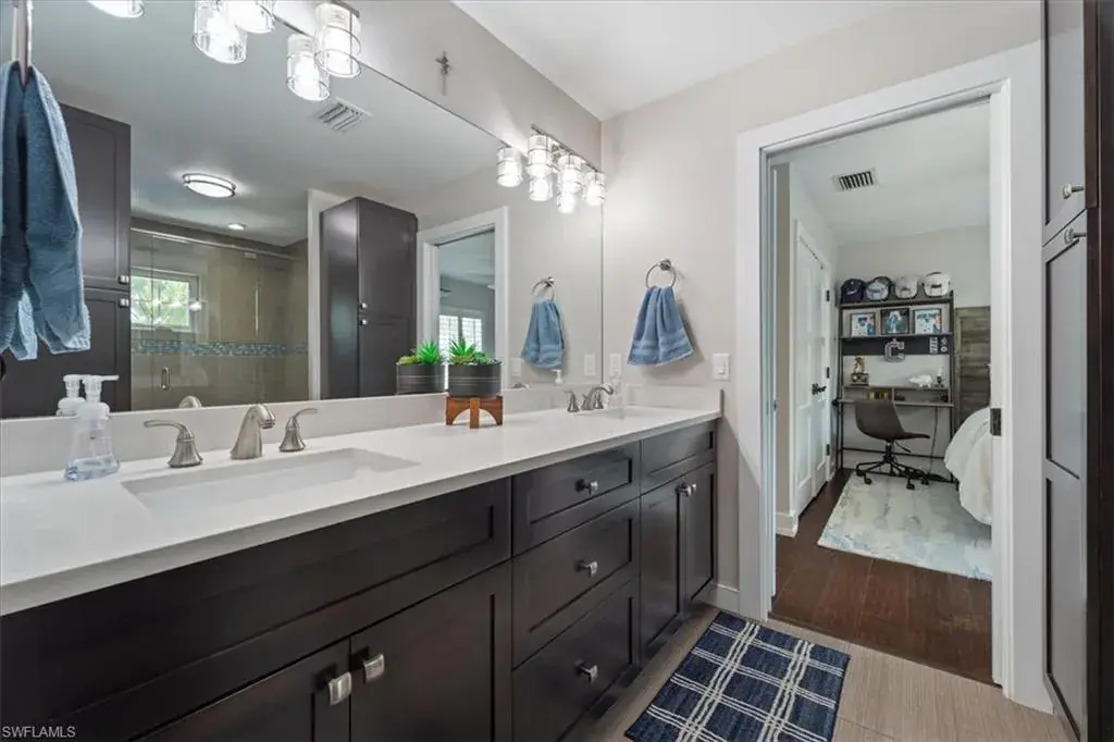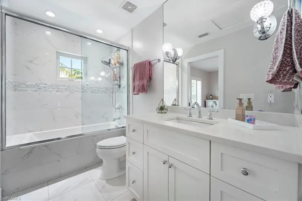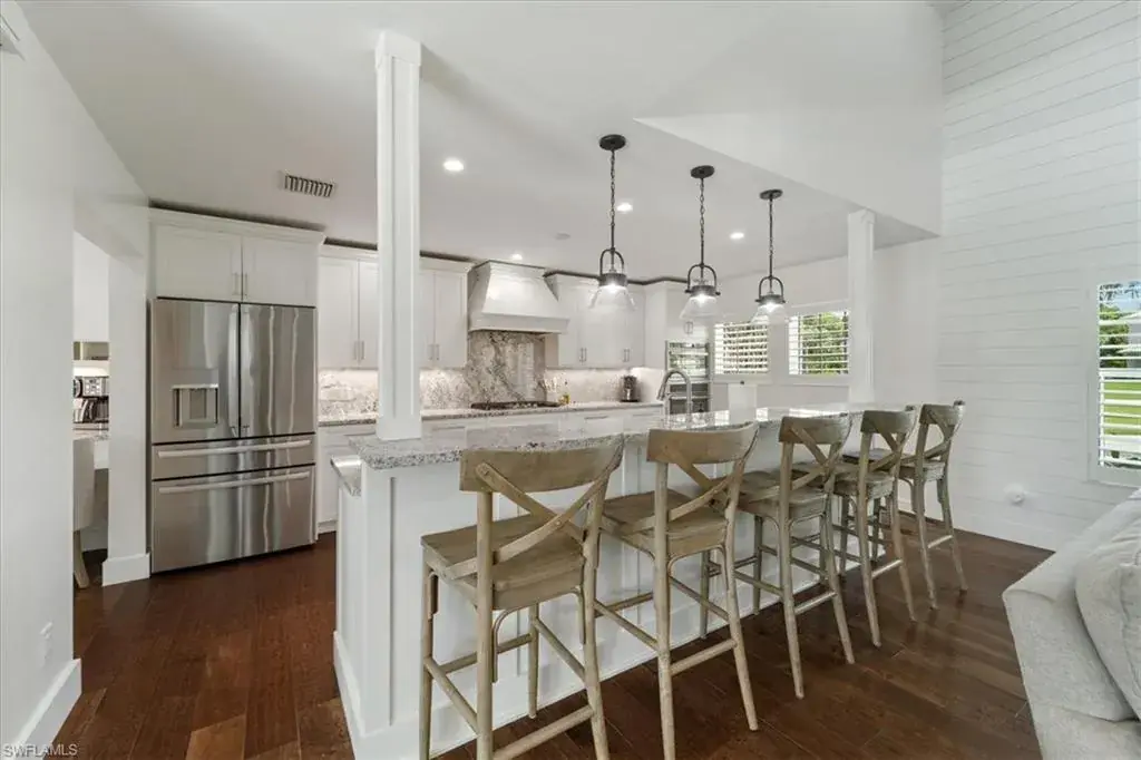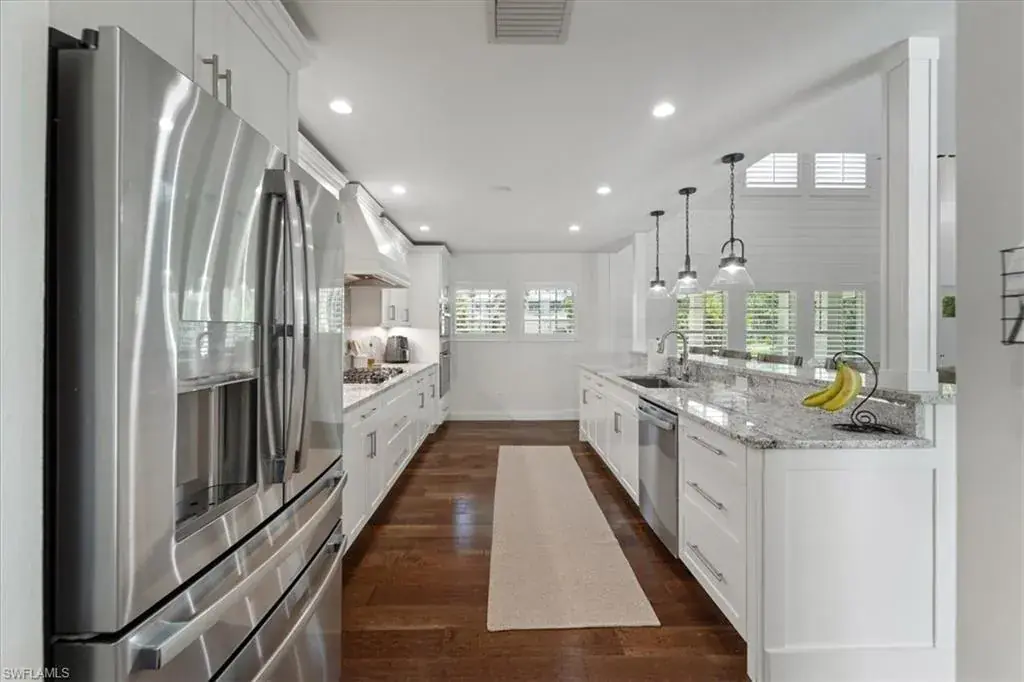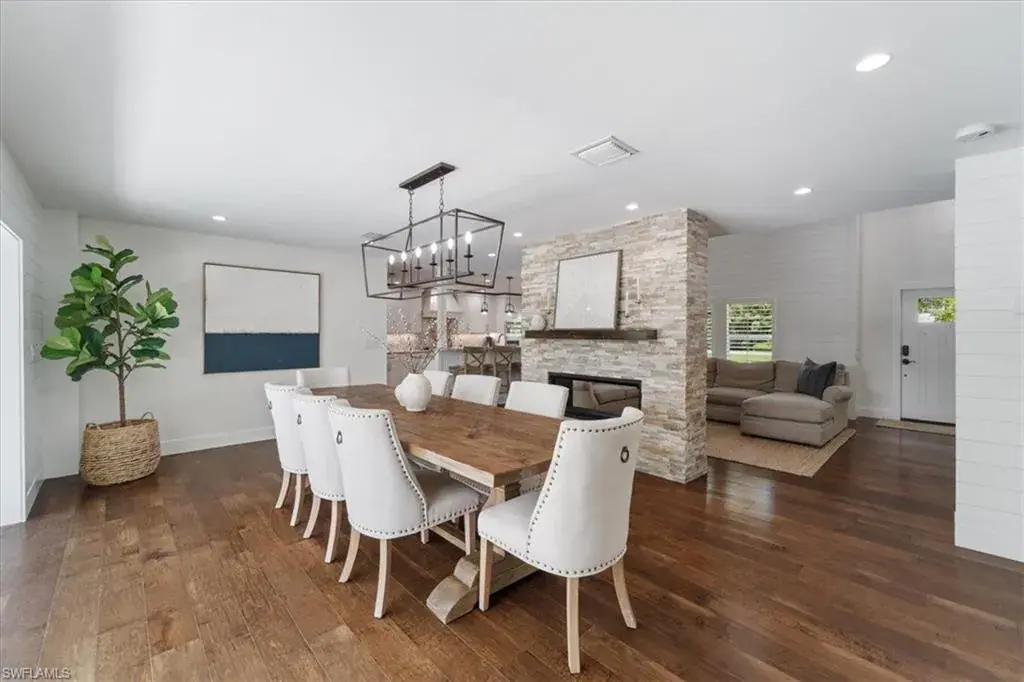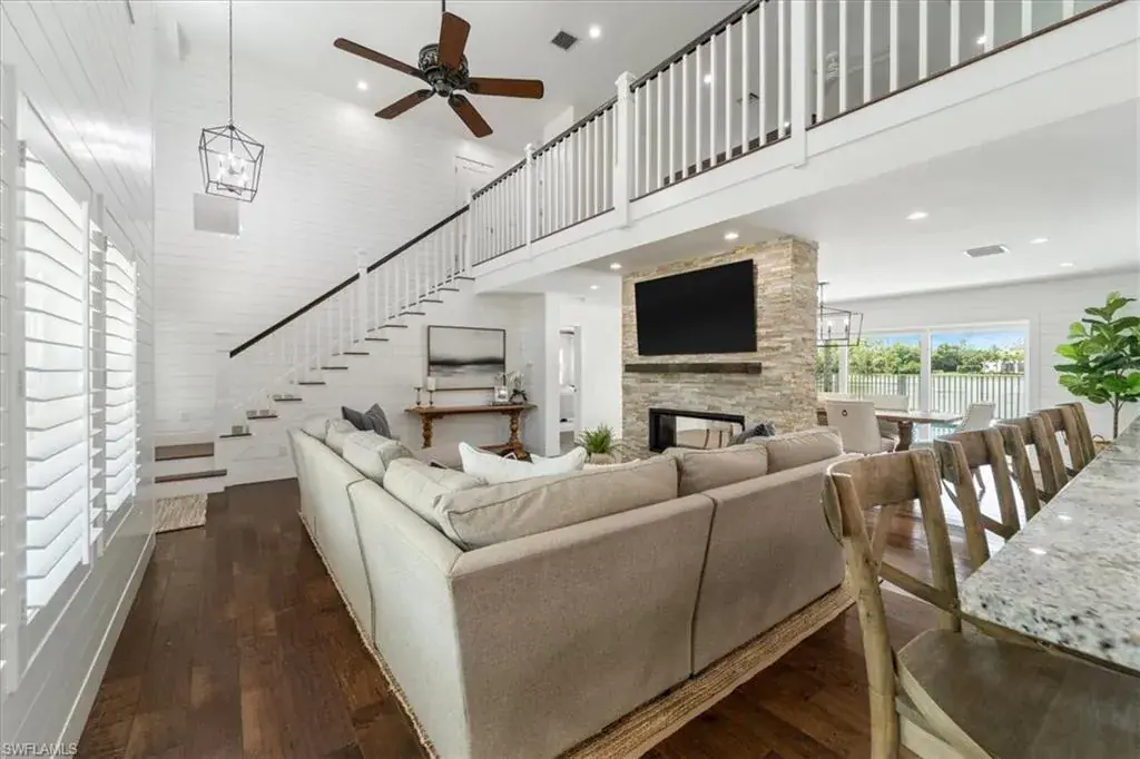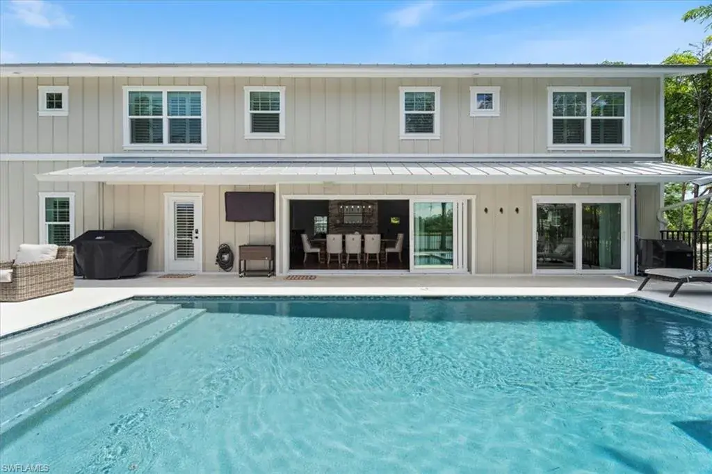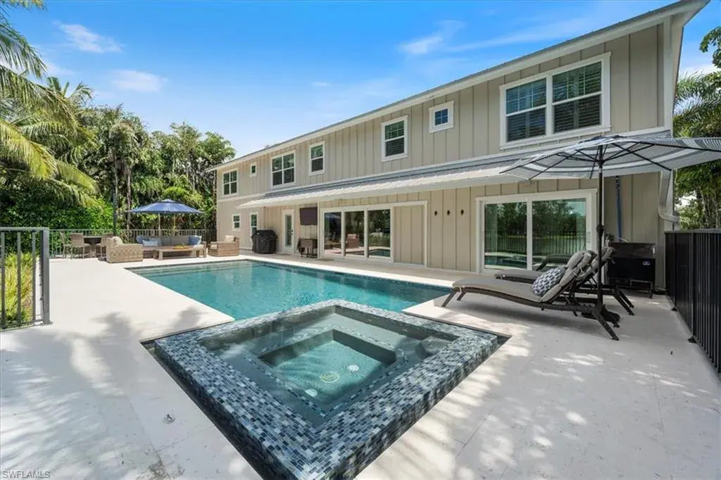 Welcome to 2761 Ardisia Lane, an exquisite lakefront sanctuary nestled in the charming and centrally located neighborhood of Tall Pines, Naples, FL. This stunning 4-bedroom, 3.5-bathroom residence, rebuilt from the ground up in 2014, offers modern luxury and comfort on an oversized private lot. Step inside this custom-designed home and be captivated by its elegant features and thoughtful layout. The living and formal dining room are artfully separated by a custom gas double-sided stone fireplace, creating warmth and ambiance. Your chef’s kitchen is a masterpiece with a gas cooktop, double oven, and gleaming granite countertops, complemented by high-end stainless steel appliances. The main floor boasts a spacious master suite with dual walk-in closets, providing a serene retreat while the adjoining master bath offers luxury and relaxation. A mud room and expansive laundry room add to the home’s functionality and charm. Ascend to the second floor to find a large suite with an en-suite bath, along with two additional bedrooms featuring a Jack and Jill bathroom. The airy game room/loft area invites a space for entertainment. A unique walk-in attic offers an additional 431 square feet of accessible storage space. As you make your way outside, you’ll be delighted with the lakefront view complete with a refreshing pool and a relaxing hot tub. Sit outside on cool nights by your outdoor firepit. Whether you’re hosting a weekend barbecue or enjoying a quiet evening under the stars, this outdoor oasis is sure to be a favorite gathering spot.