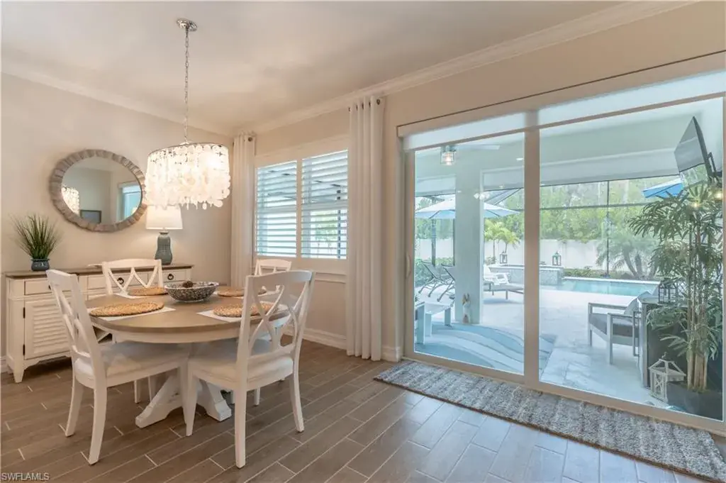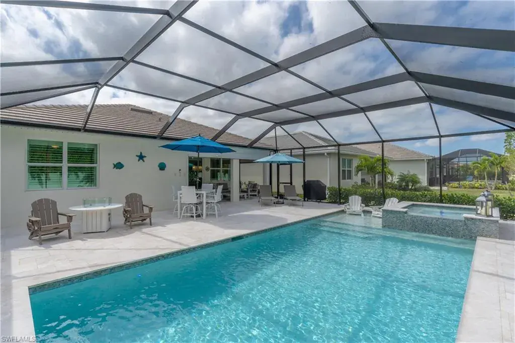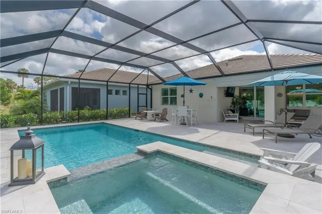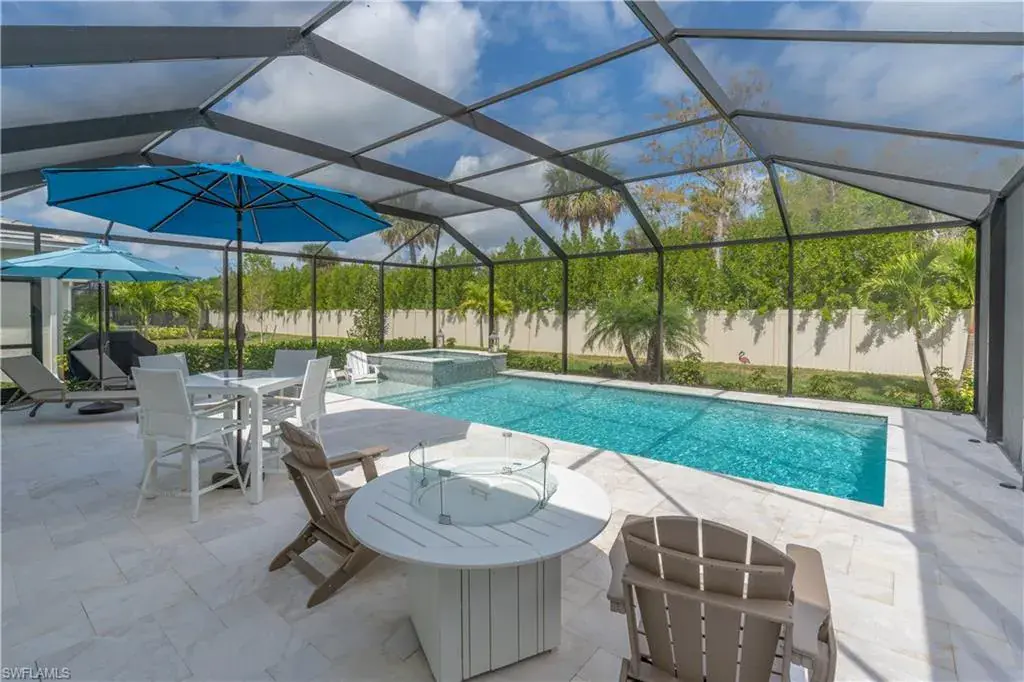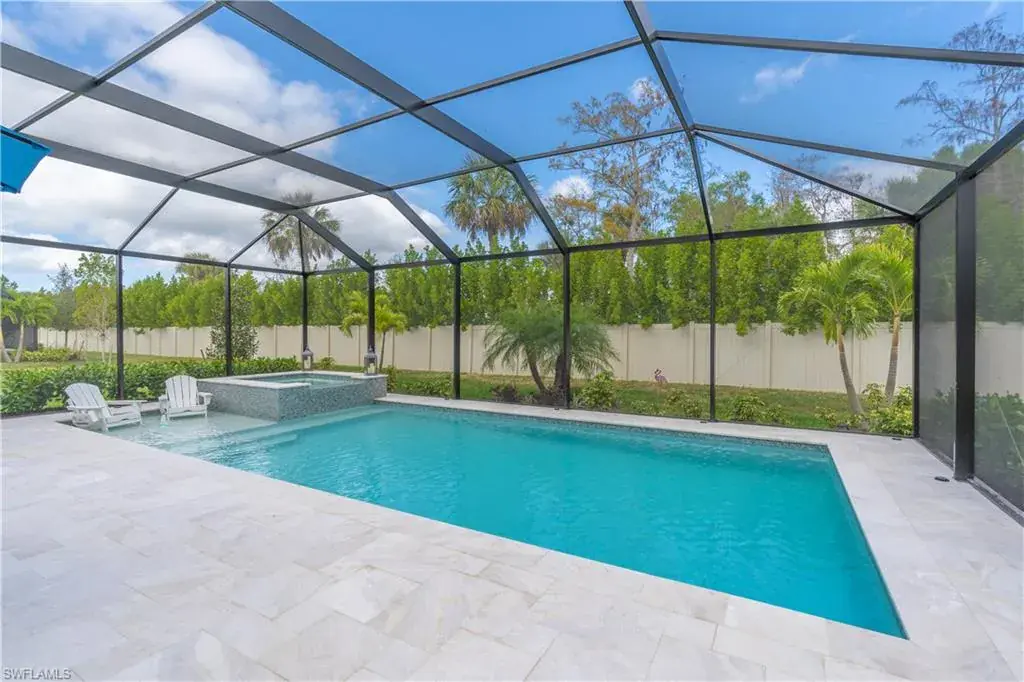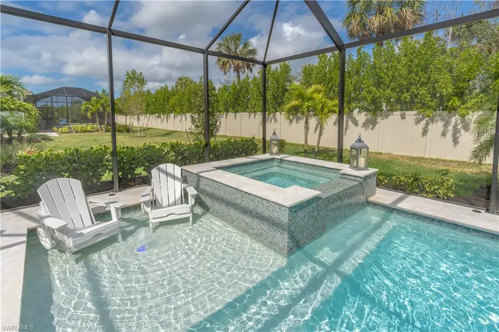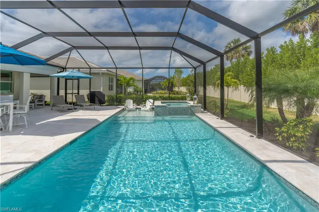 Your outdoor oasis has a French pattern marble tile, covered lanai opening onto an oversized screen enclosed pool deck. Herein lies your custom, saltwater pool with sun shelf, six person spa and waterfall feature.