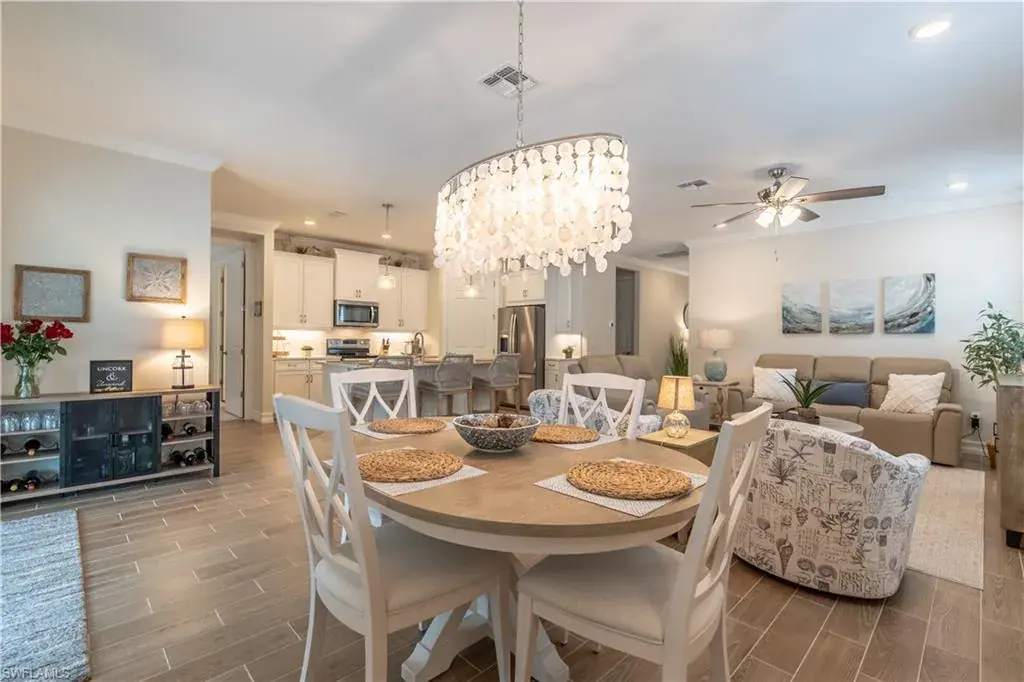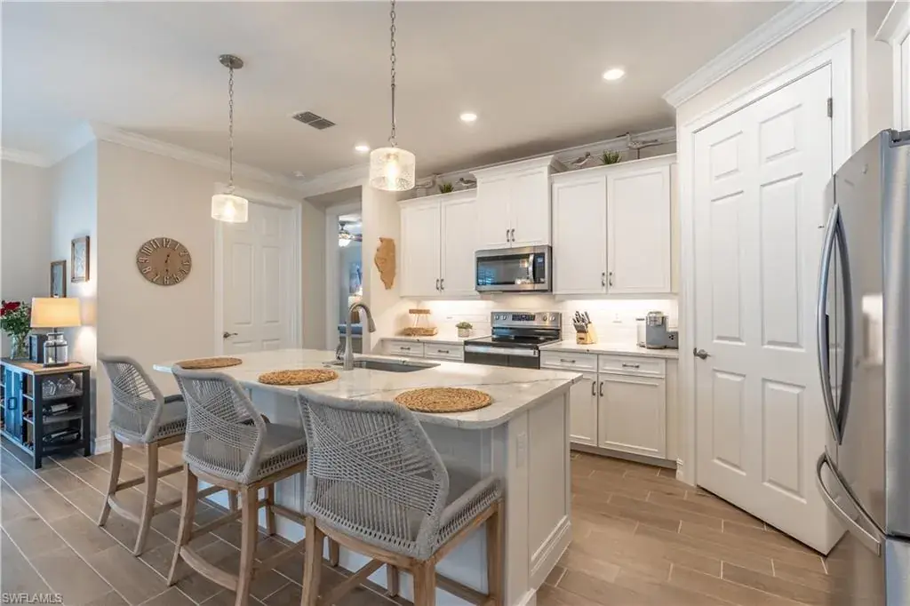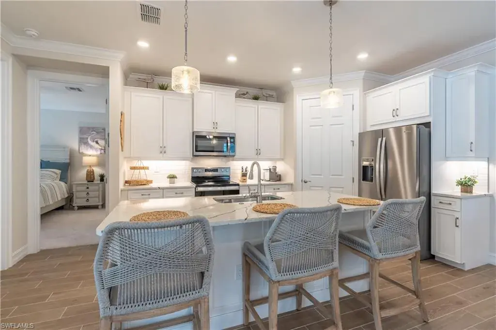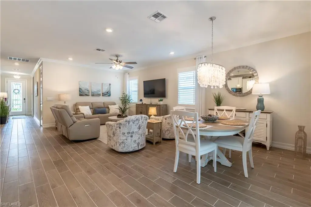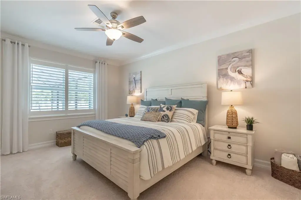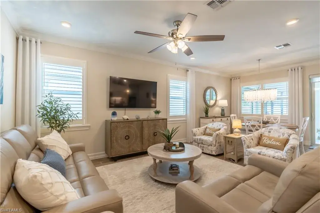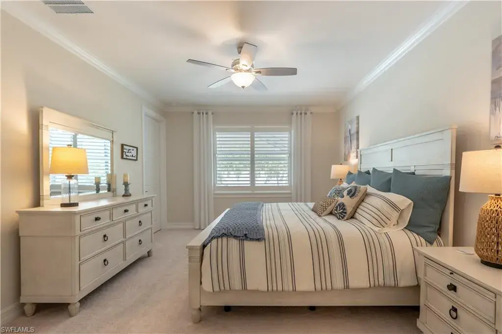 Nine foot ceilings wrapped with crown molding and extra tall interior doors add a lofty atmosphere to the home. Neutral paint shades, tile plank flooring in the main living space and carpeted bedrooms offer multiple decorating options. Both kitchen and baths have soft close cabinetry with pull outs. Custom lighting, fans and plantation shutters are but some of the many upgrades.