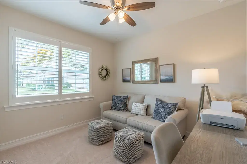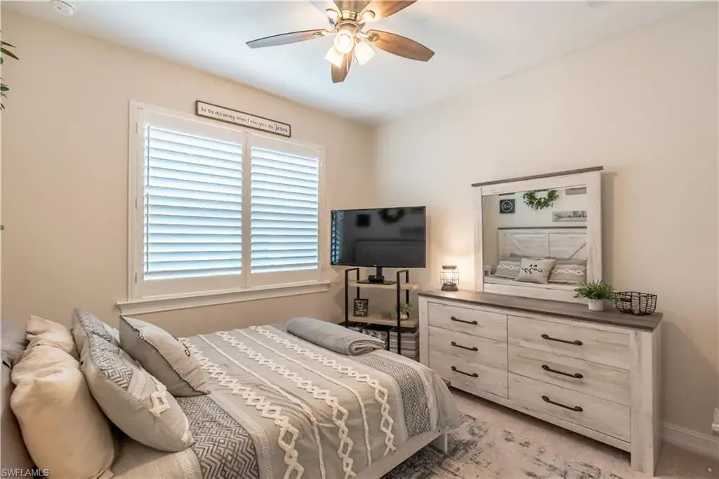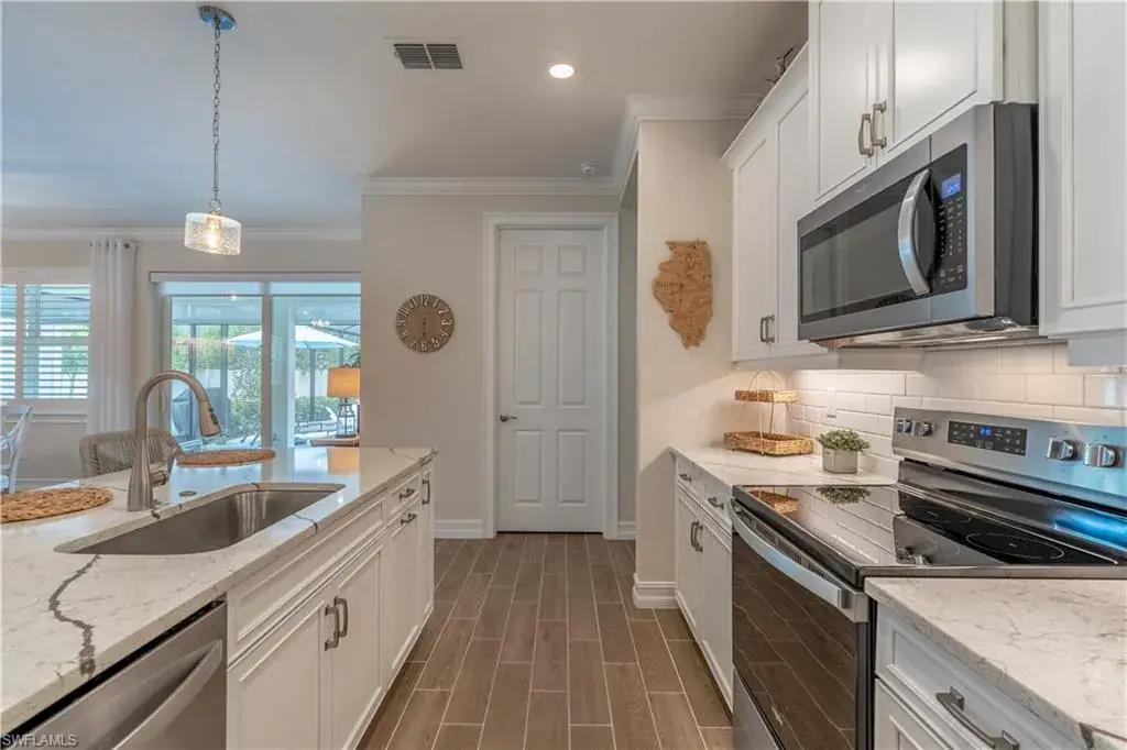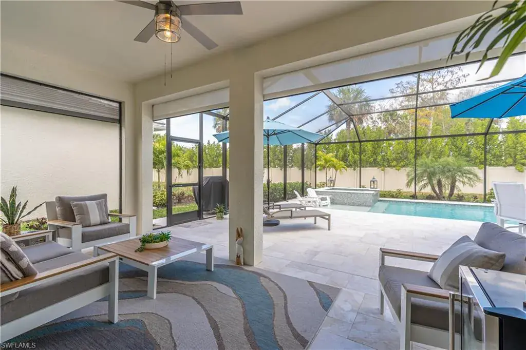 The epoxy floor, two car garage has overhead and wall shelves for plentiful storage. Impact glass windows and door and a power hurricane shade on lanai plus upgraded electric for a generator keep you storm ready. Three RING cameras and Smart Home controls for garage, front door and thermostat keep you connected. Come visit, what can be your Naples retreat.