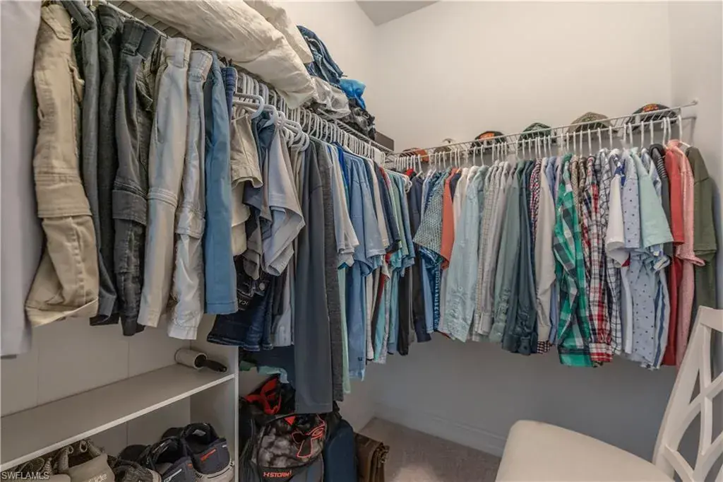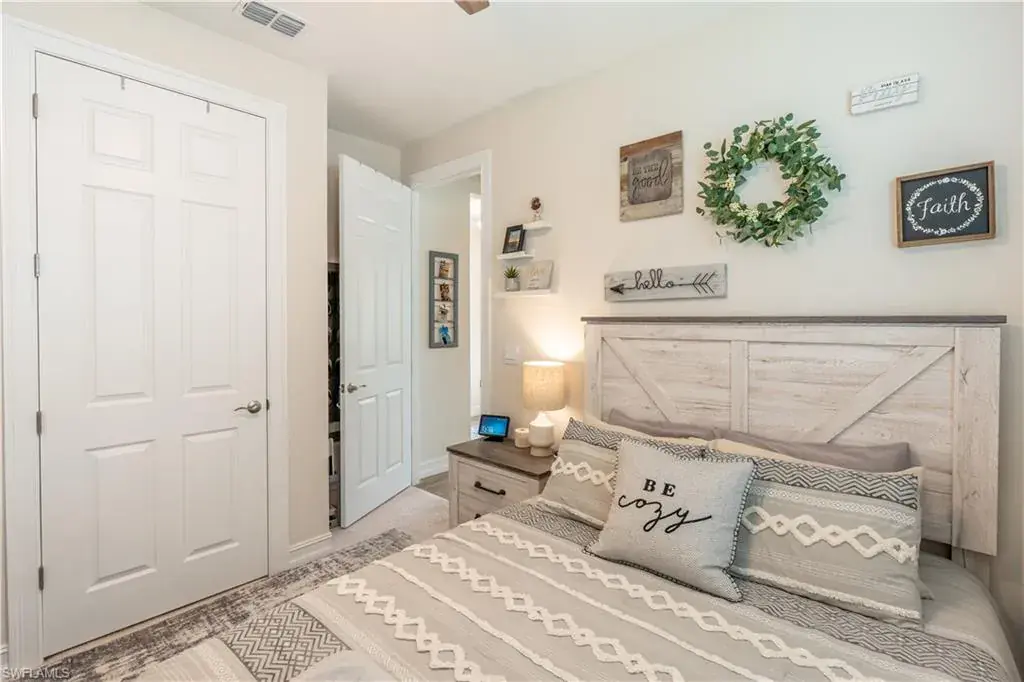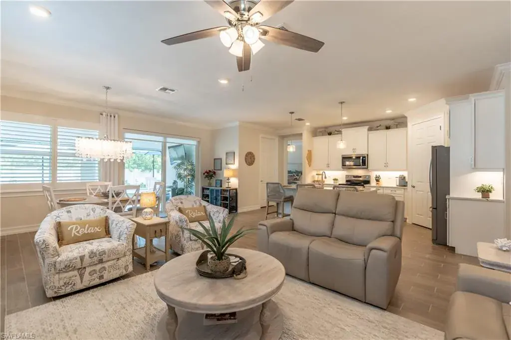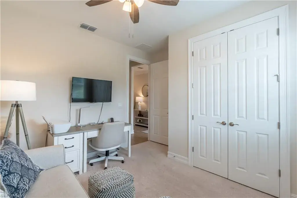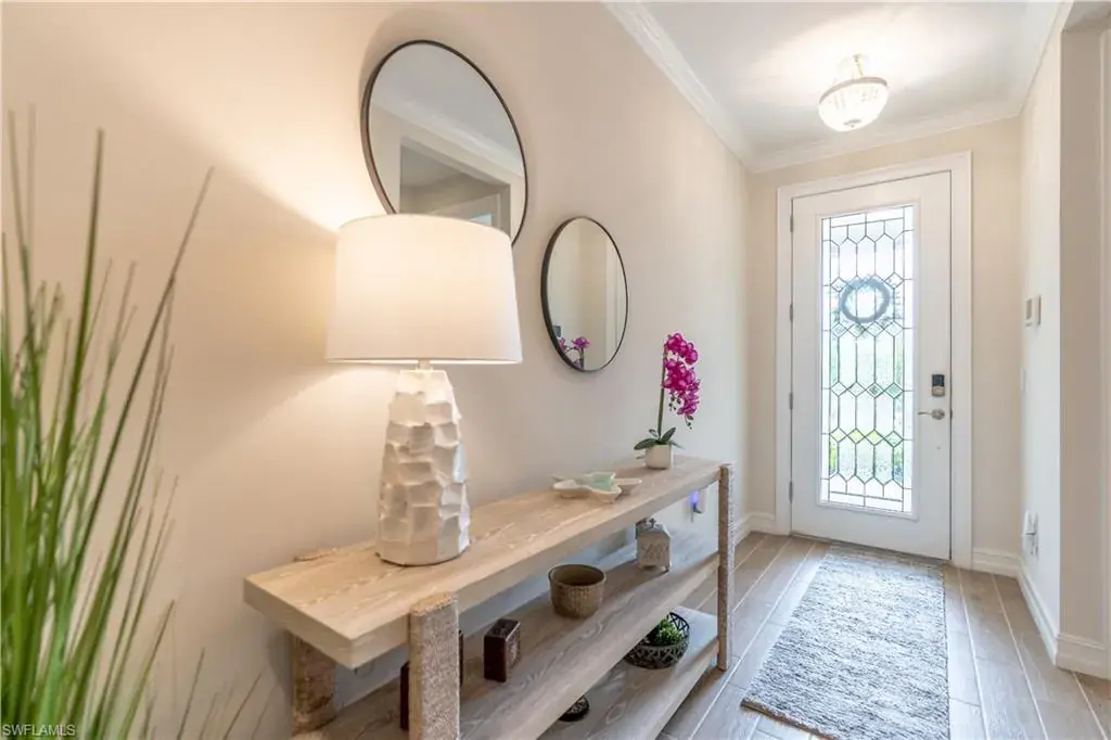 The epoxy floor, two car garage has overhead and wall shelves for plentiful storage. Impact glass windows and door and a power hurricane shade on lanai plus upgraded electric for a generator keep you storm ready. Three RING cameras and Smart Home controls for garage, front door and thermostat keep you connected. Come visit, what can be your Naples retreat.