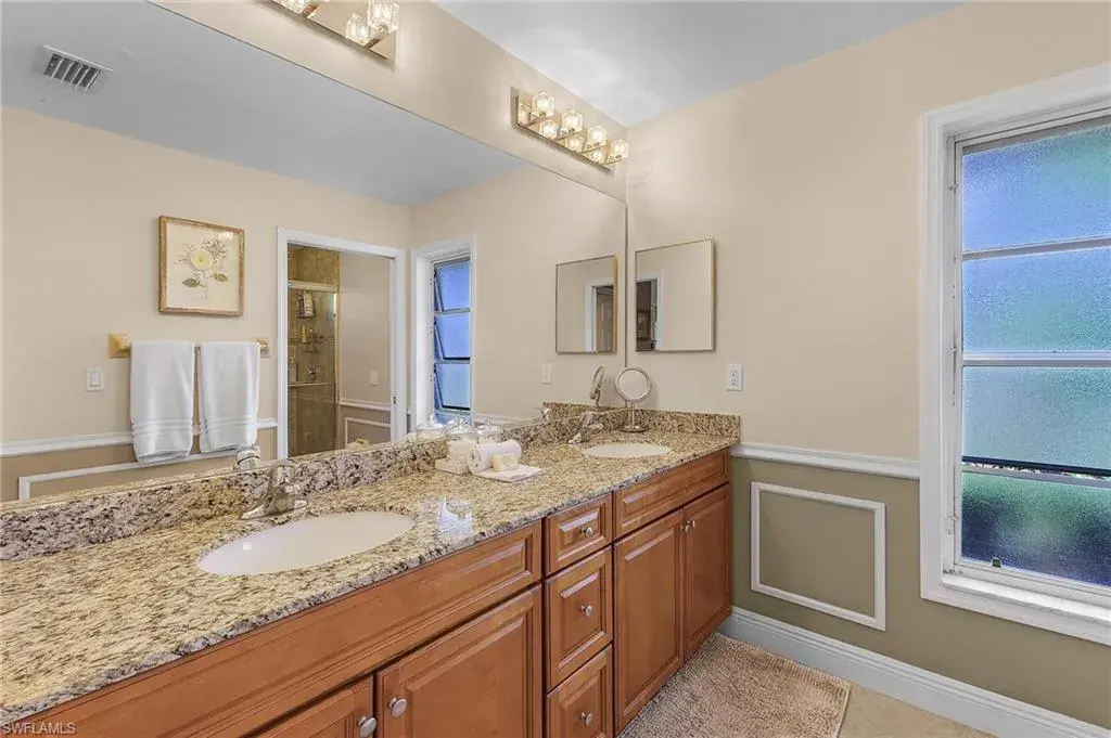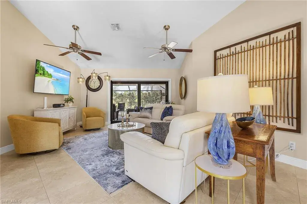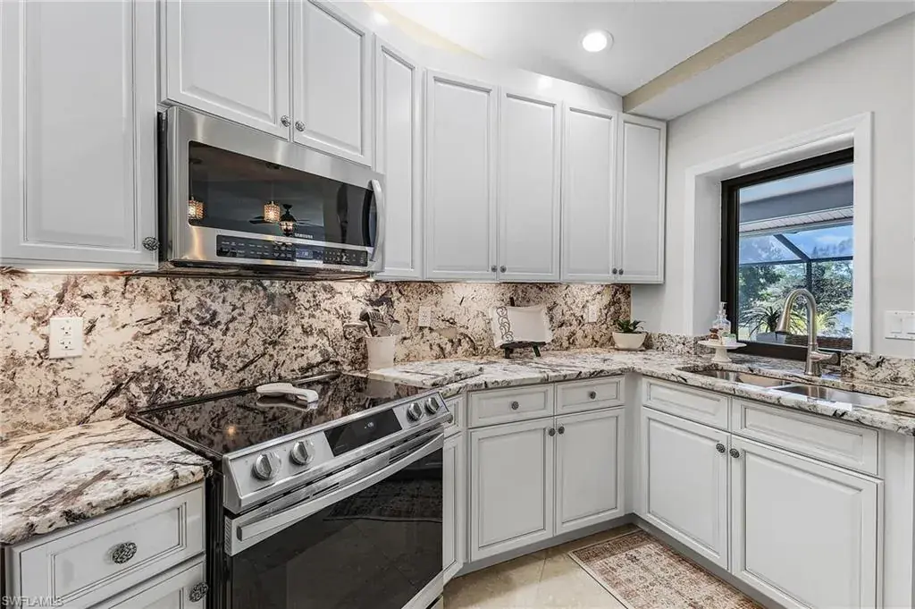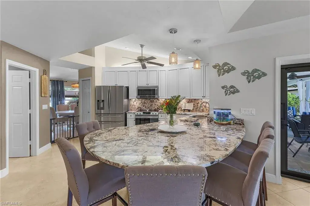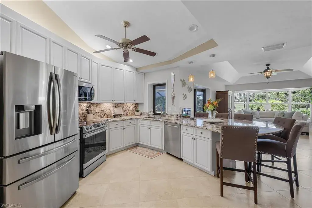 ‘SELLER VERY MOTIVATED” This beautifully renovated single-family home has a great west facing sunset views making this prime property a unique hidden gem. Upon entering, one will encounter a light and bright open concept living and dining area with high ceilings. The gourmet chef’s kitchen includes a large island and breakfast bar, white shaker-style cabinets, quartz Countertops and matching quartz Backsplash as well as all stainless steel appliances. The entire home features beautiful tile flooring, modern baseboards and trim. Additionally, the baths have been fully updated, and the home has been painted with new light and plumbing fixtures installed. The primary bedroom is generously sized, featuring two walk-in closets and sliding doors that lead to the lanai. The guest bedrooms are positioned on the opposite side of the home for privacy. Enjoy your morning coffee or evening cocktails from the expansive screened lanai with pool and spa offering quiet serene tranquility views of the lake and golf course views / preserves that are often visited by deer. The New impact sliders and doors installed in 2024, along with manual shutters for most windows, providing peace of mind. This property is conveniently about six miles from downtown 5th Avenue Naples, offering easy beach access, boating, shopping, dining and more. Don’t miss this wonderful opportunity to start living in paradise today. Items that I have fixed in the house or replaced.