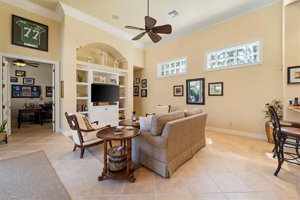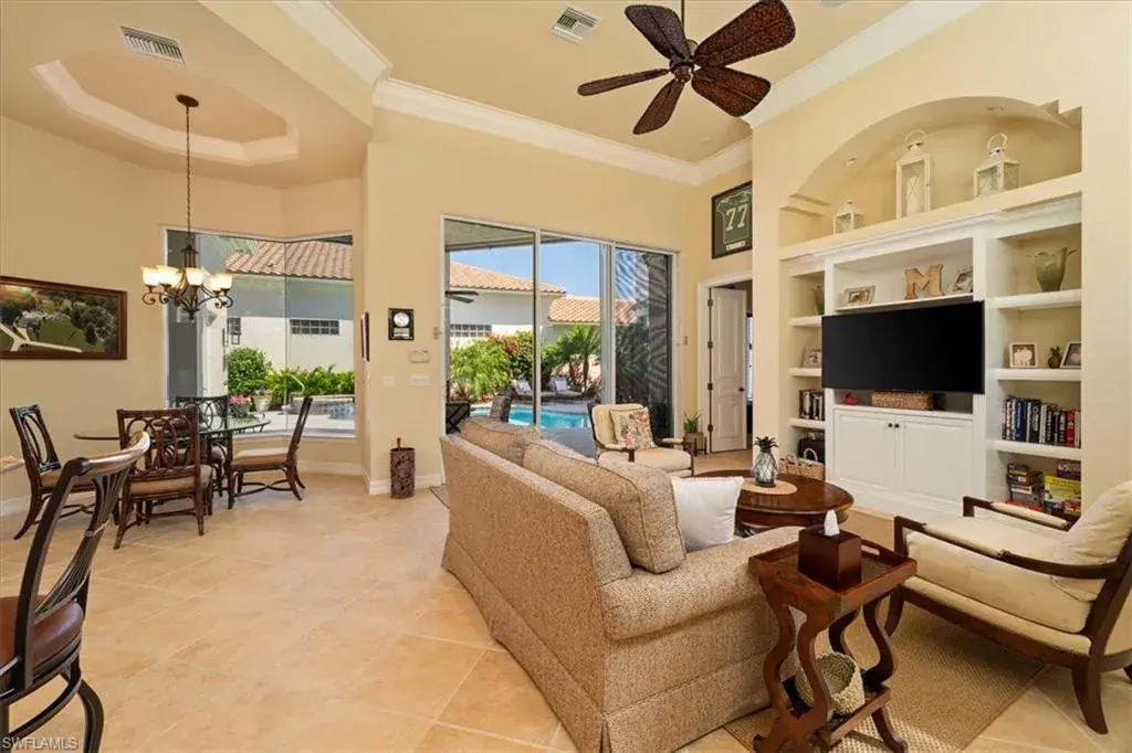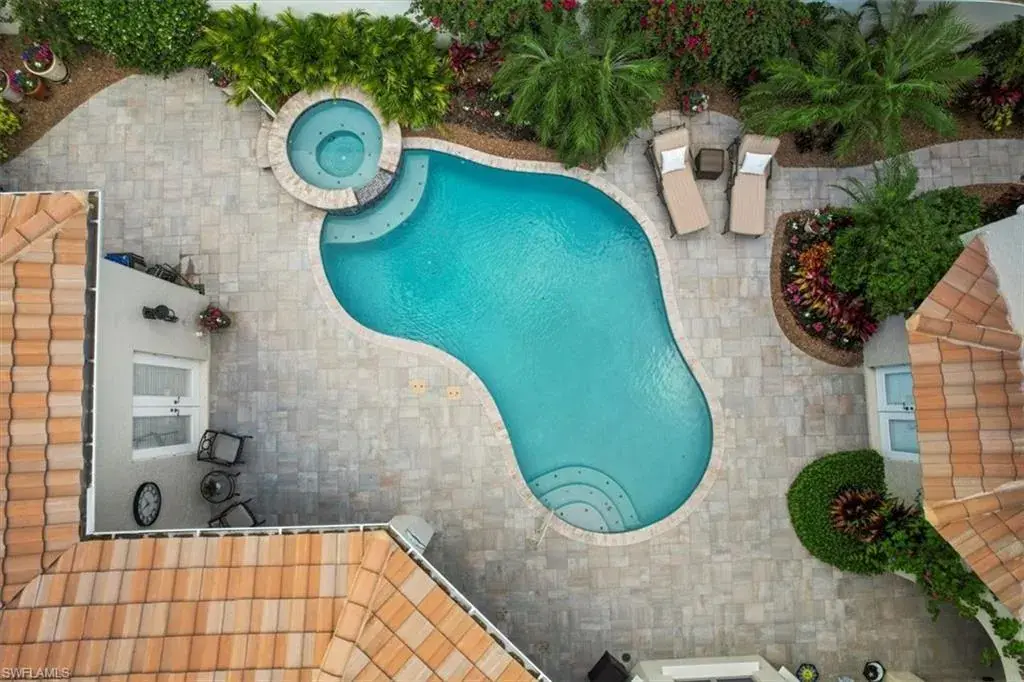 Nestled in the sought-after neighborhood of Terrabella within Pelican Marsh, this exquisite home seamlessly combines sophistication and comfort. Upon arrival, guests are greeted by rustic, arched double doors that lead to a private oasis. Inside, the interior boasts custom built-ins, soaring ceilings and triple-crown moldings. The main house has a master suite downstairs as well as a great office over looking the pool. In addition, a back staircase leads to a loft area upstairs with 2 en suite bedrooms. Additionally, there is a separate guest cabana with a full bath and morning bar provides a secluded retreat for visitors. The home is updated with new roof, impact windows and hurricane screens on the lanai as well as modern conveniences such as a sound system, security camera, lighting, and an expanded brick paver driveway. Stepping outside, the expansive outdoor lanai area beckons with lush landscaping, a pool, and spa, creating a tranquil oasis for relaxation and alfresco dining. This residence effortlessly caters to contemporary living needs, offering a perfect harmony of serenity and accessibility. Conveniently located just a short 25-minute drive from the airport and in close proximity to the beach, shopping, and exceptional dining experiences.