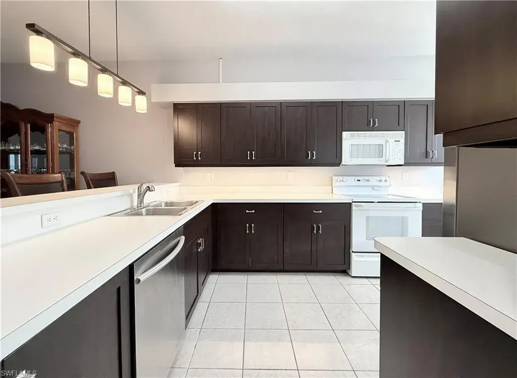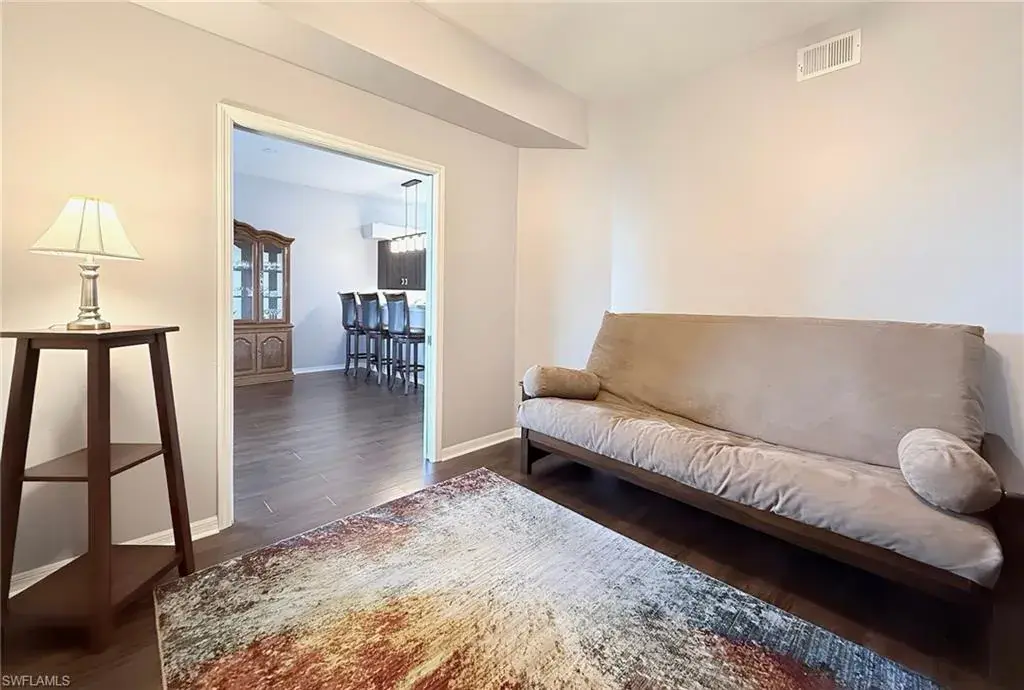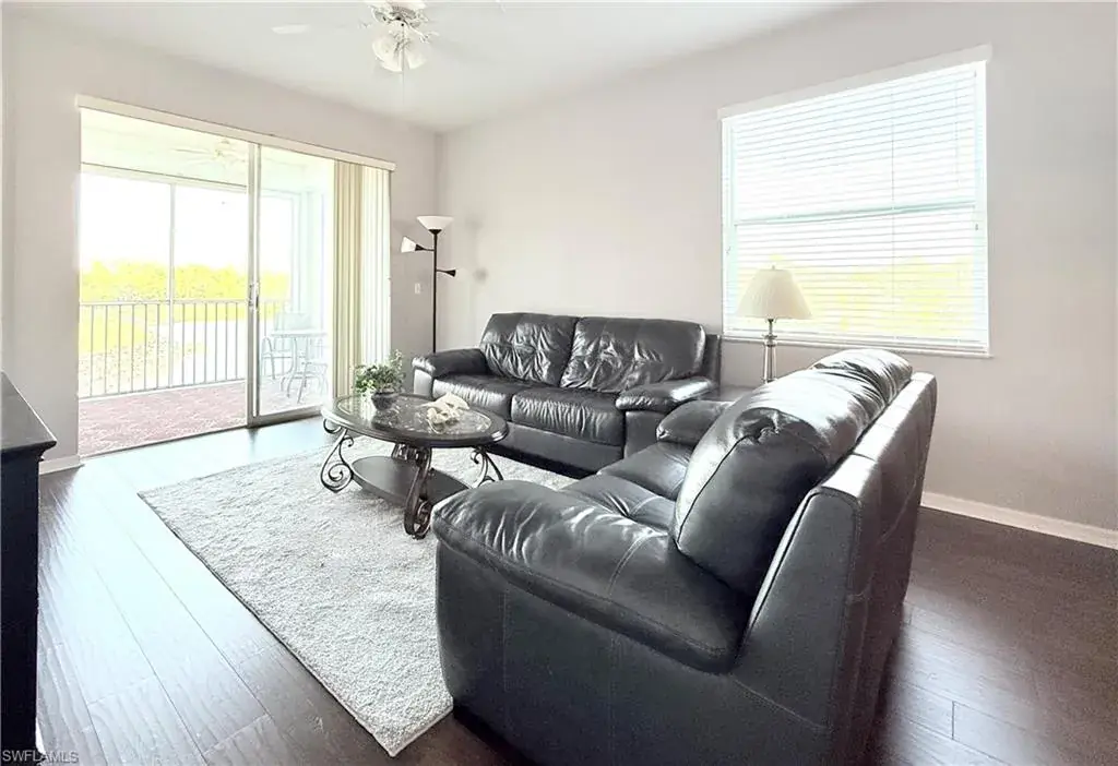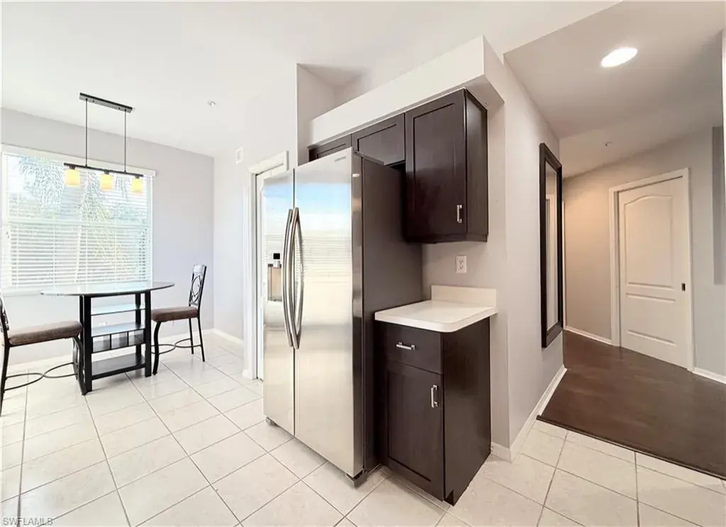 End unit 2 Bedroom + Den Condo – Highly sought after floor plan is now available! Golf Included. 3rd Floor end unit with NO ONE living above!!! Condo being sold turnkey. Building has common elevator. Upon entry you will notice the beautiful laminate plank flooring at entry and in dining room, living room, den and bedrooms. Kitchen and bathrooms have tile floors. Large Kitchen has updated shaker style cabinets, pantry and eat in area. Dining area is open to living room. Extra den is multi purpose room – can also be used as office or 3rd bedroom when needed (closes off with pocket doors for privacy). Spacious primary bedroom- looks out over water, golf and preserve, has 2 walk in closets and is split from guest bedroom for added privacy. Primary bath has walk in shower and linen closet. Guest Bedroom has walk in closet. Guest bath has tub/shower combo. Side windows in kitchen and living room allow for extra natural light. NO noise from above … NO unit directly above. Back lanai has gorgeous view Hole 12 – Par 3. Back lanai is screen in of back and side for open feel. Electric hurricane shutters provide storm protection. A rare, very large common area separates space between buildings providing light and additional privacy. Back exposure allows you to enjoy your back lanai without it getting too much Florida sun. Condo has deeded storage room. Condo is a very short stroll to satellite pool. You will greatly appreciate that this condo is located within walking distance to the clubhouse!! Naples Heritage is a beautifully landscaped, gated, bundled golf community. Enjoy the NH lifestyle- 18 hole golf course, putting green, driving range, renovated clubhouse w/pro shop, resort style pool, tennis courts, pickleball courts, bocce, fitness center, poolside cabana & bar. Just minutes from downtown 5th Ave & beaches. More than a home its a Lifestyle!!
