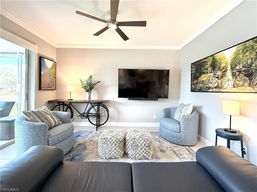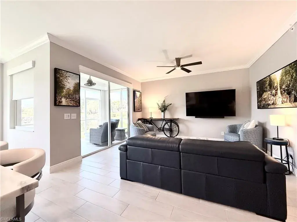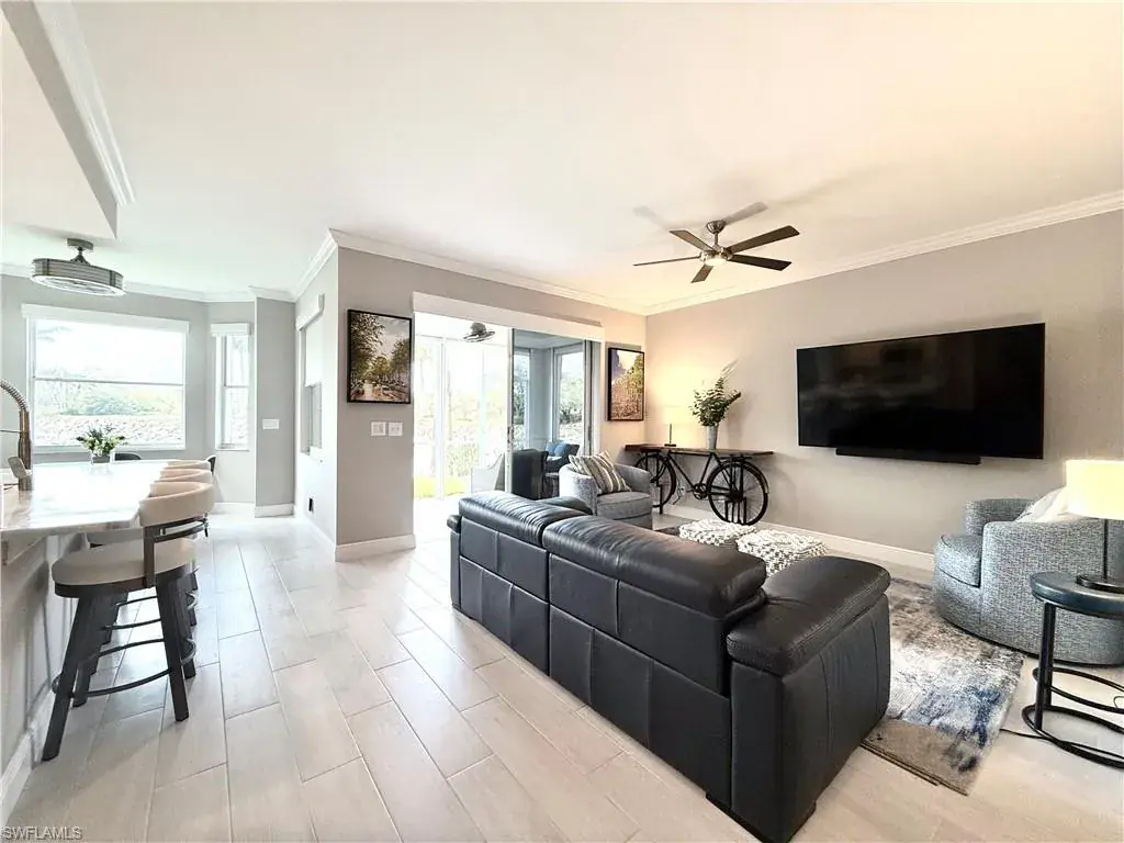 With construction costs for renovations going up this TOTALLY renovated condo is an incredible value. Located in Naples Heritage Golf and Country Club with Golf Membership included. Sellers thought of everything when they remodeled. Brookside floor plan is open concept and allows you can see water and golf from living room, kitchen and dining room. Porcelain tile plank floors throughout condo. New custom lighting and fans throughout. Condo is equipped with a FULL home water filtration system. New hot water heater. Kitchen boasts white shaker cabinetry, light granite counter tops with matching granite backsplash, large sink with work station/new fixture, new higher end SS appliances, new wine refrigerator and hidden shades on windows. Twist glass kitchen table easily extends out for 6. Flex space is set up as dining room and includes built in buffet with granite countertop along wall. Main living room has electric privacy shade across back. Furnishings and TV’s throughout condo are new. LR has leather Natuzzi electric couch that reclines independently on both sides. Primary Bedroom with plantation shutters and custom walk in closet (closet has built in safe). Primary bath has update Vanity with quartz countertop, new walk in shower with custom tile, stain proof glass and frameless door. Guest Bedroom with plantation shutters and custom closet. Guest bath has new vanity with quartz countertop, high end mirror with built in medicine cabinet, and new walk in shower with custom tile and stain proof glass. Frosted glass Barn door in guest bath for privacy. Custom Laundry room has newer washer and dryer. New Lanai frame and screens recently installed on back lanai. Electric hurricane protection on windows and back screened lanai. Beautiful view of lake and golf course from back – sunsets are priceless!!!