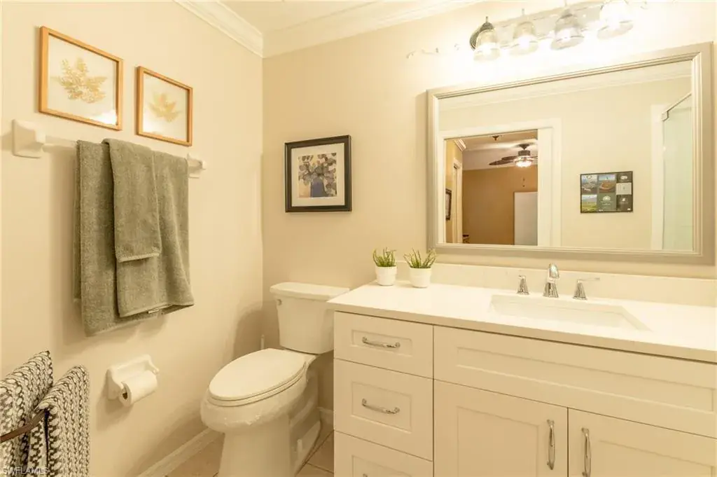 Enjoy breathtaking lake and golf course views right from your private screened lanai. The updated kitchen features granite countertops, stainless steel appliances, and modern cabinetry. Both bathrooms have been tastefully upgraded with new cabinets, new lighting, and quartz countertops. Additional highlights include crown molding and tile flooring throughout, and stylish lighting and ceiling fans. Electric Smart Storm Screens on the lanai and manual shutters on the remaining windows for full storm protection.