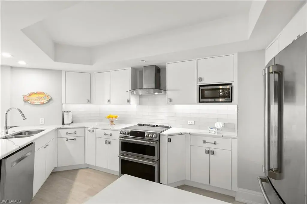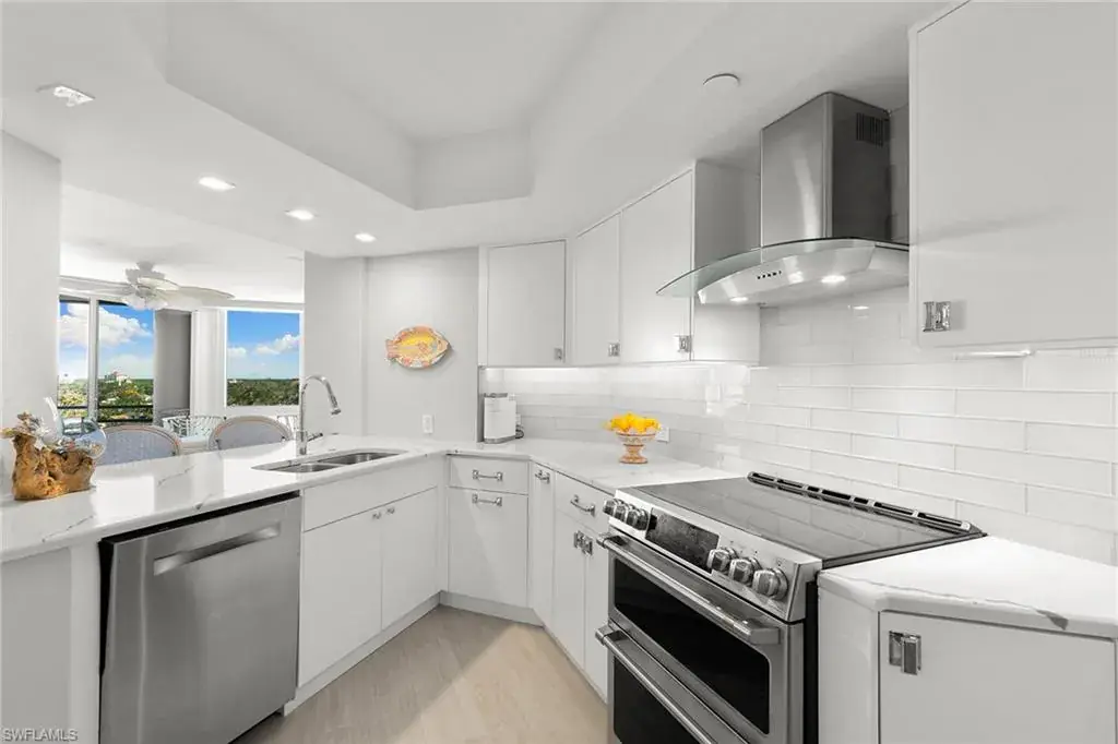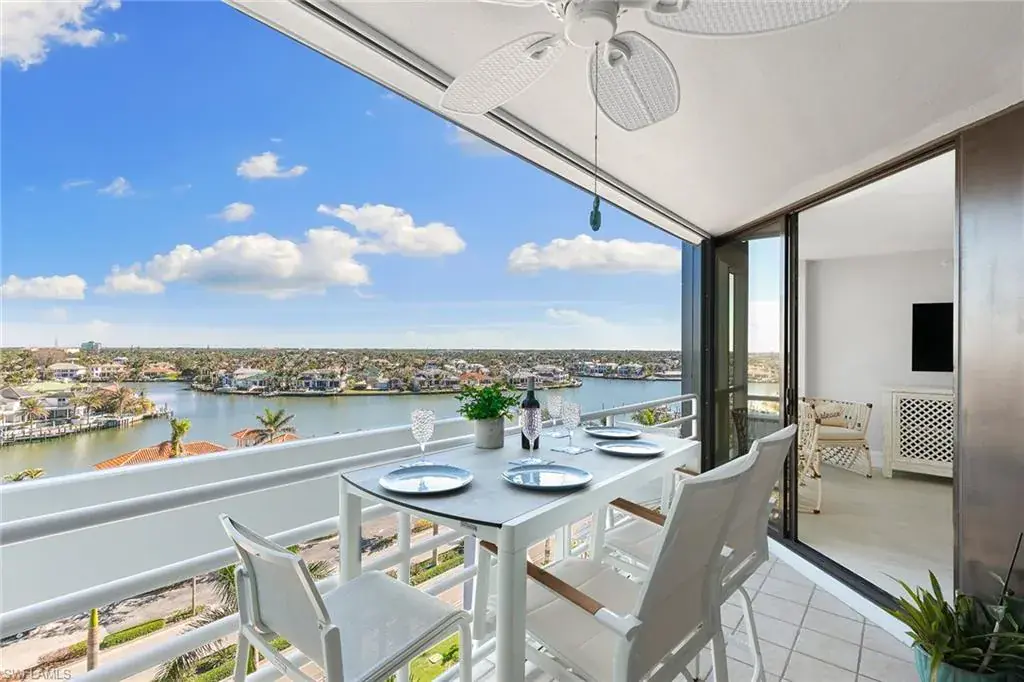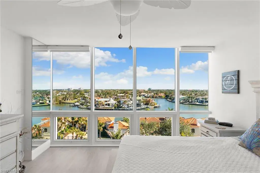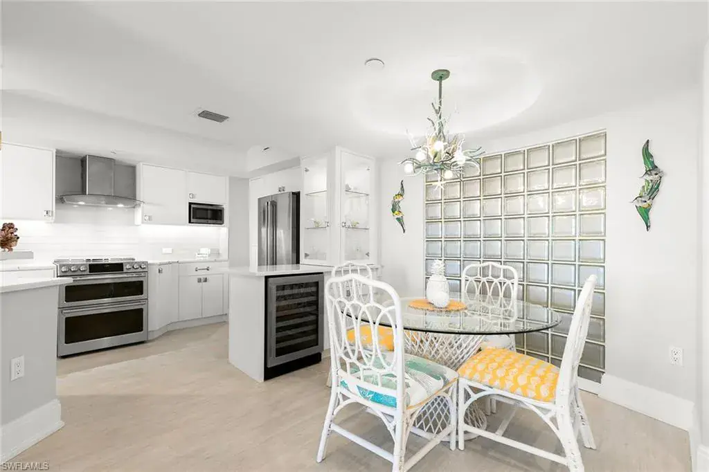 Priced $130,000 below appraisal 5/5/2023. Beautiful coastal-contemporary condominium offers scenic bay and night light views through floor-to-ceiling windows from this beachfront building. The improved open kitchen with quartz countertops, white custom cabinets, light blue glass tile and a built-in wine bar is the perfect size for entertaining. Peaceful sunrises are enjoyed from the primary and guest rooms which have electric shades. The professionally designed primary bath offers a double-head shower with 40×40 white slabs, dual sinks, custom designed closet with built-ins and over-sink back-lit mirror. There is even extra storage in an air-conditioned room. Sunsets can be enjoyed from the beach or the Terraces raised pool deck that features a large pool, hot tub, fire pit and grills. Amenities include a fitness center, social room and three guest suites, car wash, catering kitchen, rack for kayaks and paddleboards, bike and beach chair storage. The Terraces is pet friendly, and minutes from shopping and restaurants at The Village Shops as well as The Waterside Shops. Enjoy the water from a pontoon boat rental just down the street at Park Shore Marina to round out your tropical Naples lifestyle.