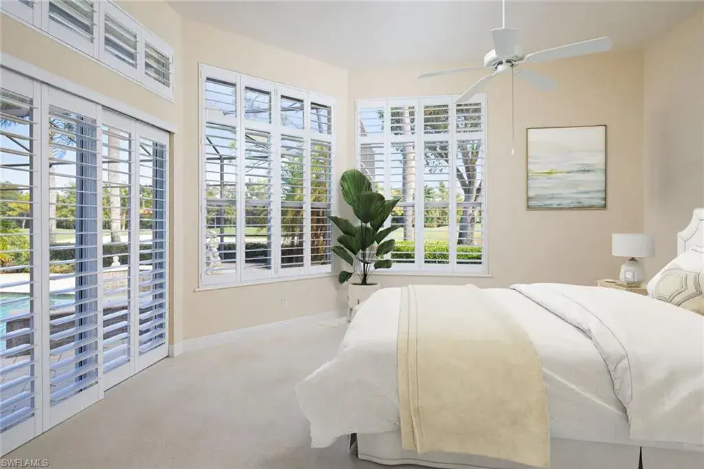 Scenic golf course and lake setting with no homes in view from this spacious 2,800-square-foot home offering three bedrooms, private study and three full baths. Features include soaring 12-14-foot ceilings, 9-foot sliders, solid core wood 8-foot doors, gas fireplace, plantation shutters, hurricane shutters and new roof in 2021. Enjoy having your golf cart for easy access from the oversize garage with a dedicated separate golf cart garage entrance. The lanai has deep covered area with 12-foot ceilings and large uncovered area for taking in the sun poolside from oversized pool with sun shelf and waterfalls. Spacious main suite with golf views and two walk-in closets. Open kitchen to the family room is ideal for gathering area with center island, gas cooktop, walk-in pantry and ample cabinet space. Photography includes virtually rendered furnishings. Olde Cypress is a sought-after active Country Club community with no condominiums where you can enjoy a warm, welcoming atmosphere, a lively year-round calendar of events, championship golf, tennis, pickleball and a state-of-the-art fitness center.
