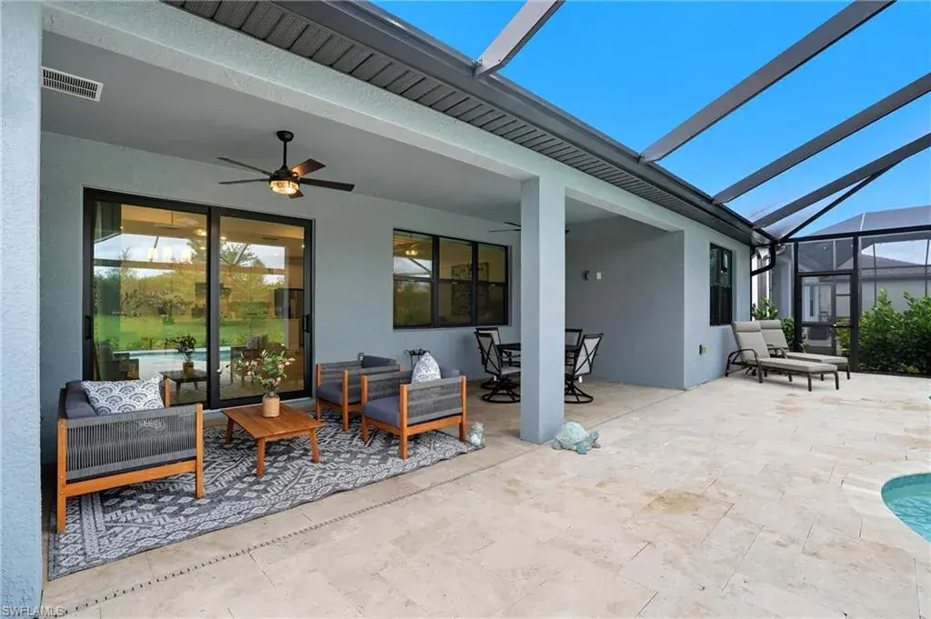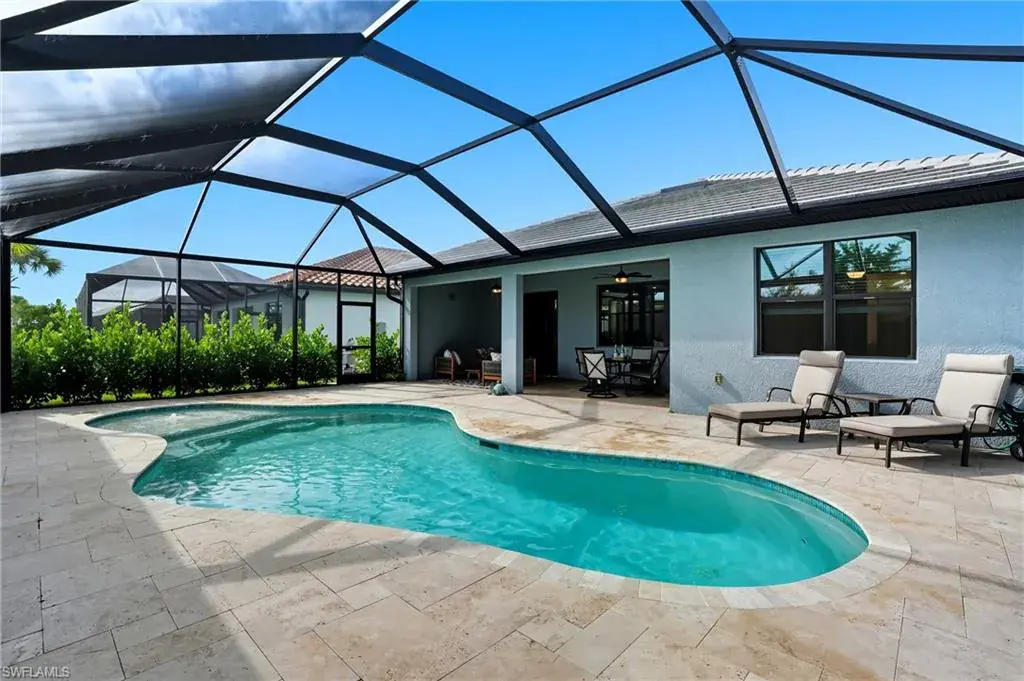 Welcome to your dream home at 1778 Terreno Boulevard, Naples, Florida! This modern and stylish 3-bedroom, 2-bathroom residence offers a spacious 1,943 square feet of living area designed for comfort and convenience. Step into a world of luxury, with upgrades that include sophisticated window coverings, a hanging garage storage shelf, and a smart home system for modern living. The custom-built pool is a showstopper, featuring travertine surrounds and a panoramic screen that keeps the bugs at bay with double no-see-um screening. Enjoy the privacy of your extended patio and landscaped yard without the worry of peering into a neighbor’s home. Inside, you’ll find custom closets throughout and beautiful tile replacing carpets in every room. The kitchen dazzles with pendant lighting and upgraded plumbing fixtures, setting the stage for culinary adventures. Fans are thoughtfully placed throughout the home, complemented by a dining room fixture that adds elegance to your meals. Practical yet stylish, this home includes French drains in both the front and rear, impact windows for peace of mind, and an epoxy garage floor that pairs perfectly with the hanging storage. Plus, it’s plumbed and ready for an outdoor kitchen, making it perfect for entertaining guests. The community amenities are second to none, with a below-ground pool, club house, tennis court, and much more to explore. With its northeastern exposure, this home promises plenty of natural light. Discover a haven where modern amenities meet relaxed, stylish living.