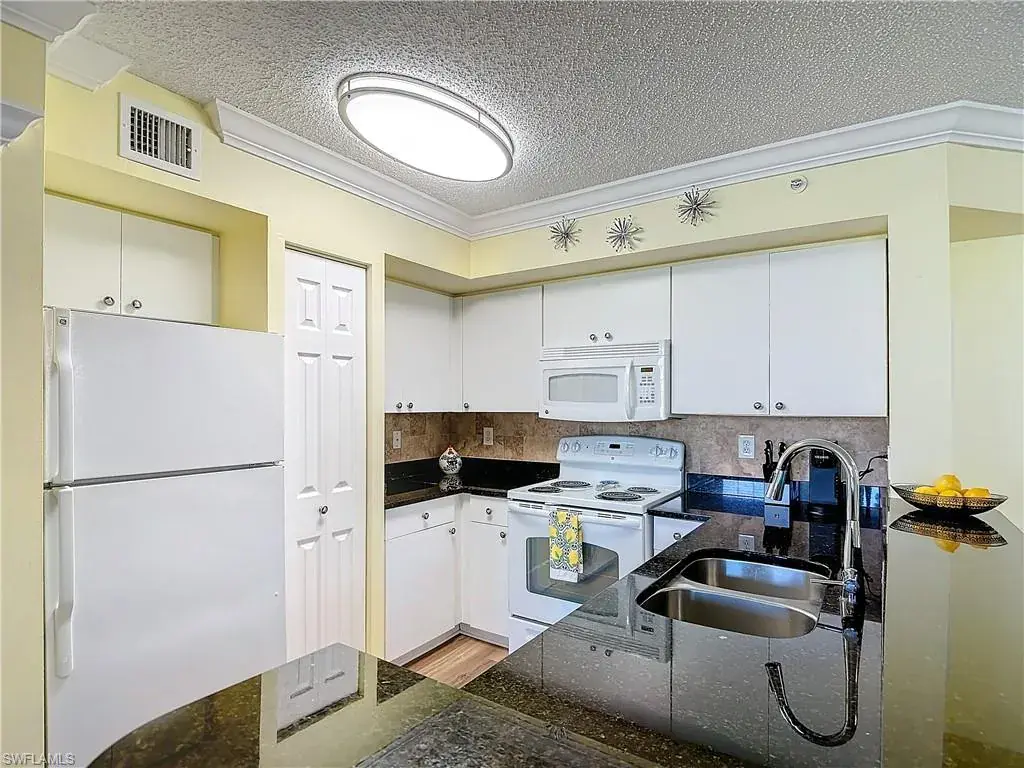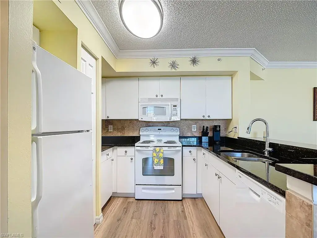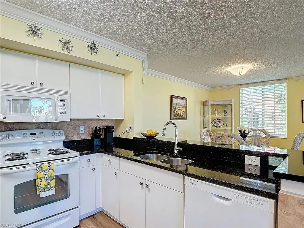 The Enclave at Naples offers a a location close to shopping, restaurants and Naples finest beaches. You will love this updated 1st floor residence with new wood look vinyl flooring throughout. Granite counters in kitchen with a breakfast bar for great conversations. Crown molding, impact resistant sliders, HVAC installed 2022. Turnkey furnished with all the accessories needed for a carefree Florida experience. Serene and tranquil view of the lake and water feature from the lanai and bedrooms. Terrific location in the community with just a “flip flop” walk to the