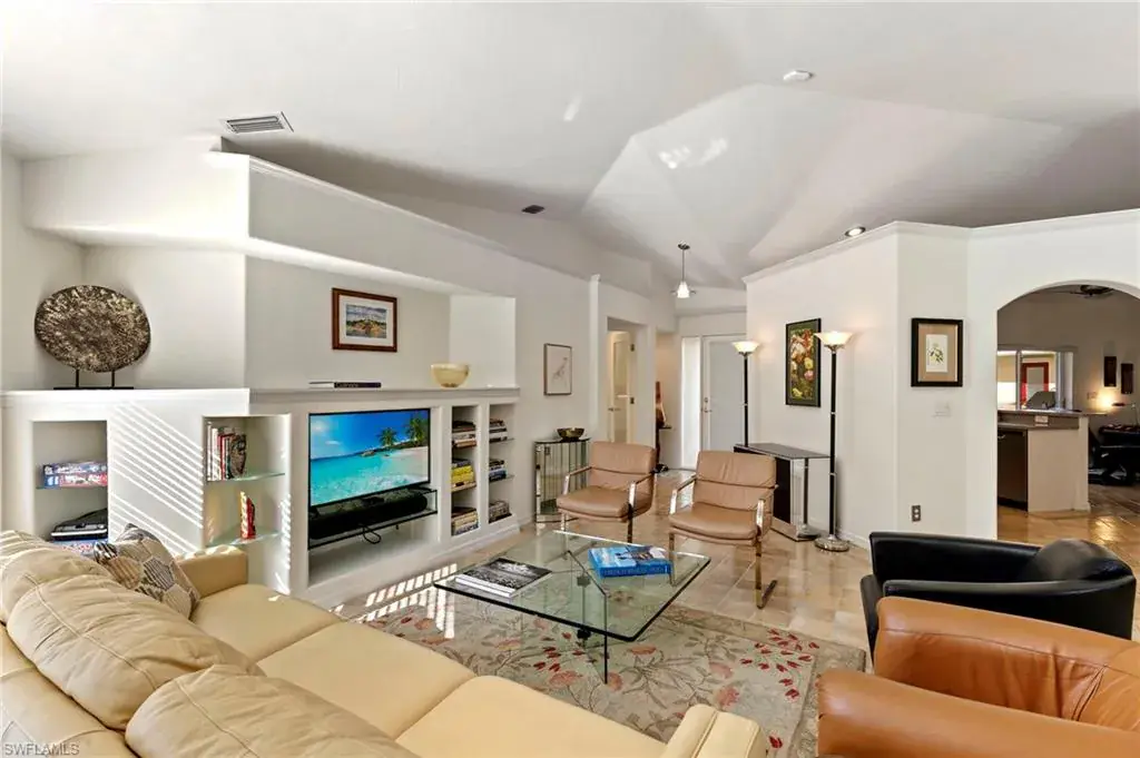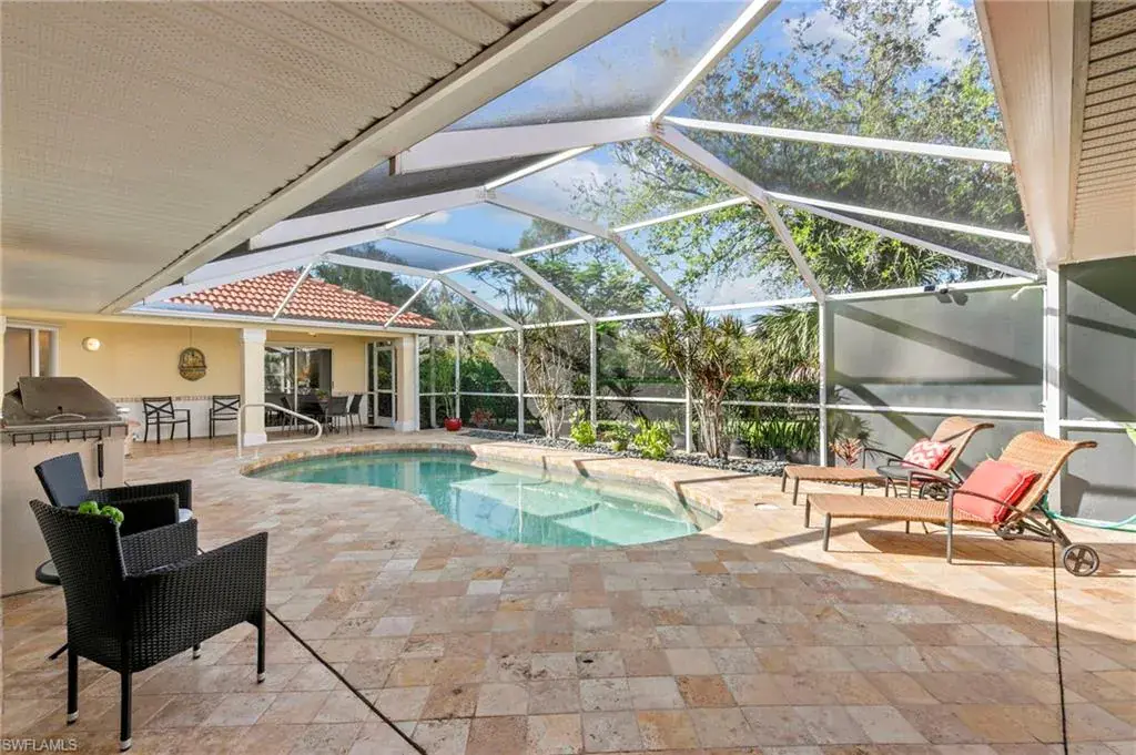Welcome to your own piece of paradise in the heart of Southwest Florida! Nestled on an oversized corner lot with serene preserve views, this 3-bed + den, 3-bath courtyard-style home offers a perfect blend of elegance, privacy, and functionality. From the moment you arrive, the Mediterranean-inspired tile flooring and volume vaulted ceilings invite you to step into a space that feels like home. The heart of this property is the private screened courtyard—a tranquil retreat featuring a sparkling pool and a covered seating area perfect for al fresco dining or unwinding with a good book. Adding to the allure is the rare private mother-in-law suite, complete with its own bedroom, bathroom, and separate entrance, offering unparalleled versatility for guests or extended family. Inside, the thoughtful design continues. The bonus family room showcases a custom built-in entertainment center, while the naturally lit kitchen boasts newer stainless steel appliances, stone countertops, under-cabinet lighting, and a pantry. Every detail, from the solar panels to the 2-car attached garage, speaks to modern convenience and efficiency. As part of the prestigious Sterling Oaks community, you’ll enjoy resort-style amenities including a pool and spa, cabanas, clubhouse, on-site dining, a fitness center, and courts for tennis, pickleball, and bocce. And when you’re ready to explore, you’re just minutes away from beaches, shopping, dining, and quick access to I-75. Don’t miss the chance to experience this one-of-a-kind oasis!