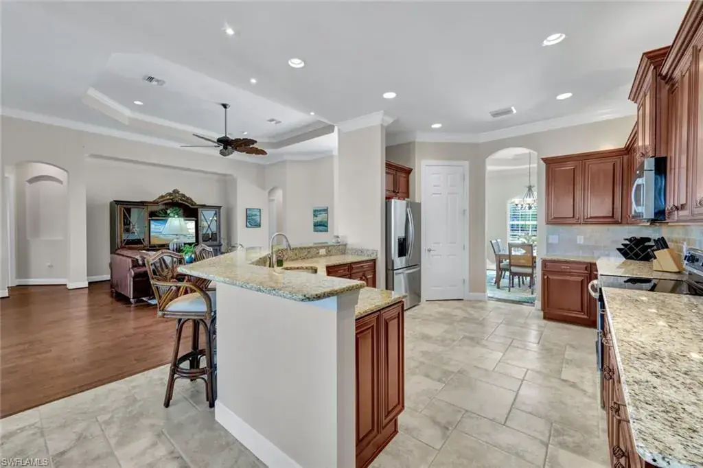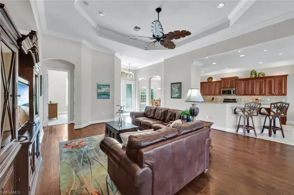 This 3 bedroom floorplan has a large sunny dining room that can be used for dining or den. Home has a brand new AC system, gorgeous rich wood floors, recently sealed brick pavers front and back. The solar and electric heated pool is a rarely seen impressive size for entertaining or swimming laps. An entertainer’s dream home with the great room open to spacious kitchen. The great room slider glass doors retract to the right which further connects inside living space to the lanai pool areas. Rich wooden cabinetry and granite countertops, stainless kitchen appliances, plantation shutters and epoxy floor surface in garage. The owner’s suite is spacious with two walk-in closets, tray ceilings with its own door to lanai. Expansive owner’s suite bathroom with large walk-in shower and separate tub. Storm shutters: some electric and manual.