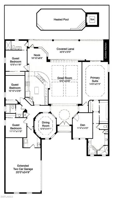 Step outside to the expansive lanai and enjoy breathtaking sunsets with the home’s direct west-facing rear exposure. The heated pool with raised spa, built-in outdoor kitchen with grill & hood, and a bar table create the ultimate outdoor living space for relaxing or hosting friends and family.