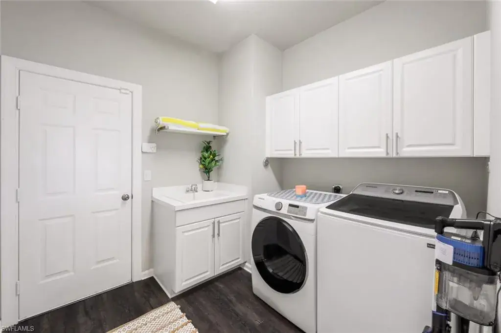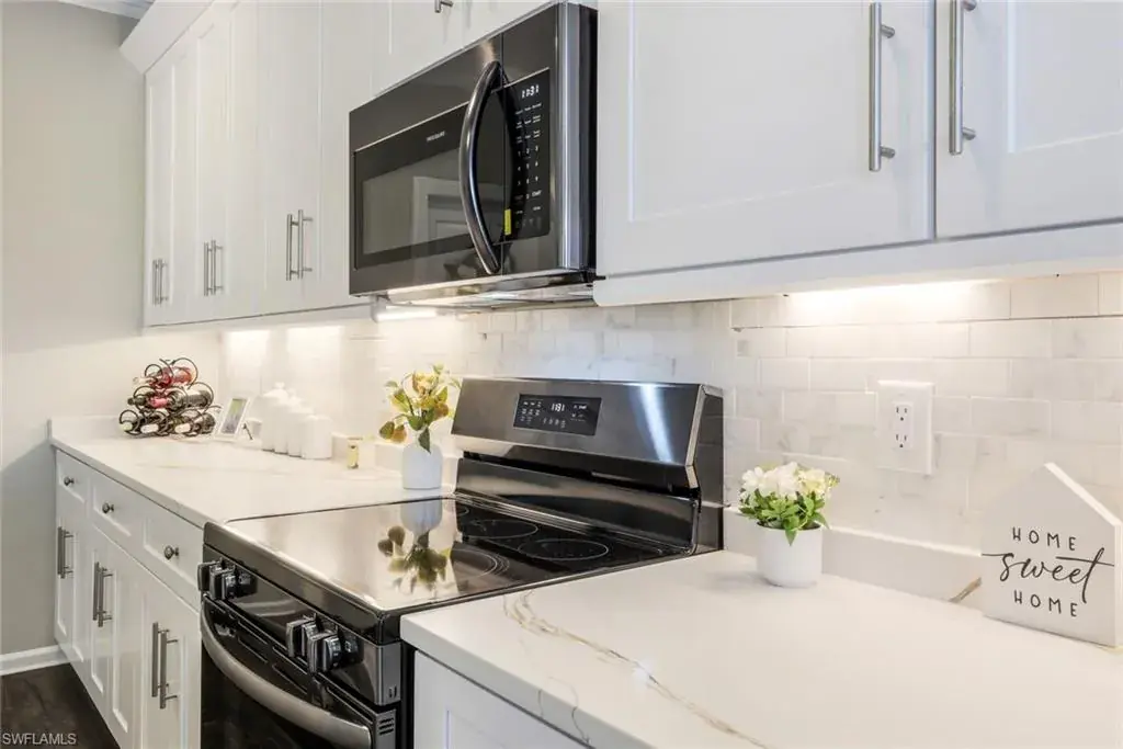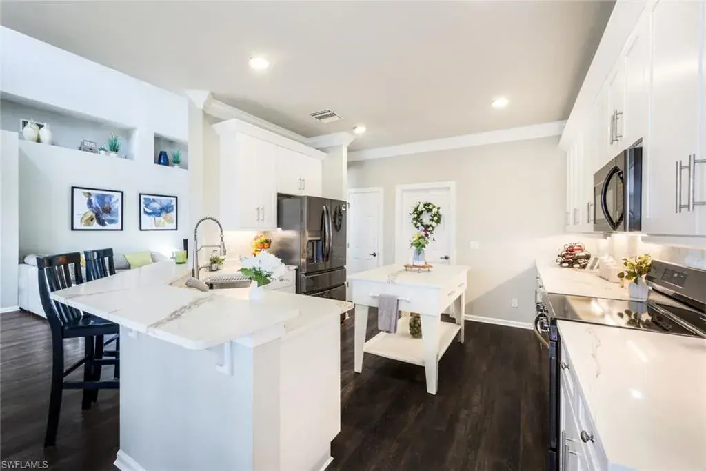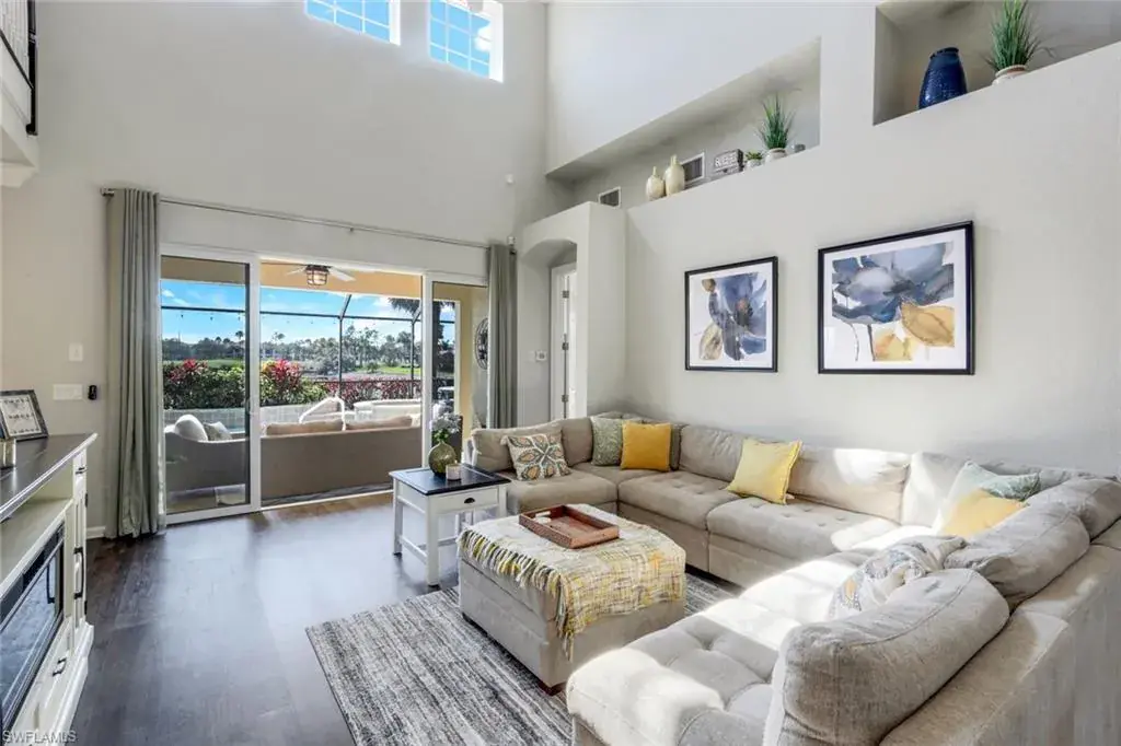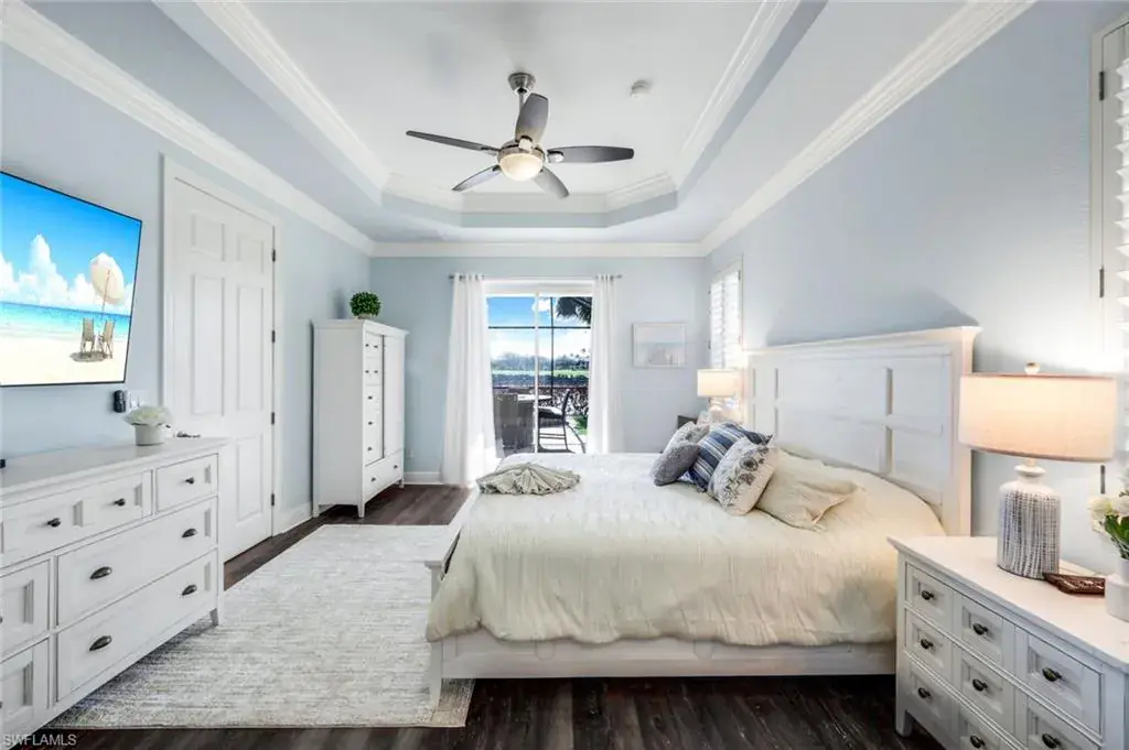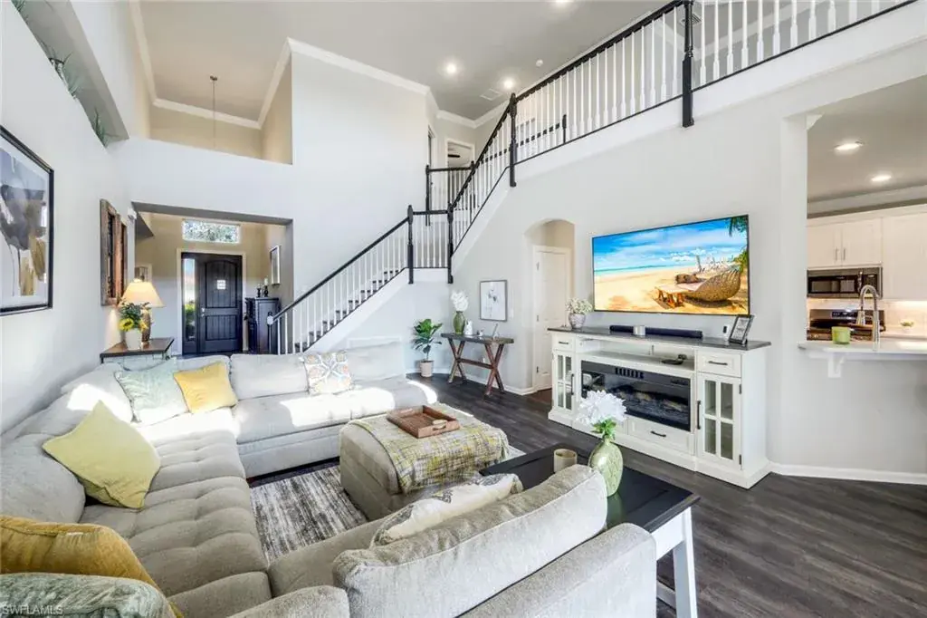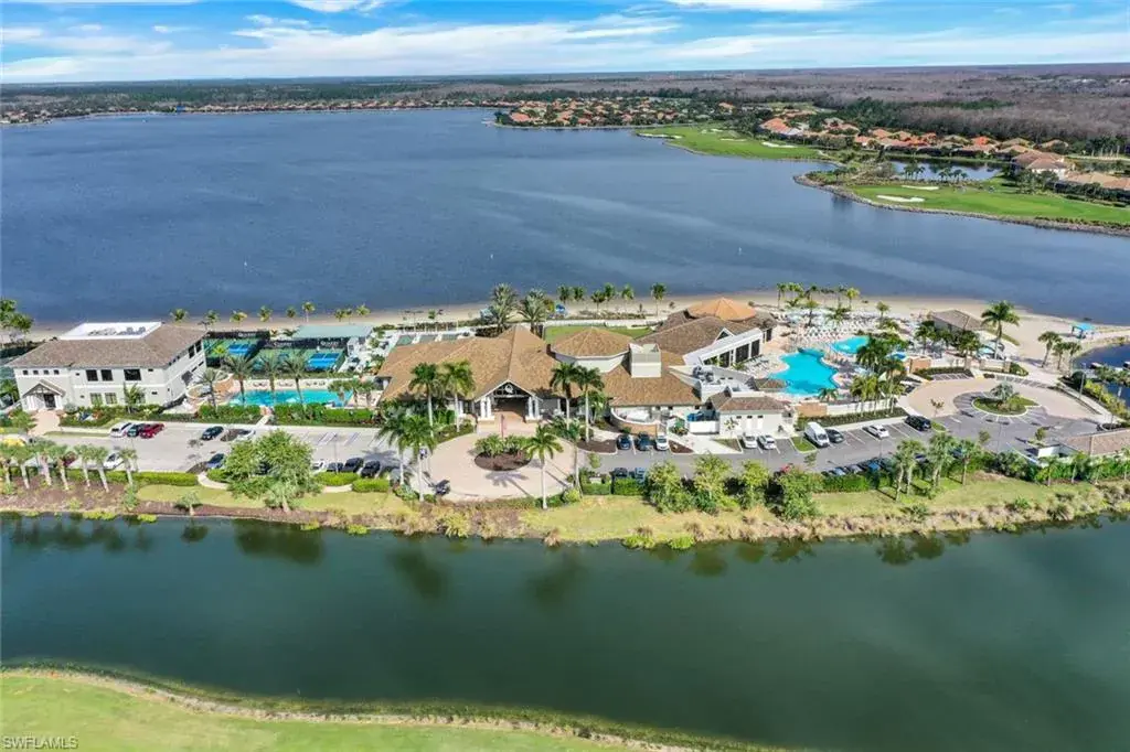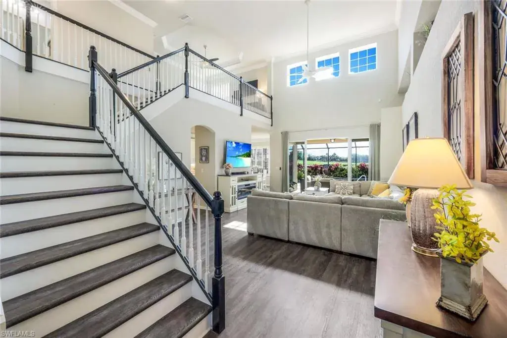 Experience a Vacation Lifestyle in a Country Club Setting! Walk to the amenity-rich Beach Club from this meticulously remodeled FURNISHED home featuring 4 bedrooms, loft office/sitting area and an extended 2-car garage. Nestled on a quiet cul-de-sac on a spacious, premium pie-shaped lot with southern exposure, the home offers breathtaking views of both water and the golf course. Boasting exceptional curb appeal, this home is surrounded by lush landscaping that creates a welcoming and picturesque entrance. Upon arrival, you are welcomed by an elegant stone facade, complemented by a custom front entry door and matching garage door. Inside, enjoy stunning views of the serene waters and the 16th hole of the golf course. The renovated kitchen is bright and airy, showcasing white quartz countertops, sleek white cabinetry, and stainless steel appliances. The expansive primary suite provides direct access to the lanai and boasts a luxurious bathroom. The second floor hosts two additional bedrooms along with a versatile flex room that functions as a home office and a cozy additional living space, all while offering spectacular views. Step outside to the lanai to a tropical retreat featuring a pool and spa. Additional high-end finishes include crown molding throughout, tray ceilings, luxury laminate flooring in the main living areas and stairs, and porcelain plank tile in the bathrooms—each detail meticulously crafted for your enjoyment. This home is equipped with impact windows and doors throughout for your peace of mind. This home is a “must-see” to appreciate its exquisite finishing touches.
