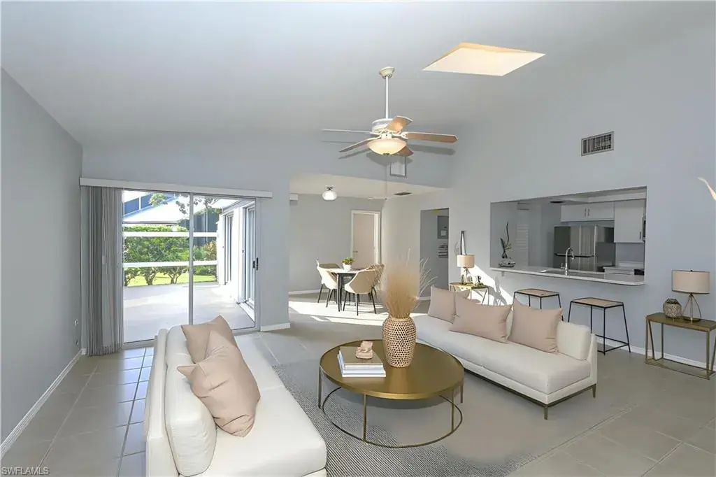 Bright and sunny 2-bedroom 2-bath corner unit in a pet-friendly, ideal location. With new kitchen cabinets and bathroom vanities with quartz countertops, the unit has tile floors throughout. Southeastern exposure and skylight provide plenty of natural lighting. Vaulted ceiling in the great room area and sliders facing the outdoor patio make the unit feel spacious. Has new siding and new metal roof. Comes with washer and dryer, also carport with pull-down ladder to extra storage space. Protected with accordion hurricane shutters. Very close to the community pool. Tennis and basketball courts, playground, and dog park on the premises. Located within walking/close-driving distance to major stores, restaurants, and I-75. Also close to Osceola Elementary and Barron Collier High School. People love the location.