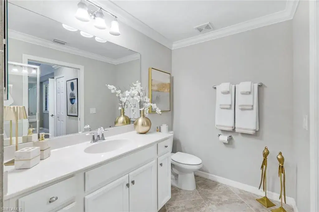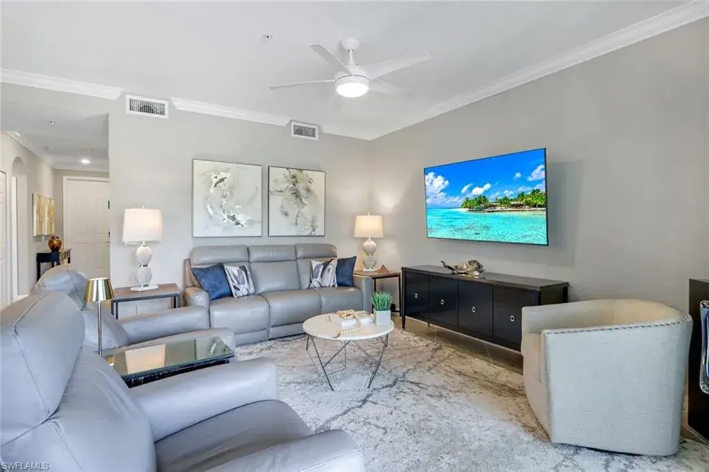 Welcome to Treviso Bay, an exquisite gated golf community in Naples, Florida, where resort-style living is redefined. This rarely available (Birkdale design) residence offers a sophisticated blend of luxury and comfort. The well appointed condo features 2 spacious bedrooms and 2 stylish bathrooms. Every detail has been meticulously curated, showcasing plantation shutters, an inviting tiled lanai, and no-see-um screens for your enjoyment. The spacious primary suite boasts new carpeting, while additional custom cabinetry and glass shower enclosures in the baths, enhance the home’s refined aesthetic. Intricate moldings and ceiling fans add to the elegance, all enveloped in a professionally painted, tasteful palette. The open-concept layout is ideal for entertaining, with a stunning chef’s kitchen at its heart. The expansive 4×9 quartz island serves as a centerpiece, illuminated by natural light from the dining rooms bay window. This space seamlessly flows into the great room, adorned with designer Natuzzi furnishings, creating a perfect setting for gatherings.