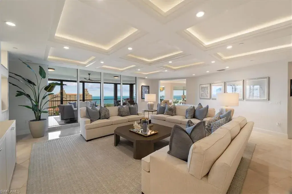 Experience the pinnacle of luxury living at 8787 Bay Colony Drive, Unit 1503, Naples, FL. This exquisite residence boasts 4 bedrooms, 4.5 bathrooms, and an expansive 4160 square feet of living space. Upon entry, you are greeted by a secured private elevator, offering exclusive and discreet access to your elegant abode. The interior has been completely remodeled by Legacy Homes, showcasing a stunning great room, an open kitchen with a family room, and a generous primary suite with captivating Gulf of Mexico views. Additionally, two guest suites provide ample accommodation for family and guests. The chef’s kitchen is a masterpiece, featuring new top-of-the-line appliances, including a Wolf range, oven, and microwave, Sub-Zero refrigerator and wine cooler, Asko dishwasher, Pentair water filter, and Meile steam oven. Every detail has been meticulously curated to elevate the culinary experience. Upgrades abound, with a Bosch heat pump and Rheem water heater installed in 2022, along with new solid interior doors, ensuring both efficiency and elegance. The residence also grants access to a wealth of amenities, including a tropical outdoor resort-style lagoon pool and spa, a poolside social pavilion with a fireplace and media center, and a grand fitness center. For those seeking relaxation, the private elevator opens to a world of tranquility, with access to common outdoor spaces and beachfront bliss. Indulge in the opulence of Trieste, where the lobby, first floor, and elevators were remodeled in 2022, enhancing the building’s elegance. Residents have the privilege of enjoying a wealth of first-class amenities and an exceptional lifestyle through their all-inclusive Bay Colony and Pelican Bay Membership privileges. Live the life of luxury with beach access, city and water views, marble and carpet floors, central AC and heating, attached garage, gym, tennis court, and more. This is an unparalleled opportunity to reside in a residence that exemplifies elegance and sophistication.