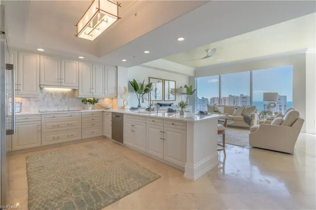 Unwind as you enter into the 18th floor private entrance, immediately discerning the simplicity and ease of this exquisite property. Spectacular sunsets, descending directly into the Gulf of Mexico, are enjoyed throughout the year. Endless Southern and Western views with more than 40 feet of floor to ceiling windows in the main living areas frame the backdrop to this sophisticated home. One of only a handful of Trieste residences with ten foot ceilings, 1802 has been recently refreshed, professionally styled with universal appeal and is offered furnished. Take advantage of moving in, dropping off your bags and heading directly to the beach club, immersing yourself in the Naples lifestyle. The four bedrooms (all ensuite, one currently set up as a study) and 4.5 baths allow for the hosting of friends and family with everyone’s comfort and privacy in mind. Timeless flooring, millwork, high end furnishings and lighting, an expansive, chic yet sensibly designed kitchen overlooking the family room and casual dining area enrich daily living.