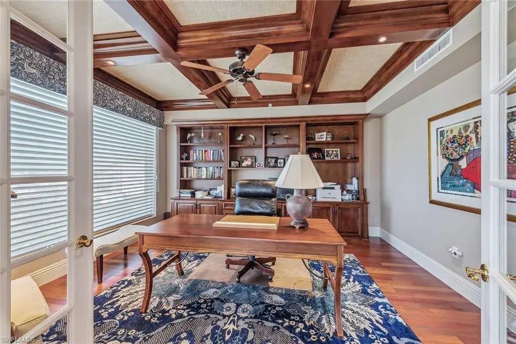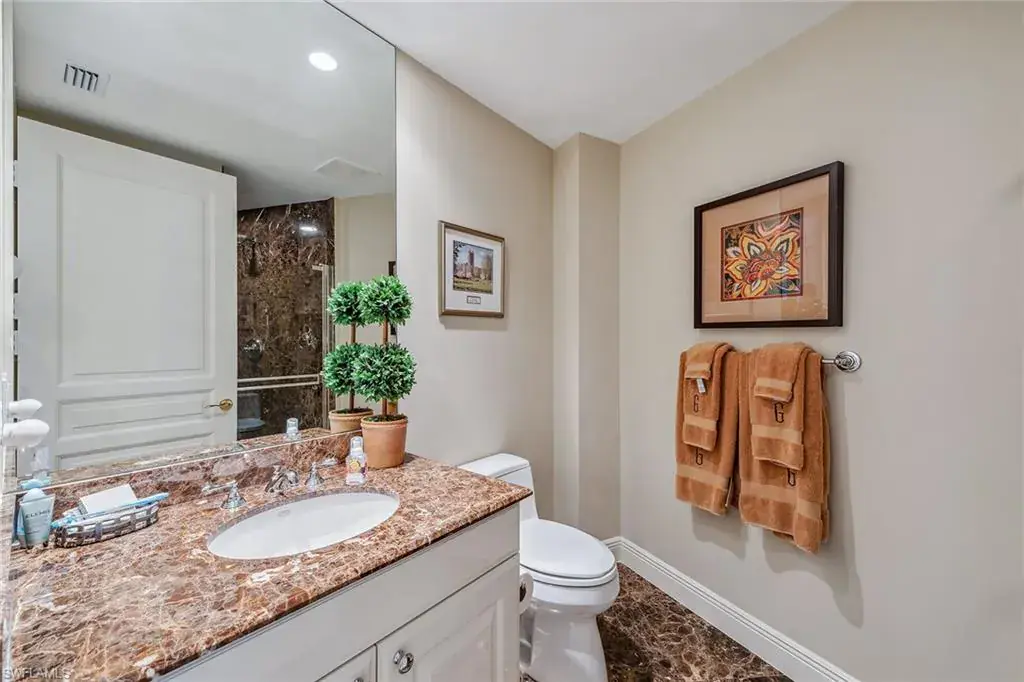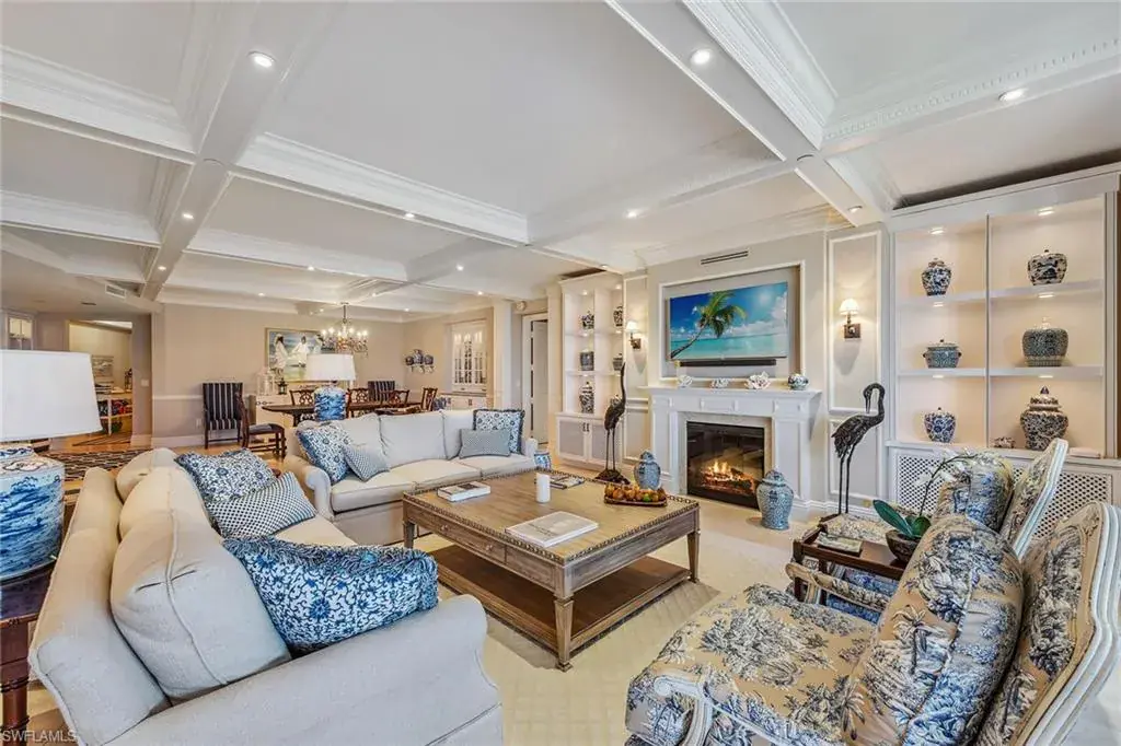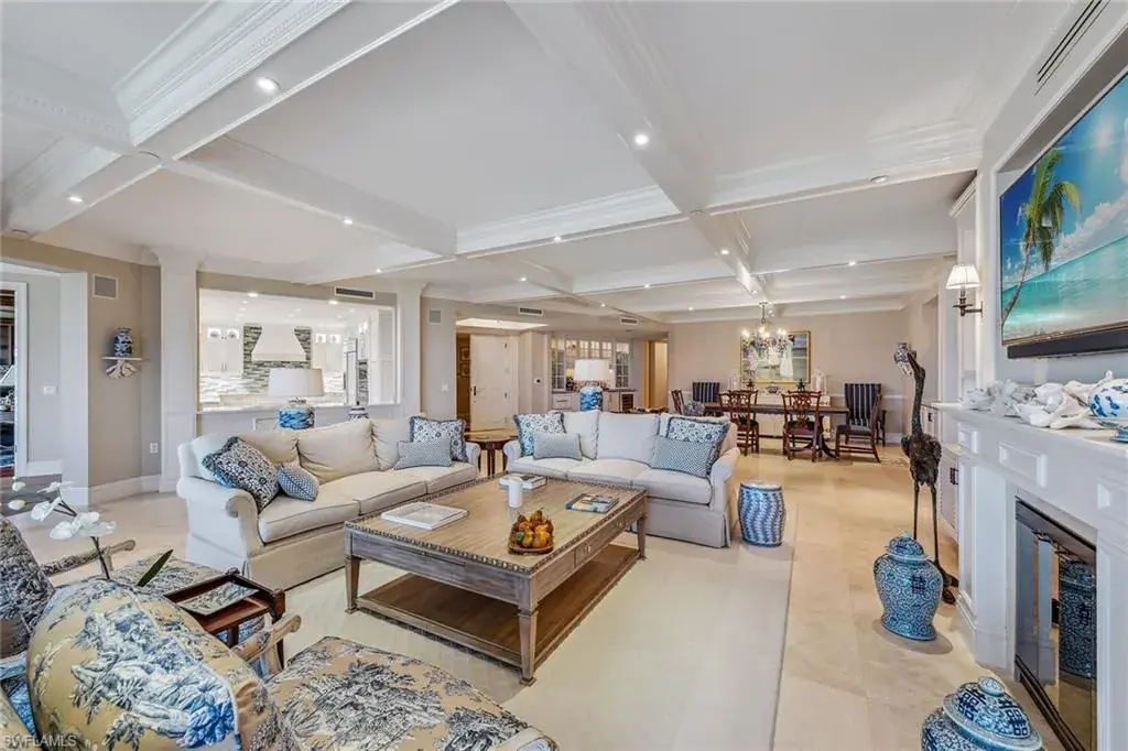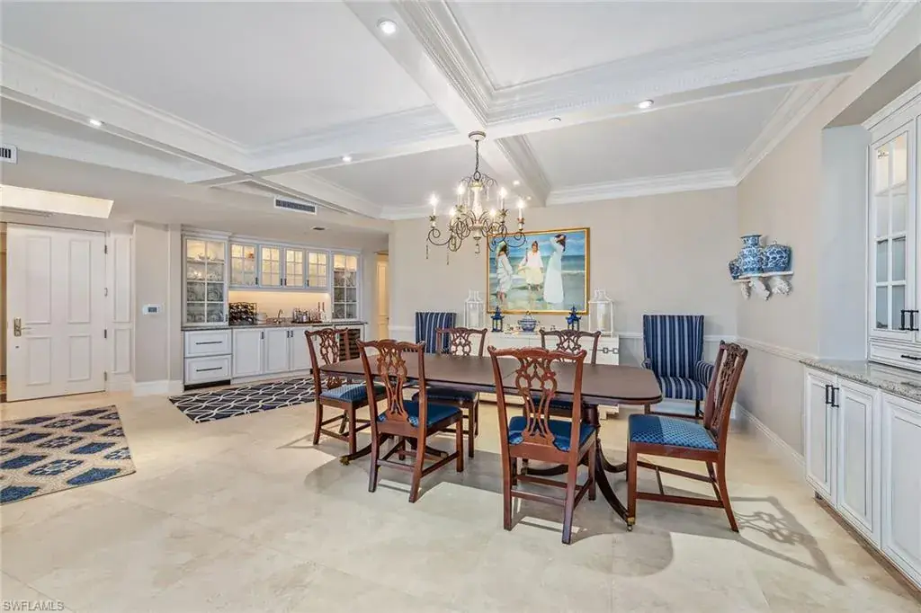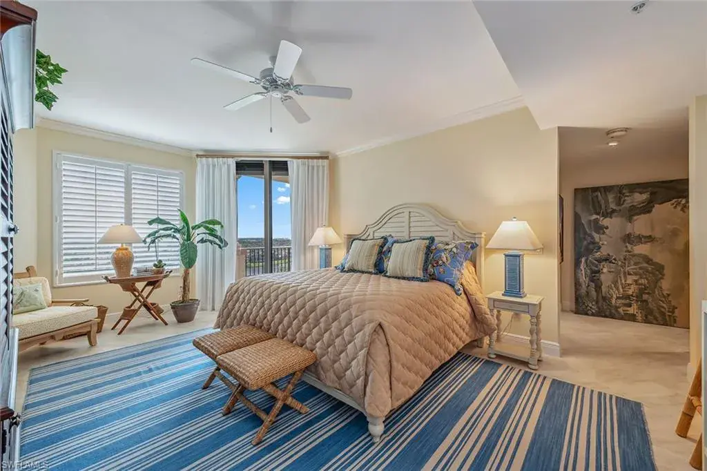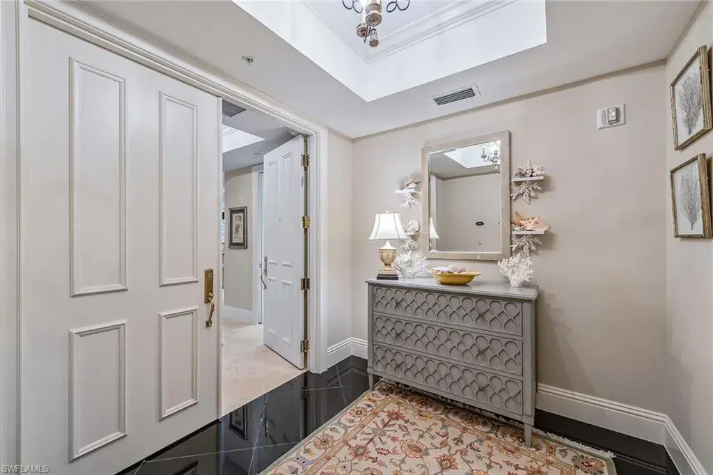 Gorgeous high-floor views. Enter this spacious and popular four-bedroom, 4.5-bath floor plan from your private foyer into an expansive living and entertaining space highlighted by floor-to-ceiling sliding glass doors, polished travertine tile flooring and an expansive screened-in lanai with electric rolldown hurricane barrier. The design has been cleverly modified to include a dedicated office next to the kitchen with outstanding light and views. The kitchen design features a built-out countertop, bright white cabinetry, stainless appliances and a separate breakfast table area. The spa-inspired primary bath features an oversized shower, dual vanities and dual water closets. Your friends and family can enjoy maximum privacy in three spacious guest suites, all with en-suite baths. Trieste is planning upgrades to common areas and residents enjoy a geo-heated tropical pool, fitness room, social room, library and staffed front desk in the lobby. Experience Bay Colony and Pelican Bay beach clubs, with attended beach services or work on your serve at the newly renovated Bay Colony Tennis Club.