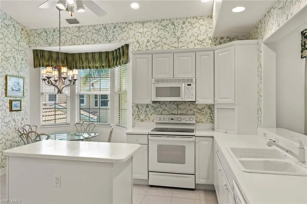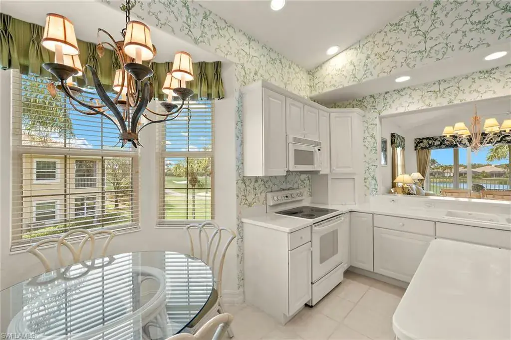 The bright, white kitchen features a charming breakfast nook and plenty of storage, flowing seamlessly into the open living and dining spaces with abundant natural light. A cozy reading area adds a peaceful touch, ideal for morning coffee or evening unwinding.