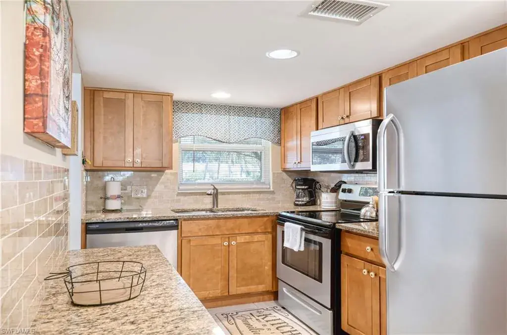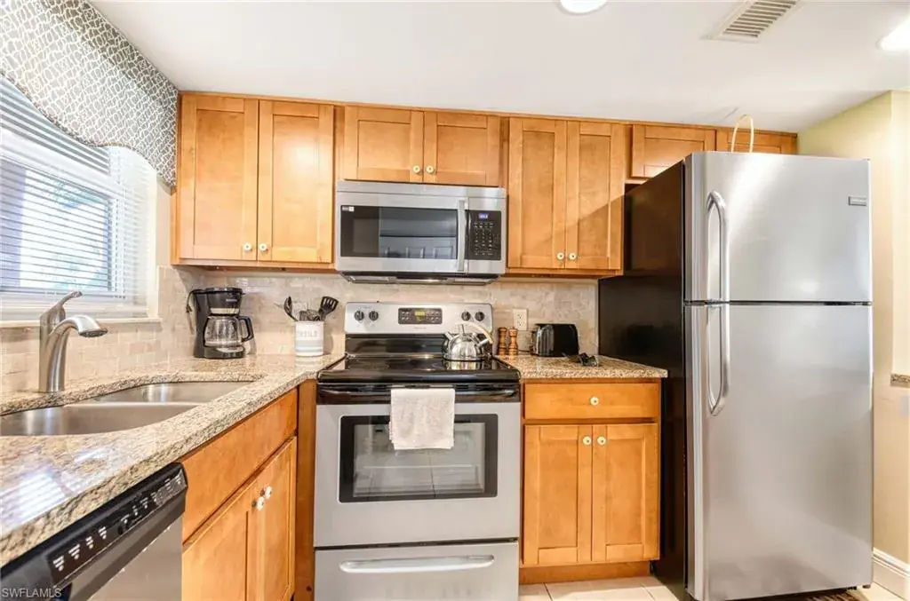 Enjoy a beautiful lake and golf course view with Southern! This conveniently located first floor, 2 bedroom, 2 bath unit is located in Turtle Lake Golf Colony and does NOT require any golf membership and is NOT age restricted. Wood cabinets, granite countertops, stainless steel appliances, updated vanities, tile throughout the main living area and turnkey furnished! Just move right in! Impact glass windows and an accordion shutter for lanai protection provide all the peace of mind you need. Walk to the Publix and Target plaza with several dining options, and minutes to Mercato Old Naples and the beautiful Naples beaches! This is a prime location with wonderful amenities for an affordable price! Steps from the public golf course, community pool and spa, fitness center, tennis and pickleball, bocce and basketball. This is paradise!