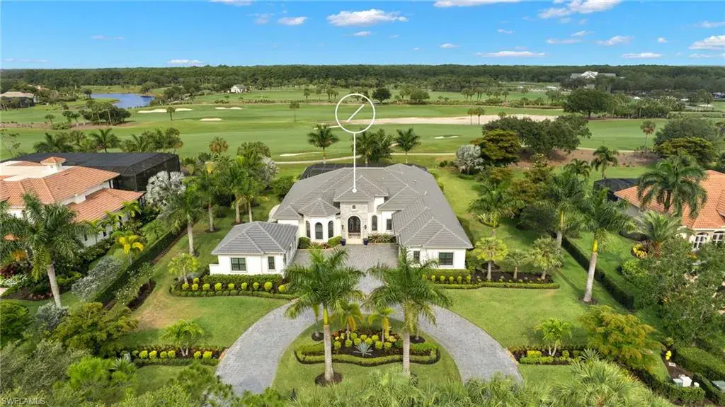 Welcome to 11681 Bald Eagle Way, a stunning custom-built home by Arthur Rutenberg, located on a private street overlooking the 9th fairway of the prestigious Talon Golf Course. This elegant residence sits on a spacious 1-acre lot, offering privacy and breathtaking views. As you approach the property you are met with a large circular driveway, providing a grand entrance and ample parking space for residents and guests alike. Boasting 5 bedrooms and 6 baths, including 4 full ensuites, this home exudes luxury and sophistication. As you step inside through the double iron door entry, you’ll be greeted by a grand interior featuring vaulted coffered ceilings, creating an ambiance of modern elegance. The kitchen is a chef’s dream, equipped with Thermador appliances, a gas 6-burner stove, a large island, expanded cabinets with under cabinet lighting, and a wine/beverage cooler. The butler’s pantry adds a touch of convenience and functionality to the space. Whether you’re hosting a dinner party or enjoying a cozy meal with loved ones, this kitchen is sure to impress. Relax at the end of the day in your serene master suite with dual vanities, a soaking tub, separate shower and his/her closets. The outdoor area is a true oasis, featuring a saltwater pool with electric and gas heat, a spa, water bowl features, a fountain, and a sun shelf. The large outdoor kitchen equipped with a gas grill and bar is perfect for entertaining, while the wood ceilings in the outdoor living space add a touch of warmth and sophistication. Automatic roll-down shade/storm screens provide both comfort and convenience. In addition to its impressive features, this home includes an attached Casita with a private courtyard, adds a layer of versatility to the home, catering to a range of lifestyle requirements. This home is situated on an oversized lot with desirable western exposure, allowing you to enjoy beautiful sunsets and ample natural light. Twin Eagles is one of the finest communities in SWFL, experience 1,115 acres of natural tranquility, 2 Championship Golf Courses- Talon course designed by the Nicklaus Group and The Eagle Course designed by Steve Smyers. New Clubhouse, bocce Courts, Himalayan putting green, Fitness Center, Tennis, Pickleball, resort pool and tiki bar. Immediate FULL GOLF Membership available!