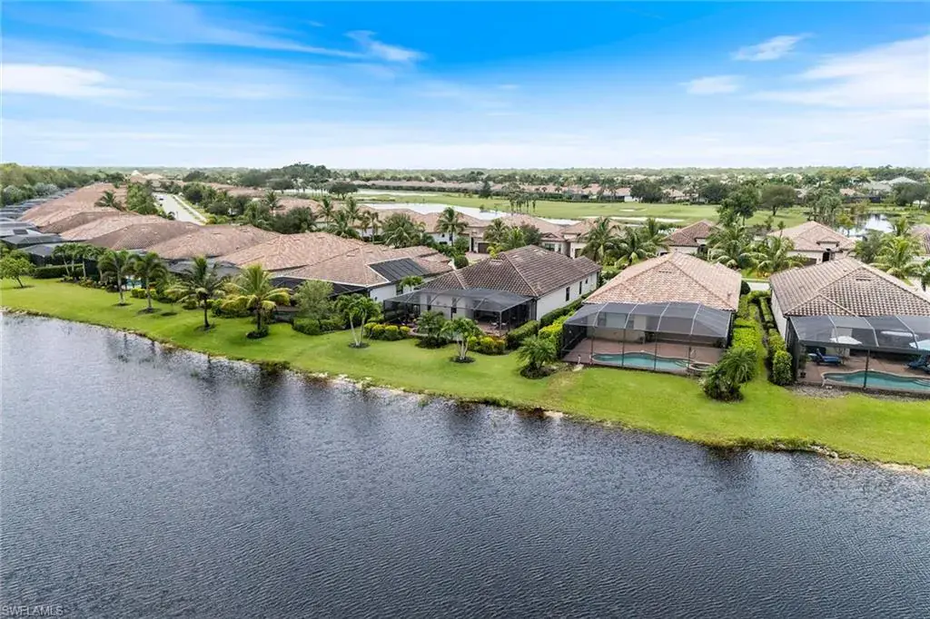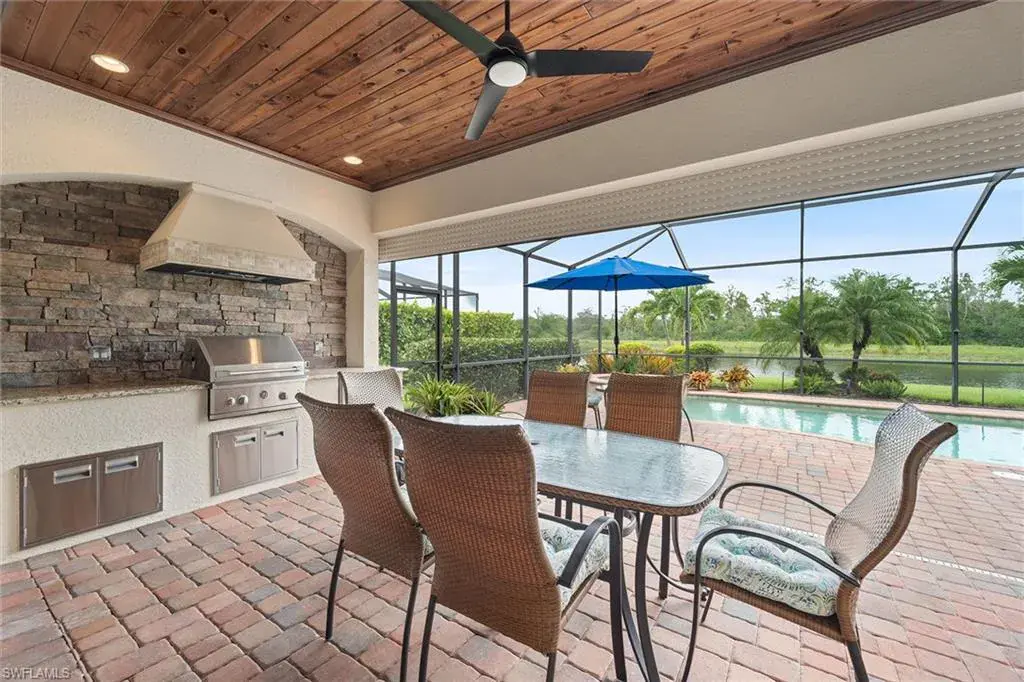 Welcome to 12643 Kinross Lane, an elegant residence in the heart of Naples. This immaculate home blends comfort with intelligent design, offering three bedrooms plus a den, three baths, and 2,224 square feet of living space, all complemented by a two-car garage. The open floor plan is enhanced by rich wood flooring, crown molding, custom lighting, and a coffered ceiling in the living room for a touch of sophistication. The gourmet kitchen features GE stainless steel appliances, wood cabinetry, quartz countertops, a striking backsplash, and built-in pantry doors, seamlessly connected to the great room for effortless entertaining. The primary suite is a private retreat with a spa-like bath, including a soaking tub, walk-in shower, and dual vanities. Two additional bedrooms and a den provide flexibility for guests or a home office. Go outside to your tropical oasis: a screened lanai with a pool, spa, outdoor kitchen and lake views—ideal for relaxation or entertaining. The home also offers impact windows and doors, a full security system, and sits on a spacious 8,276-square-foot lot. In the prestigious Twin Eagles community, residents enjoy 1,115 acres of natural beauty, two championship golf courses (Nicklaus Group & Steve Smyers designs), a new clubhouse, bocce courts, Himalayan putting green, tennis, pickleball, a resort-style pool, tiki bar, and fitness center. A social membership provides access to dining, fitness and social amenities, with limited golf privileges.