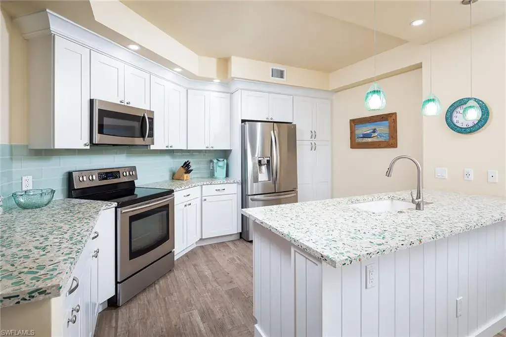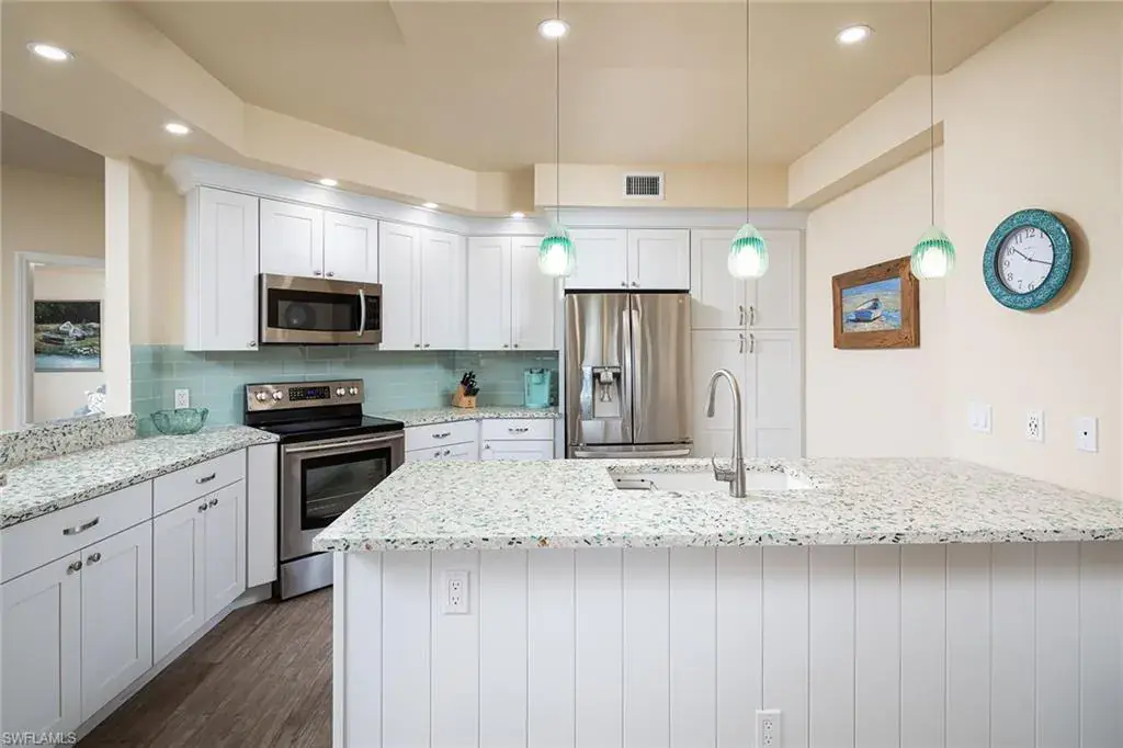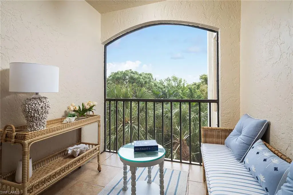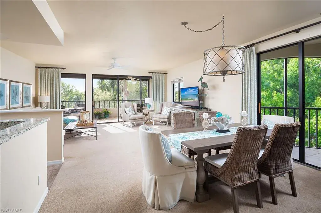 Delightfully sunny end unit with a fabulous renovated kitchen, three terraces, and fresh décor in the heart of Pelican Bay describes this special and roomy treetop home. The gorgeous open kitchen comes complete with a coastal vibe, quartz counters with seaglass tile, shaker cabinetry, stainless steel appliances, chic lighting, and a cozy eating nook. The fresh and neutral décor by Molly Hoover Designs offers a comfortable, coastal, and casual feel, while the spaciousness of this condominium makes it live like a home. Morning sunrise views and sun all day through the multiple verandas are a signature of this lovely space. Located steps from The Commons, for easy travel to Pelican Bay’s two private beach clubs with dining. Valencia boasts an unusually large pool area, a superb clubhouse with a fitness center, and offers robust social activities. Also nearby are the Pelican Bay community center, tennis center, and state-of-the-art fitness center, as well as world-class shopping and dining at Waterside Shops, Mercato, and Artis—Naples. Prepaid new impact windows to be installed this summer.