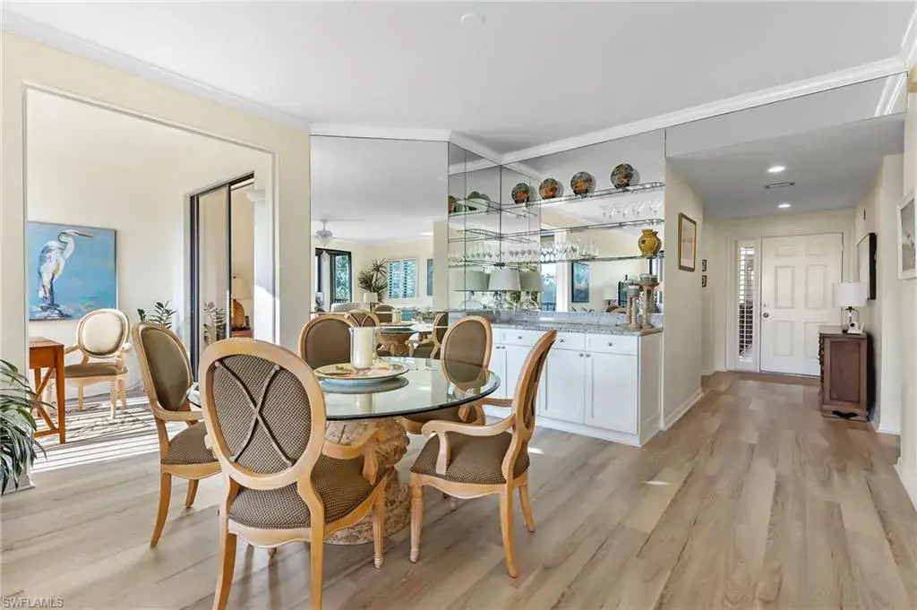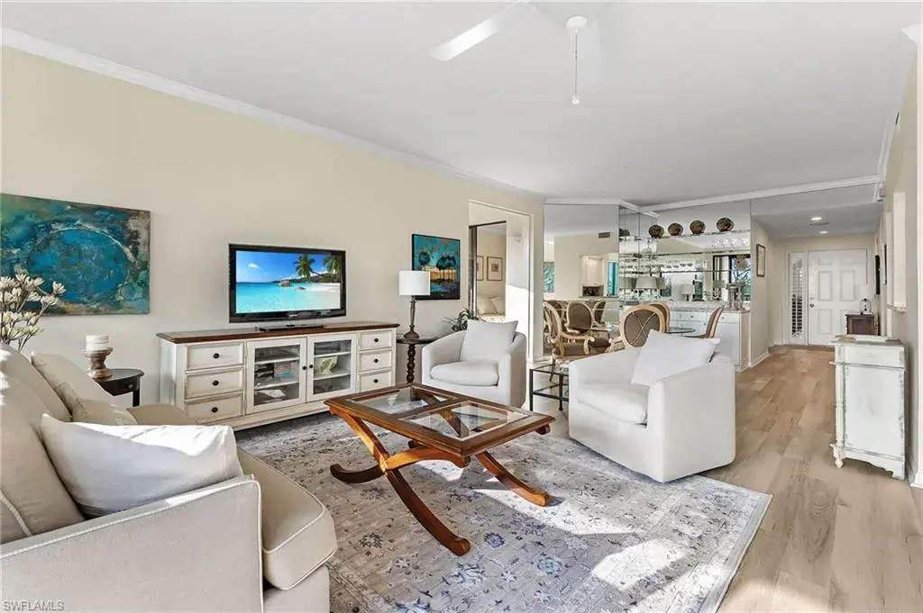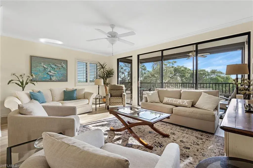 Come see this beautiful, spacious, rare corner two-bedroom, two-bath turnkey furnished condo with updated flooring throughout the main living areas. The on-trend, open kitchen has stainless steel appliances, toe kick lighting, granite countertops and bar area to enjoy your morning coffee. The great room, dining, living room opens up to your large and relaxing screened lanai with golf course and preserve views. This third-floor, split bedroom floor plan has a storage area and an assigned parking space under building, community pool and more. All windows replaced to impact in 2018 and large lanai screen and cage replaced and hurricane screen added also 2018.This building is to the back of Valencia away from the street noise and more private. Walk to the tram for the beach access for Pelican Bay with chairs and umbrellas. Close to Waterside shops, Mercato and everything Naples has to offer. Realtors read confidential remarks. Ac replaced in 2017 and floors redone and condo painted in 2020.