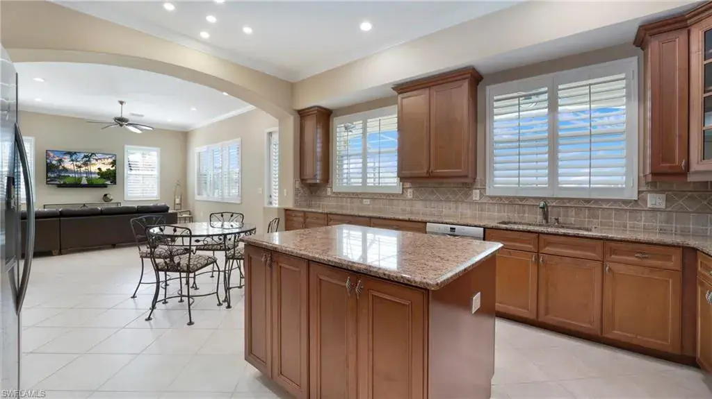 Inside, you’ll find five generous bedrooms, including two primary en-suites that provide private retreats for everyone in the family. The versatile flex room is perfect for a home office, exercise space, or playroom, making this home adaptable to your family’s needs. High 10-foot ceilings, elegant crown molding, plantation shutters, and stunning new wood plank flooring create a bright, welcoming atmosphere. The updated granite kitchen with a large center island is ideal for family gatherings and entertaining friends, opening seamlessly to the expansive lanai and sparkling pool—perfect for Florida’s outdoor lifestyle.