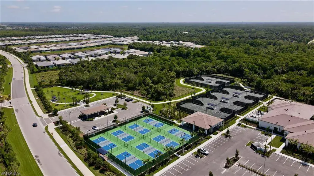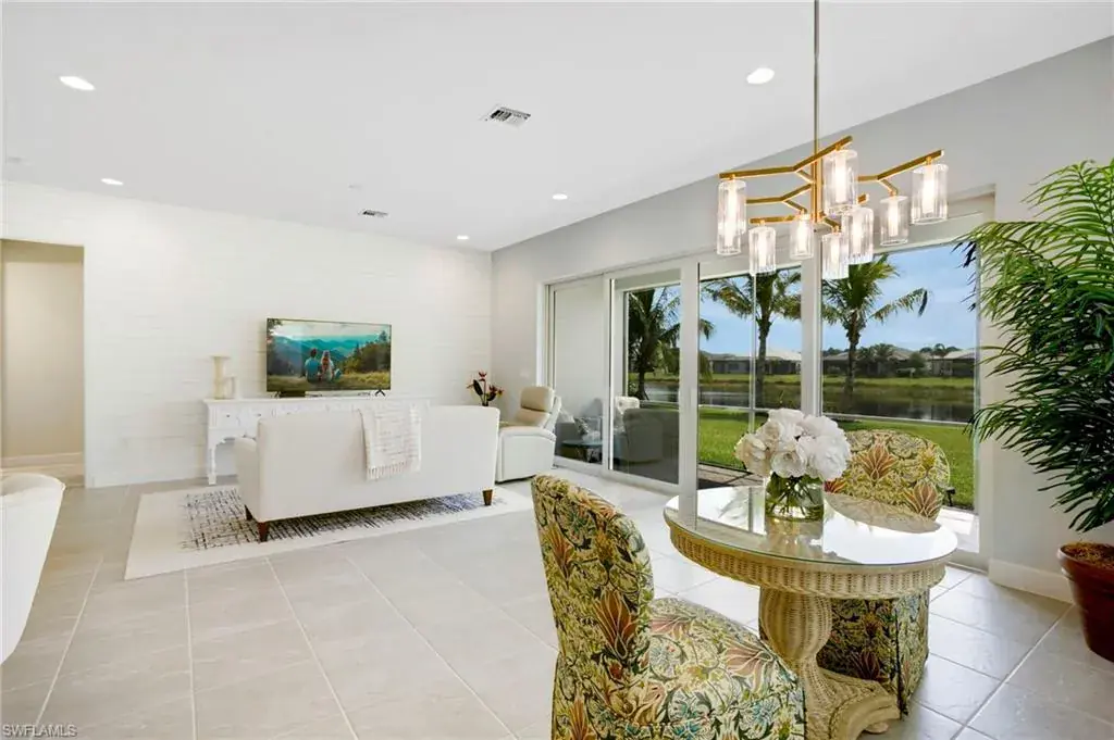 This stunning Pelican model home offers an unparalleled blend of luxury and comfort in the highly sought-after Valencia Trails, Naples’ premier 55+ community. From the moment you step inside, the soaring 14-foot ceilings and custom shiplap detailing create an immediate sense of sophistication. The open-concept design seamlessly connects the kitchen and living areas, making it ideal for both everyday living and elegant entertaining. The chef’s kitchen is a true showpiece, featuring quartz countertops, a gorgeous marble backsplash, a natural gas stove, premium stainless steel appliances, and an upgraded pantry with pullout trash bins. Level 3 wood cabinetry with soft-close functionality and elegant molding adds a touch of refinement, while ample recessed lighting enhances the space. The living area is further elevated by a striking shiplap accent wall, providing warmth and charm. Step outside to your private screened lanai and take in the breathtaking lake views that set this home apart. Whether you’re enjoying a quiet morning coffee or hosting guests for an evening gathering, this tranquil retreat offers a seamless blend of indoor-outdoor living. With ample yard space to accommodate a custom pool, which is pre-plumb for and a lanai pre-plumbed for an outdoor kitchen, this home is designed for relaxation and entertaining at its finest. The combination of tile flooring throughout and cozy carpeting in the bedrooms ensures both style and comfort. Beyond your doorstep, Valencia Trails offers world-class amenities designed to enhance an active and social lifestyle. The impressive 43,000-square-foot clubhouse features a full-service restaurant and bar, a state-of-the-art fitness center, a full-service salon and spa, and multiple recreational spaces, including card rooms, an art studio, and a learning kitchen. For those who love outdoor activities, the community boasts a resort-style pool, a lap pool, a resistance pool, six tennis courts, eight pickleball courts, and scenic walking and biking trails. Even your four-legged companions will feel at home with two dedicated dog parks.