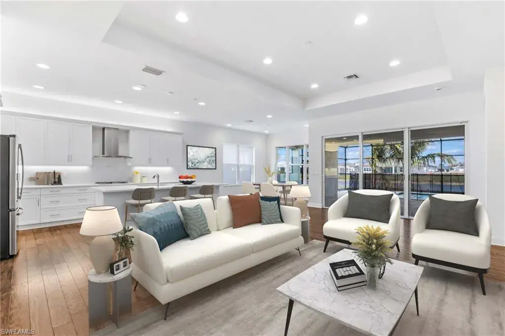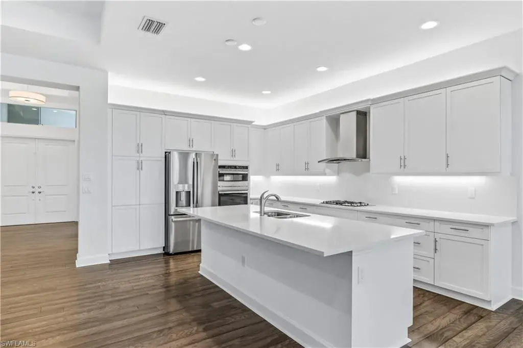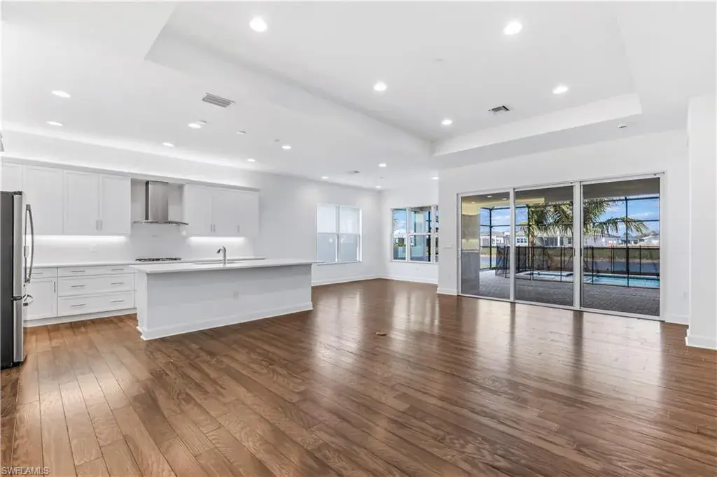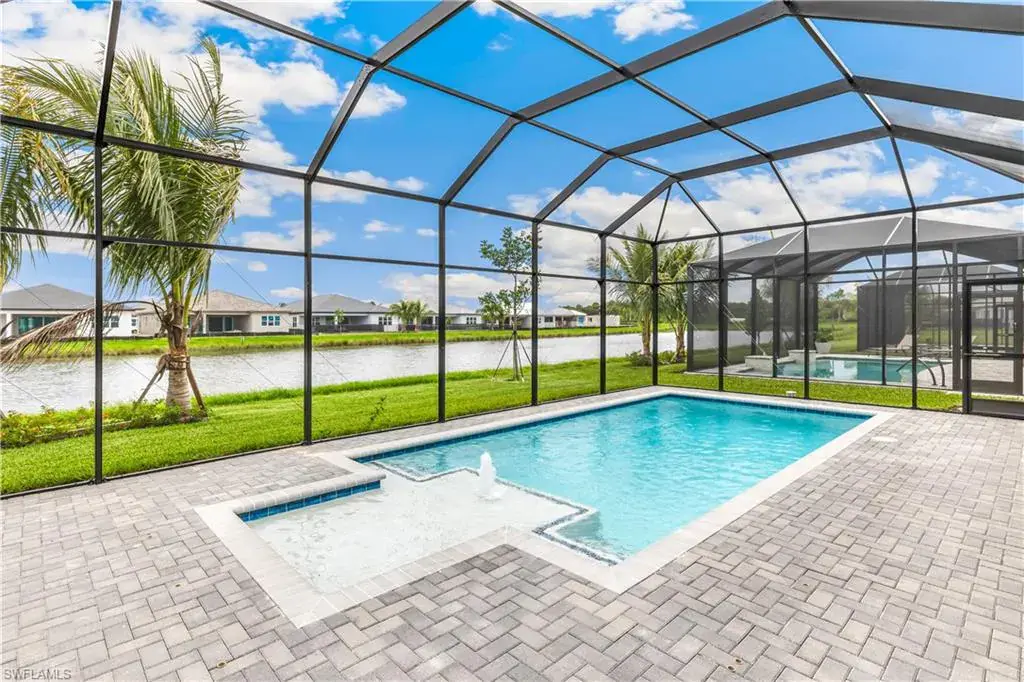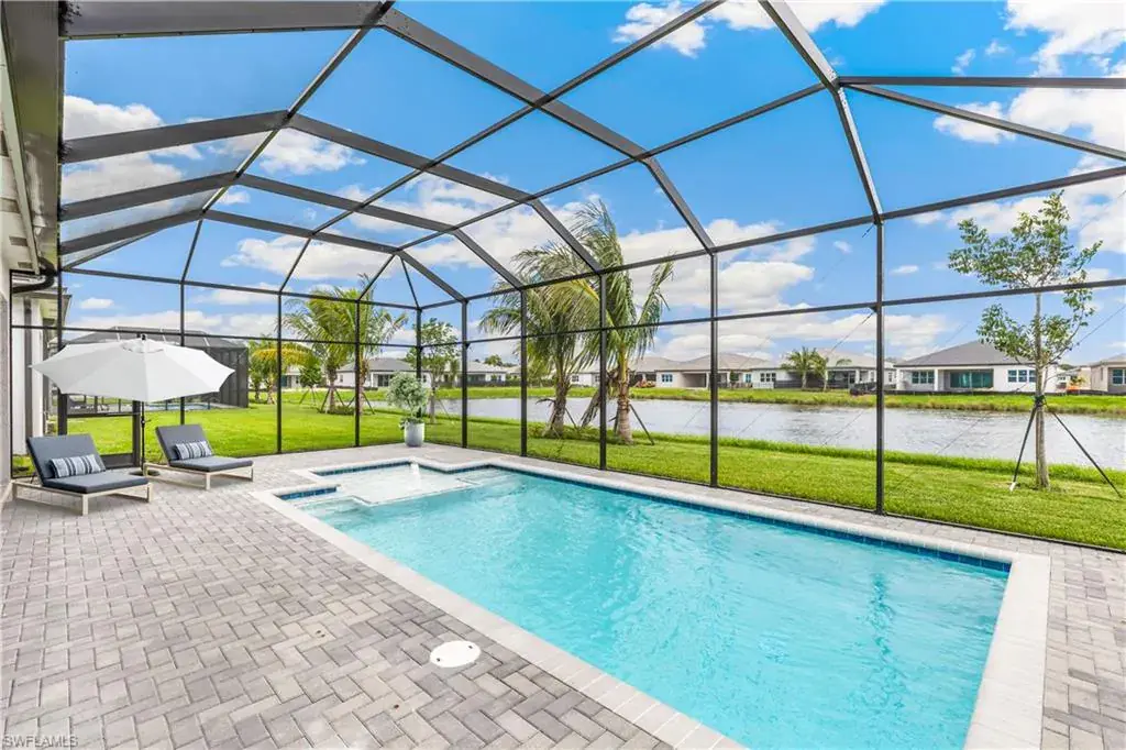 The ONLY AVAILABLE “Nautilus” floorplan with POOL AND LAKE VIEW. BEST VALUE for this BRAND NEW, never lived-in home with SCREENED POOL & LANAI in the new resort community of Valencia Trails. This popular open floor plan offers 3 bedrooms + den, 2.5 baths, featuring a pool with sun shelf & bubbler plus a SCREEN ENCLOSURE already included, a feature no longer offered with new builds at Valencia Trails. Home upgrades and features include luxurious engineered HARDWOOD FLOORS in common areas (with 25 year GL Home warranty), impact windows & doors throughout, 2 car garage plus golf cart garage/storage, tankless water heater, knee wall with summer kitchen stub-out and gas pre-plumbed, gourmet kitchen package with soft close cabinets with under & above cabinet lighting, quartz countertops and much more. This new community features an exceptional lifestyle at the 43,000 sq. ft. clubhouse, including the resort-style pool, 70 ft. lap pool, resistance pool, outdoor firepit, onsite restaurant, poolside bar, social hall with dance floor and stage, full service spa, fitness center, nail salon, cooking studio, and much more. Situated on 160 acres of pristine preserve with over 3 miles of walking trails and endless activities including pickleball, tennis, bocce, dog park, and more. No CDD fee, and reasonable HOA fee that covers access to clubhouse and amenities, lawncare, monitored home security system, and guarded gate.