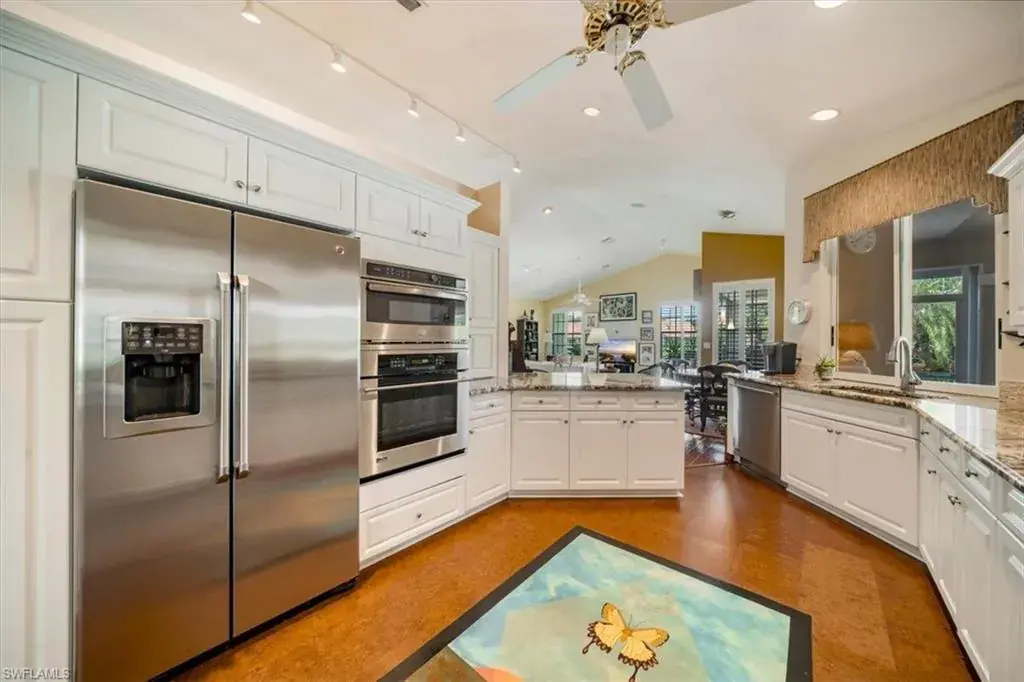 This beautifully maintained home in the Vineyards offers timeless style and easy Florida living on a southwest-facing lakefront lot with lush landscaping, great curb appeal, and a brand-new roof completed in 2023. A double-door entry with glass accents and a palladian window opens to soaring 12’ ceilings, hardwood floors through the main living areas include: living room, dining room, family room, breakfast nook and hallways. Sunny and brightly lit home sparkles with natural light. The formal dining room shows off decorative millwork, a dramatic picture window with custom draperies, and tall ceilings, while the living room features hardwood floors, sliders that fully pocket to the lanai, and a welcoming flow. The kitchen blend’s function and charm with white cabinetry, cork flooring, granite counters, stone backsplash, stainless appliances, and an oversized sink overlooking a pass-through window to the lanai. A bay-window breakfast nook with pendant lighting opens to the bright family room with plantation shutters, sliders to the lanai, and a wet bar perfect for entertaining. The owner’s suite is a true retreat with its own vestibule, three closets, French door access to the pool, and a spa-inspired bath with oversized vanity, separate makeup space, floating soaking tub, walk-in seamless shower, and enclosed water closet. Two guest suites offer comfort and privacy, and a separate den with vaulted ceilings, built-ins, and a large picture window that works as a home office or optional fourth bedroom. Outdoor living is easy with an expansive covered and screened lanai featuring paver decking, recessed lighting, a ceiling fan, and electric shutters, all overlooking sparkling lake views. Additional highlights include an oversized paver driveway and walkways, a 2-car garage with attic access, and a laundry room with utility sink. With southwest exposure filling the home with light, you’ll love the relaxed vibe, and while Vineyards doesn’t require club membership, options are available to enjoy two 18-hole golf courses, a racquet center with 12 Har-Tru tennis courts (six lit for night play) and eight gel-cushioned pickleball courts with LED lighting, multiple dining venues, plus a world-class wellness center offering a gym, spa, barber shop, salt cave, and more.