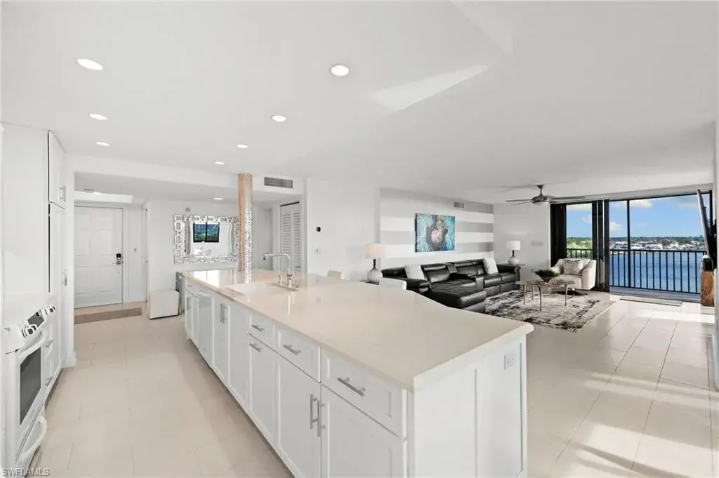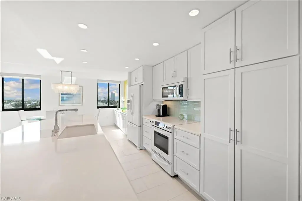 Stunning Top-Corner Condo with Panoramic Gulf & Bay Views. Located in the highly sought-after south corner of the building, this exceptional end-unit condo offers breathtaking panoramic views of the Gulf of Mexico and Vanderbilt Bay. With windows on three sides, the residence has ample natural light, creating an inviting and airy atmosphere throughout. Two expansive L-shaped lanais, one at the front and one at the back, provide the perfect spaces to enjoy spectacular sunrises and sunsets while taking in the serene views of the Gulf and the Vanderbilt Bay channel. This condo has undergone a complete renovation thoughtfully designed by a professional interior designer. Also has a brand-new HVAC system. The unit is being offered turnkey furnished, so you can move right in and start enjoying the relaxed coastal lifestyle. Includes a rarely available under-building garage space, a storage unit, and private deeded beach access just steps away. Impact-resistant glass throughout, offering added peace of mind. This unit incurred no storm damage from Hurricane Ian or Hurricane Milton. With its unbeatable location on Vanderbilt Beach, this one-of-a-kind condo is a must-see. Don’t miss out on the opportunity to own this coastal gem. Garage included in list price!