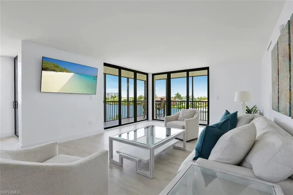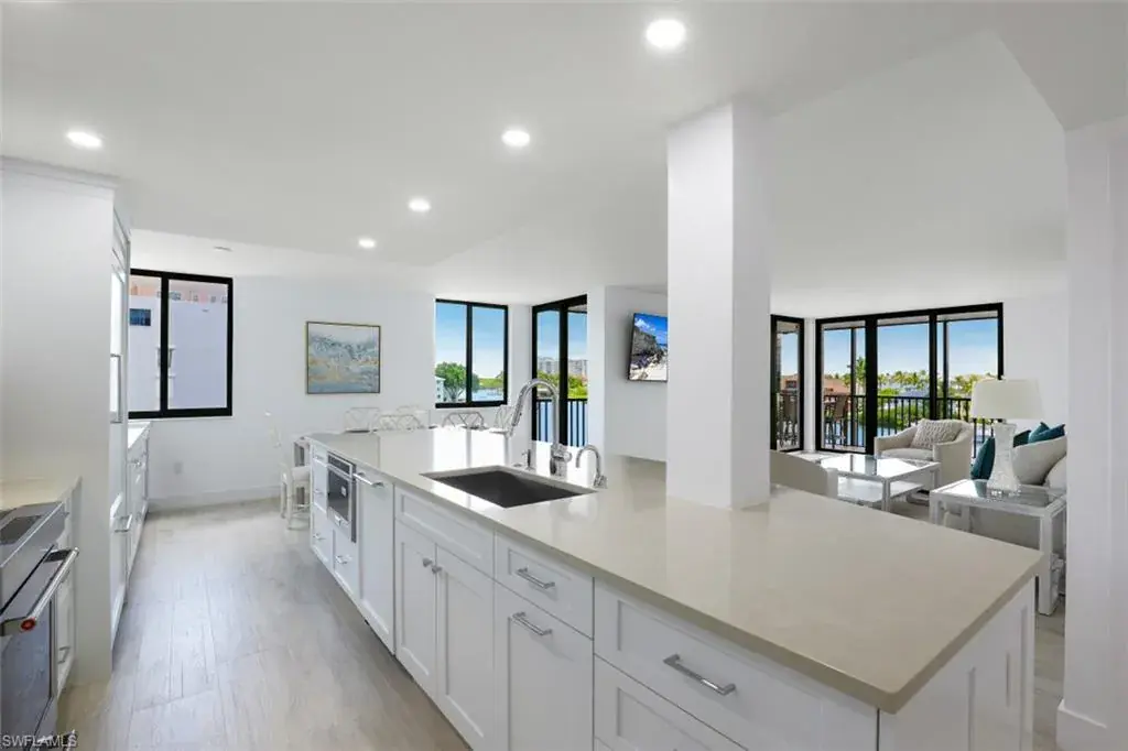 C8305 – This high end fully renovated, spacious corner residence runs front to back with magnificent views of the Gulf of Mexico as well as Vanderbilt Bay.  Two Large L-shaped lanais allow you to relax and watch the dolphins play in the Bay or watch the stunning sunsets from the front balcony. Details include new custom cabinetry with an oversized island and quartz countertops, high-end appliances, stainless steel range hood, elegant tile backsplash, and a built-in-buffet bar with a beverage cooler.  This home is outfitted with a new heating/cooling system, new water heater, impact-resistant windows and sliding doors and offered turnkey furnished.  It comes with a rarely available enclosed Parking Garage under the building and private storage unit for beach gear.   Amenities include remodeled lobby with restrooms as well as tennis, pickle ball, shuffleboard, and pool all with water views.  There are boat slips and pool cabanas behind the building that can be rented or purchased based on availability.  Owners can walk across the street and use the private deeded beach access, and it’s a quick walk to LaPlaya, the Turtle Club, and the Ritz-Carlton.