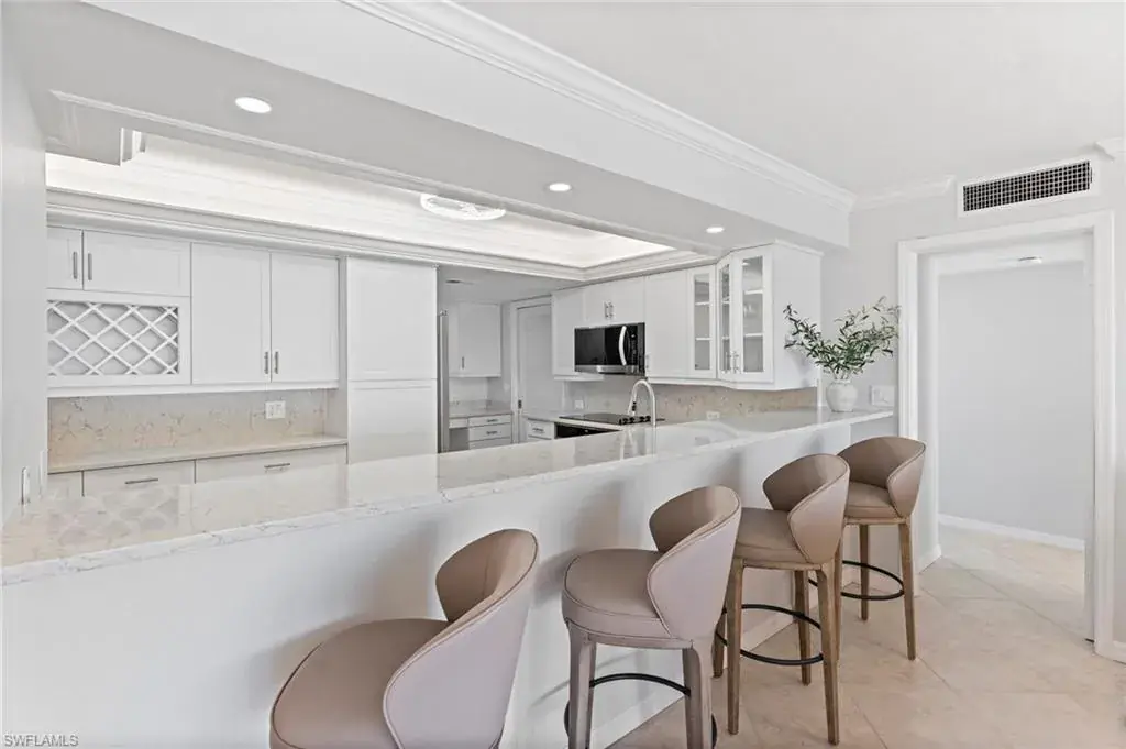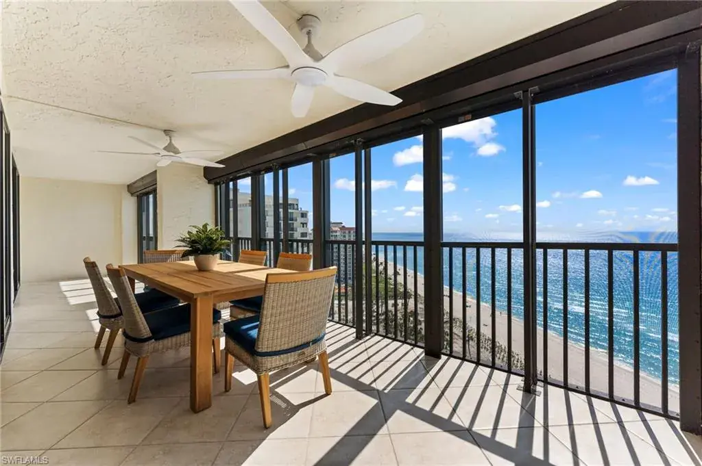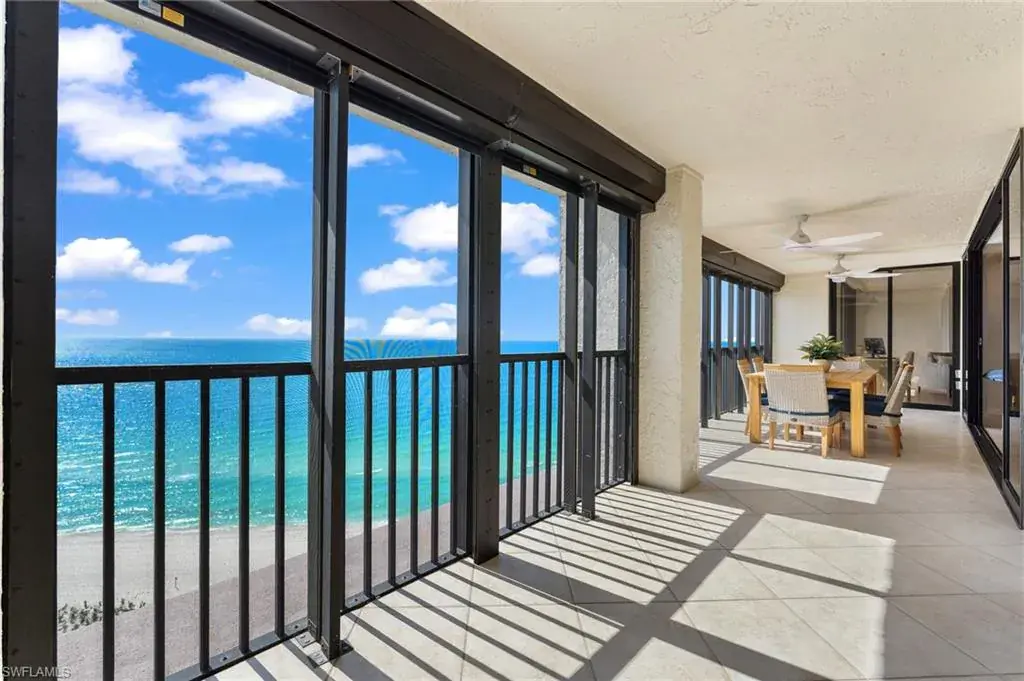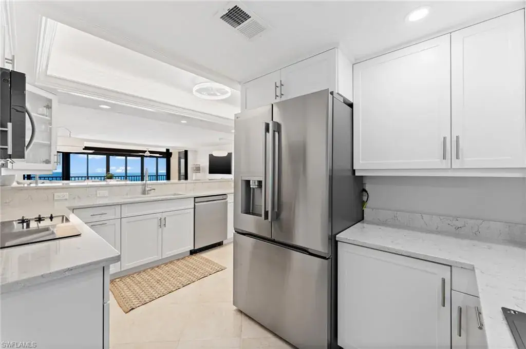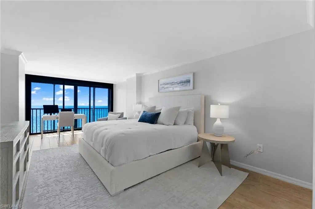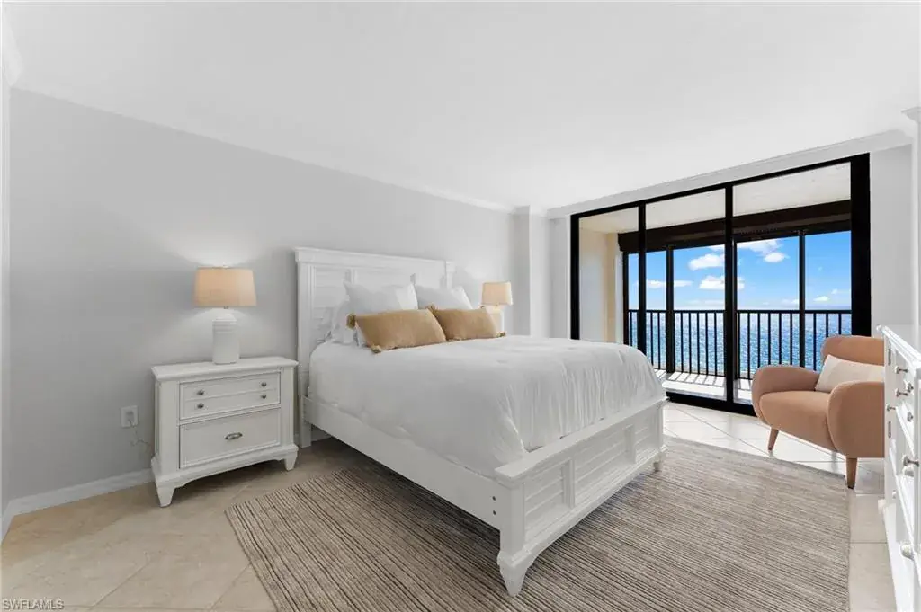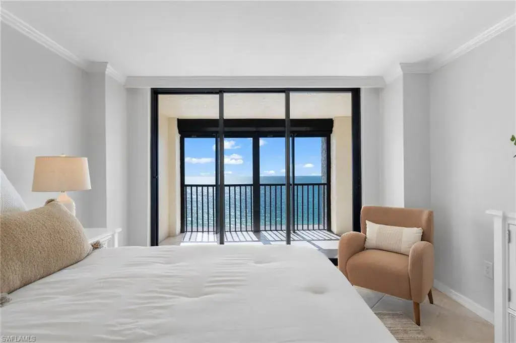SKYHIGH VIEWS – Highly coveted, newly furnished “03” stack unit features an open floorpan with 2 master suites facing direct beachfront, both with access to the screened lanai, and great room with spacious kitchen. Well-appointed with updated finishes include neutral tile throughout, white shaker refaced cabinets, popular quartz countertops and new stainless steel appliances in the kitchen. Both bathrooms have been freshly updated with new shaker cabinetry and quartz countertops and fresh lighting for a bright and spacious design. One master bedroom has been built out through the patio for additional interior living space/sitting area and still has access to the 35+ foot long expansive screened lanai for stunning views. Additional upgrades include electric hurricane shutters, desk/office built in and 2023 HVAC & Water Heater. Residents at Vanderbilt Gulfside enjoy a gated resort compound with over 750 feet of beach frontage, the largest heated, salt water pool on Vanderbilt Beach, 2 guest suites, 2 tennis courts, Tesla charging stations, barbecue grills and an exercise facility all overlooking 8+acres of professionally landscaped grounds. Full time on-site staff with attended lobbies makes living in this resort community a true pleasure!