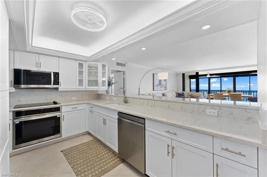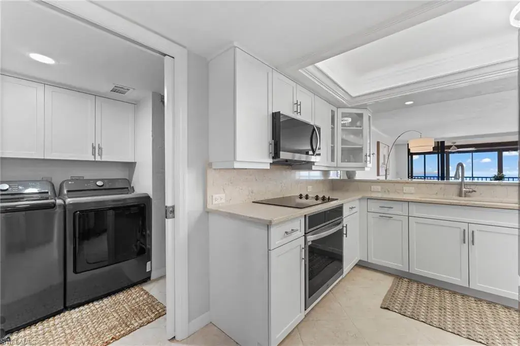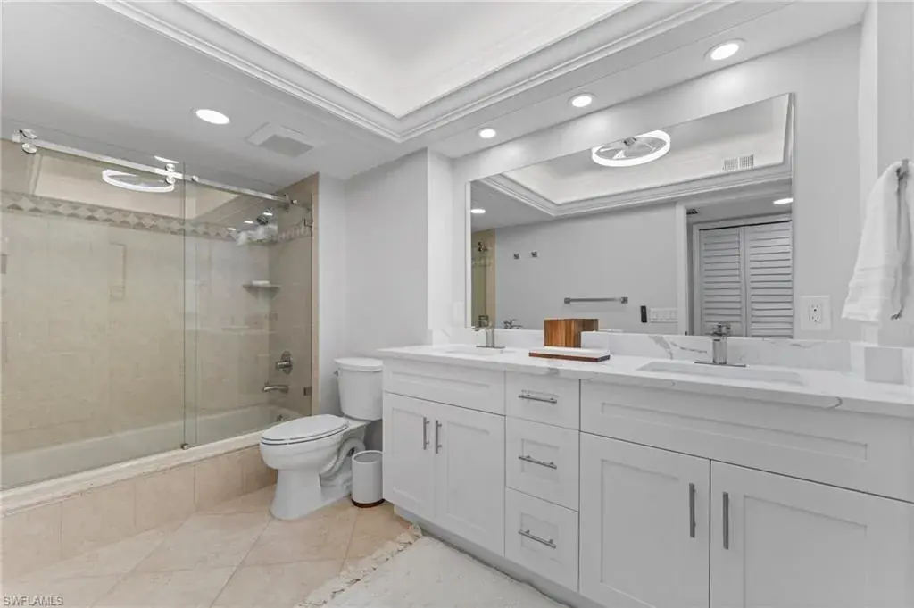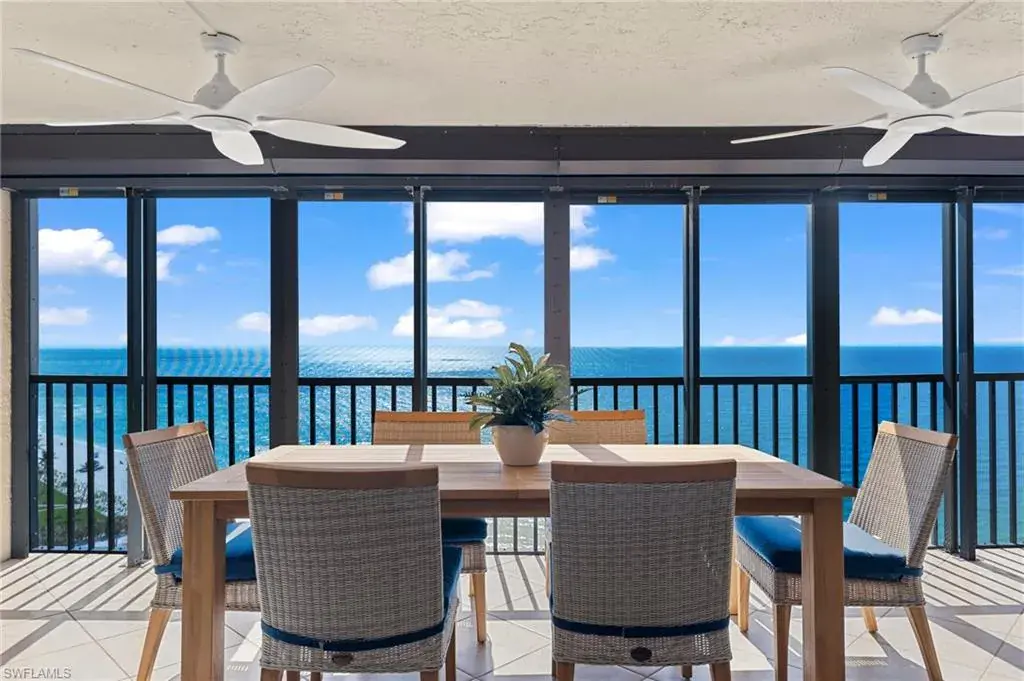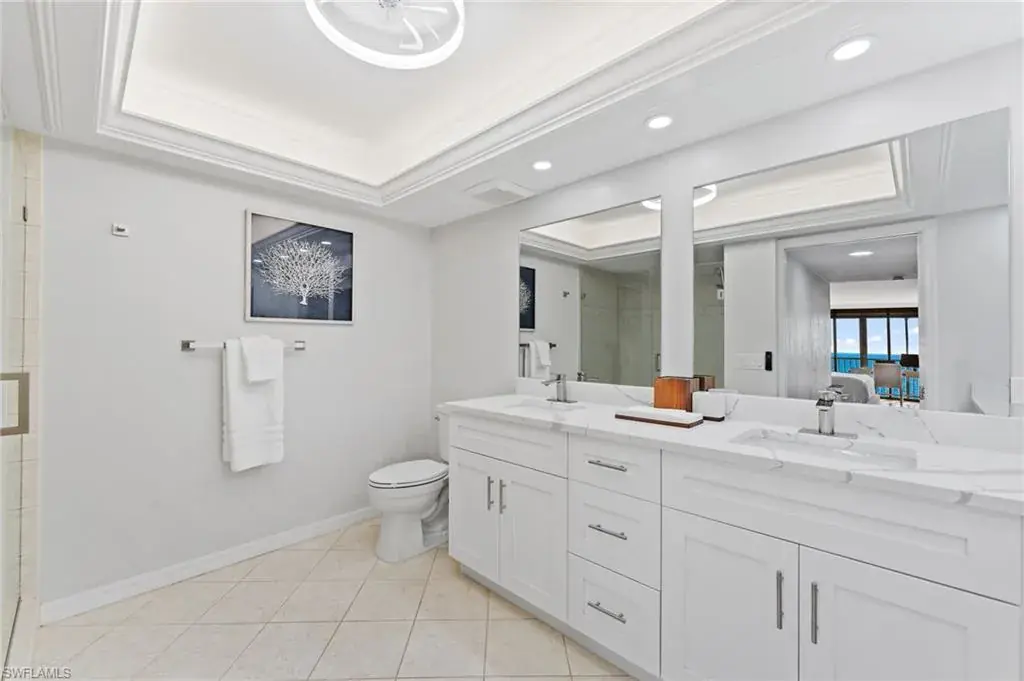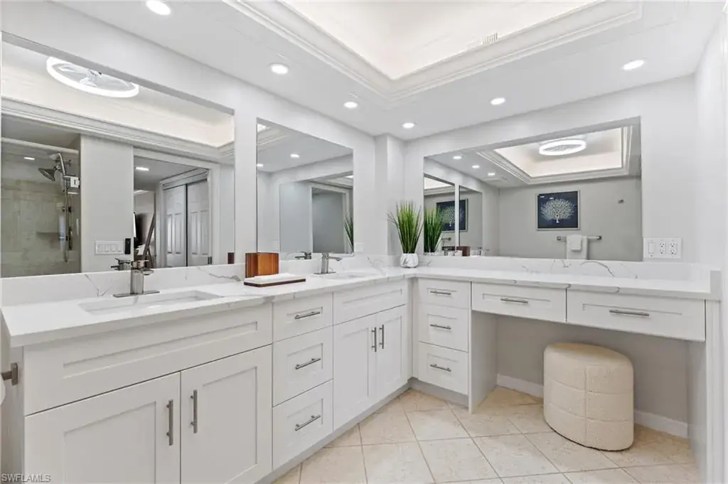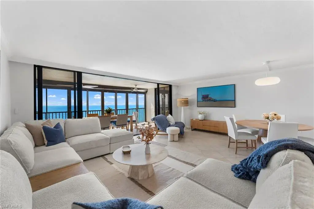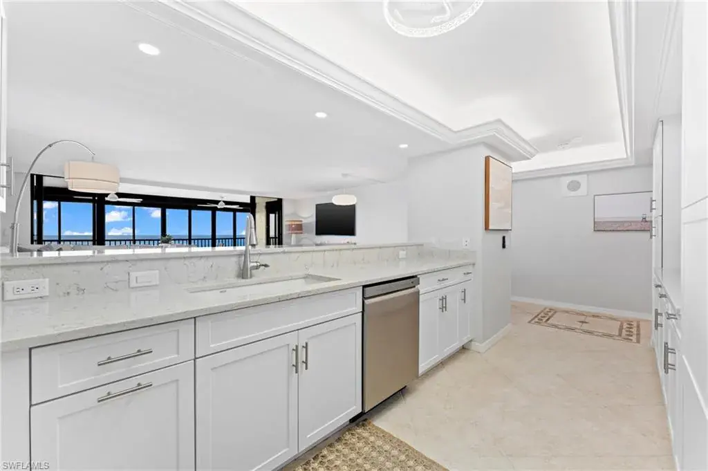 SKYHIGH VIEWS – Highly coveted, newly furnished “03” stack unit features an open floorpan with 2 master suites facing direct beachfront, both with access to the screened lanai, and great room with spacious kitchen. Well-appointed with updated finishes include neutral tile throughout, white shaker refaced cabinets, popular quartz countertops and new stainless steel appliances in the kitchen. Both bathrooms have been freshly updated with new shaker cabinetry and quartz countertops and fresh lighting for a bright and spacious design. One master bedroom has been built out through the patio for additional interior living space/sitting area and still has access to the 35+ foot long expansive screened lanai for stunning views. Additional upgrades include electric hurricane shutters, desk/office built in and 2023 HVAC & Water Heater. Residents at Vanderbilt Gulfside enjoy a gated resort compound with over 750 feet of beach frontage, the largest heated, salt water pool on Vanderbilt Beach, 2 guest suites, 2 tennis courts, Tesla charging stations, barbecue grills and an exercise facility all overlooking 8+acres of professionally landscaped grounds. Full time on-site staff with attended lobbies makes living in this resort community a true pleasure!