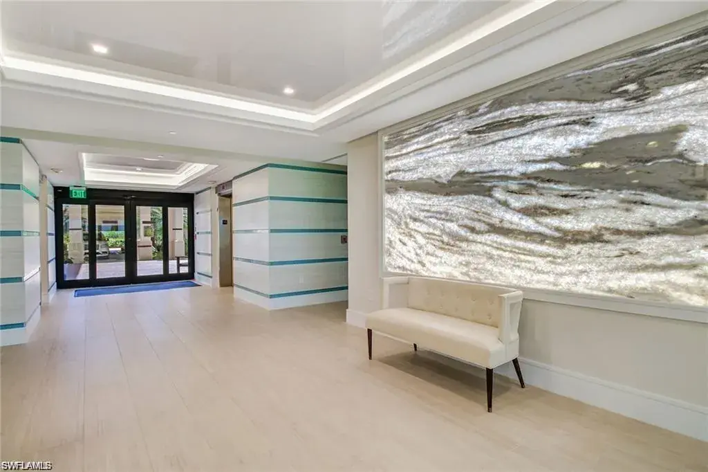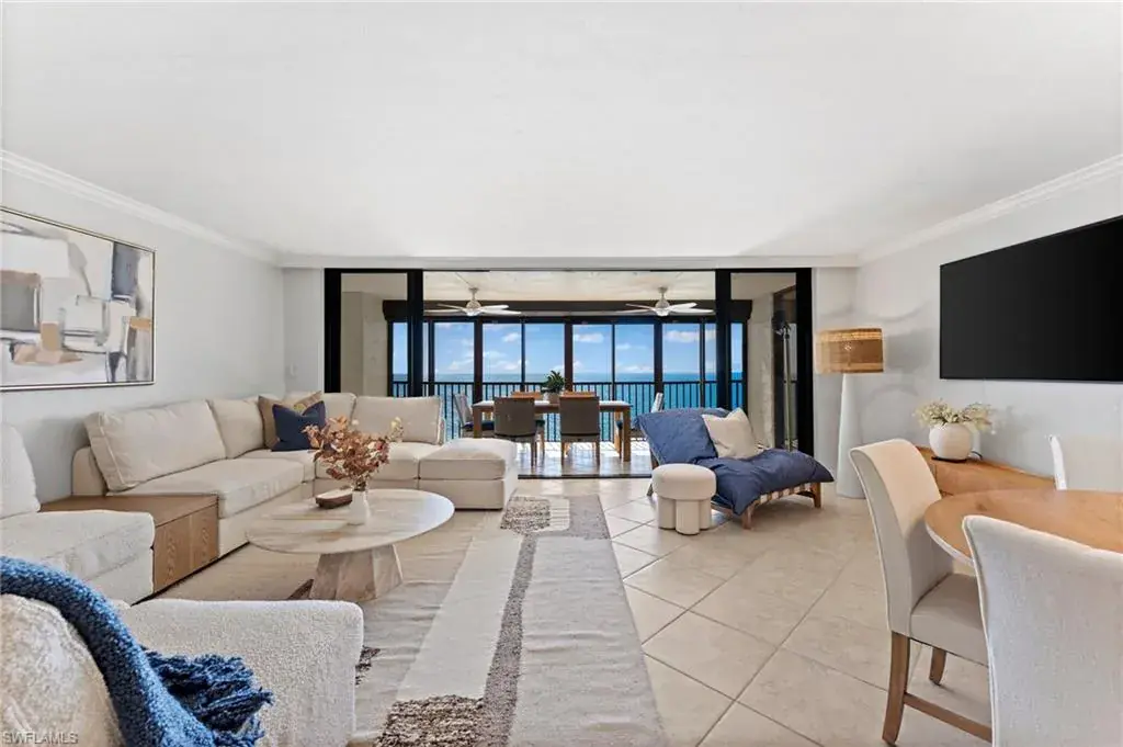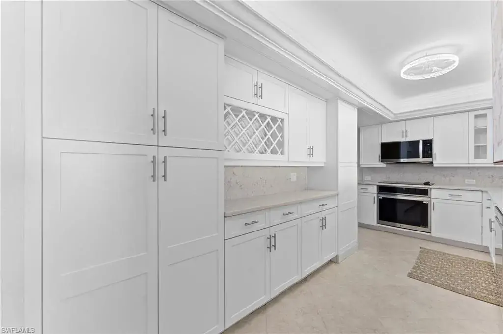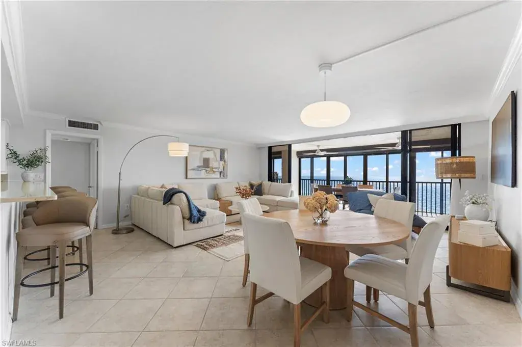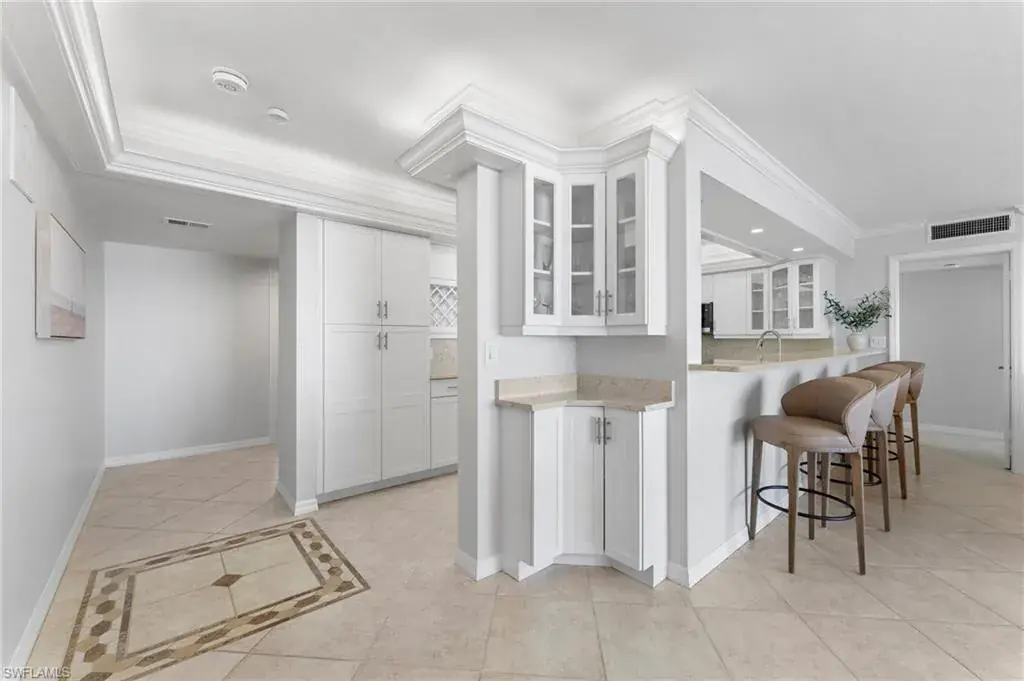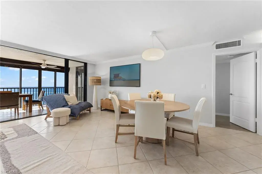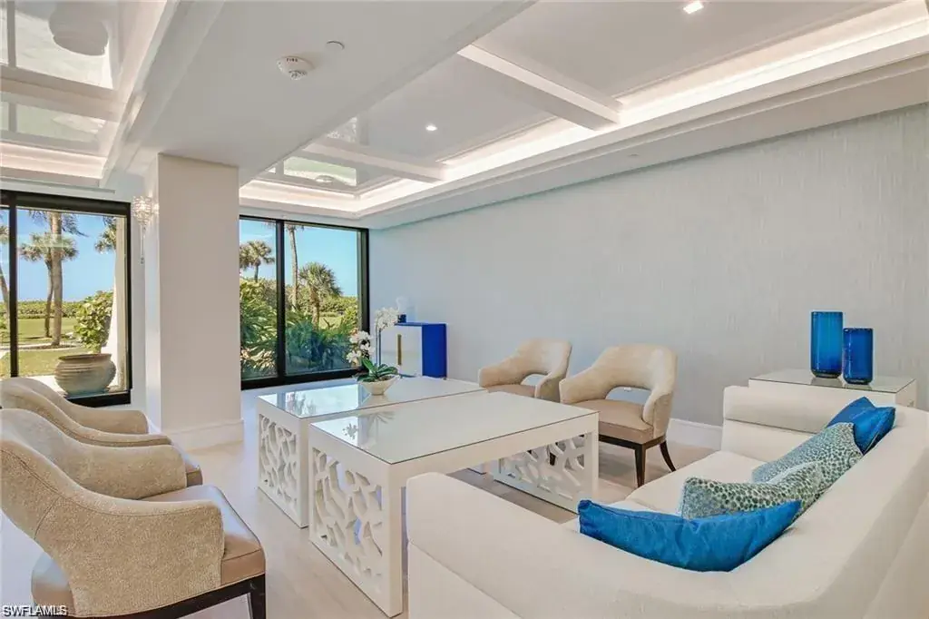 SKYHIGH VIEWS – Highly coveted, newly furnished “03” stack unit features an open floorpan with 2 master suites facing direct beachfront, both with access to the screened lanai, and great room with spacious kitchen. Well-appointed with updated finishes include neutral tile throughout, white shaker refaced cabinets, popular quartz countertops and new stainless steel appliances in the kitchen. Both bathrooms have been freshly updated with new shaker cabinetry and quartz countertops and fresh lighting for a bright and spacious design. One master bedroom has been built out through the patio for additional interior living space/sitting area and still has access to the 35+ foot long expansive screened lanai for stunning views. Additional upgrades include electric hurricane shutters, desk/office built in and 2023 HVAC & Water Heater. Residents at Vanderbilt Gulfside enjoy a gated resort compound with over 750 feet of beach frontage, the largest heated, salt water pool on Vanderbilt Beach, 2 guest suites, 2 tennis courts, Tesla charging stations, barbecue grills and an exercise facility all overlooking 8+acres of professionally landscaped grounds. Full time on-site staff with attended lobbies makes living in this resort community a true pleasure!