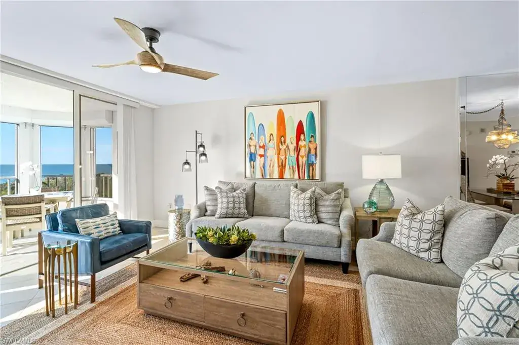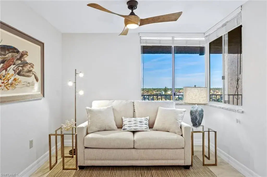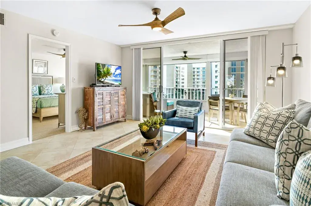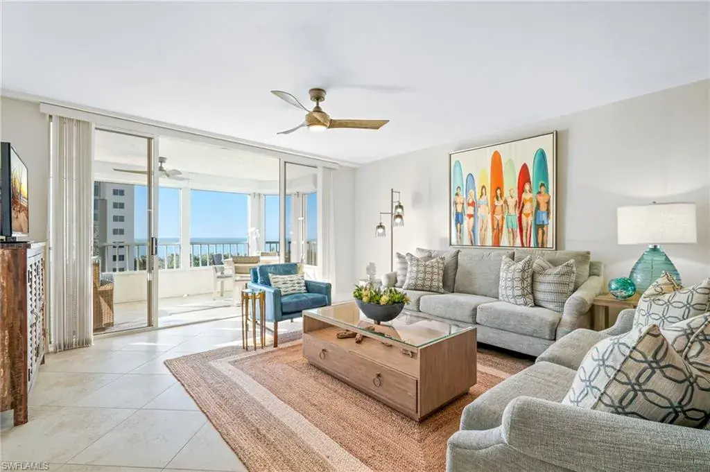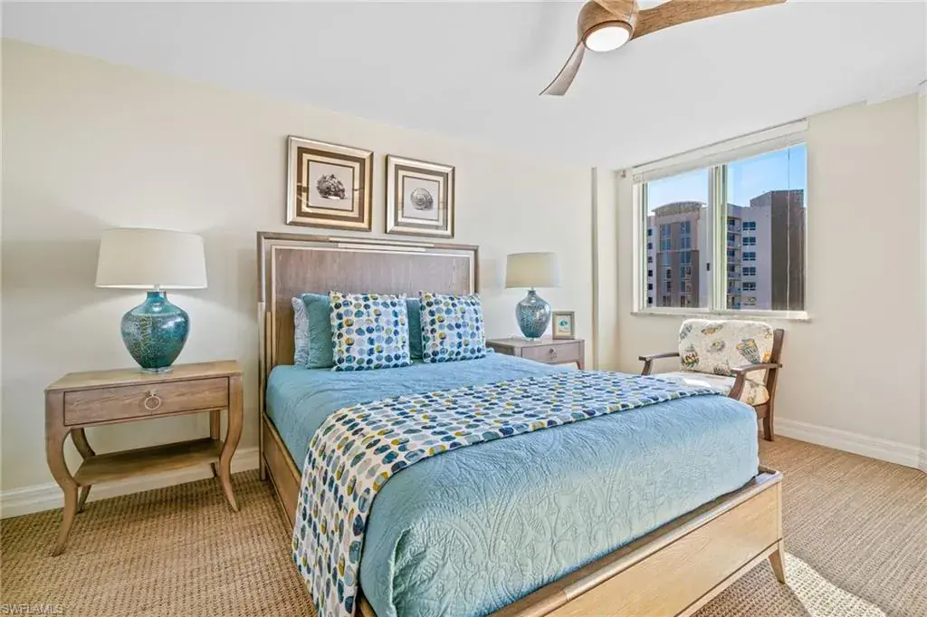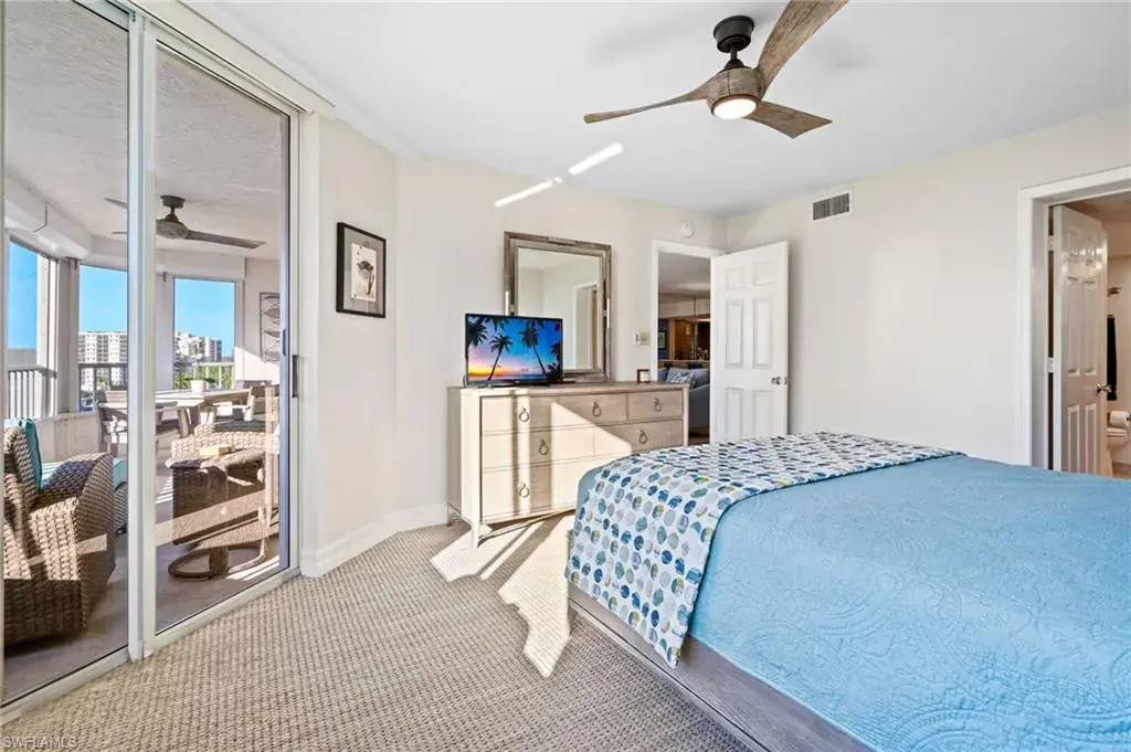 Sunsets, cocktails and dolphins! This luxurious 2-bedroom, 2-bathroom condo (almost 1500 sq ft) is located on the quieter north end of Vanderbilt Beach. Enjoy spectacular sunsets from your private screened lanai and watch dolphins play in the bay from your open rear balcony. This furnished and turnkey condominium includes many recent upgrades (2022): new kitchen cabinet fronts and countertops, fresh paint throughout, a custom California Closets master closet, new light fixtures, and new lanai furniture. The eat-in kitchen is perfect for casual dining or a home office, with ample counter space and pull-out trash/recycling. The spacious master bedroom features new carpeting, abundant natural light, and direct lanai access. The en-suite bathroom includes double sinks, an updated shower, a custom closet, and two additional closets. The guest bedroom offers bay views, twin beds, and a large closet. TVs are conveniently located in each bedroom and the living room. Enjoy private, keyed access to Vanderbilt Beach across the street. Electric shutters offer peace of mind and storm protection. Building amenities include a trash chute and individual air-conditioned storage unit (#702). Vanderbilt Landings (72 units between two buildings) offers tennis courts, bocce ball, a barbecue area, a fishing pier, and bike storage. Move right in and enjoy for 2025 season or take advantage of the flexible lease policy.