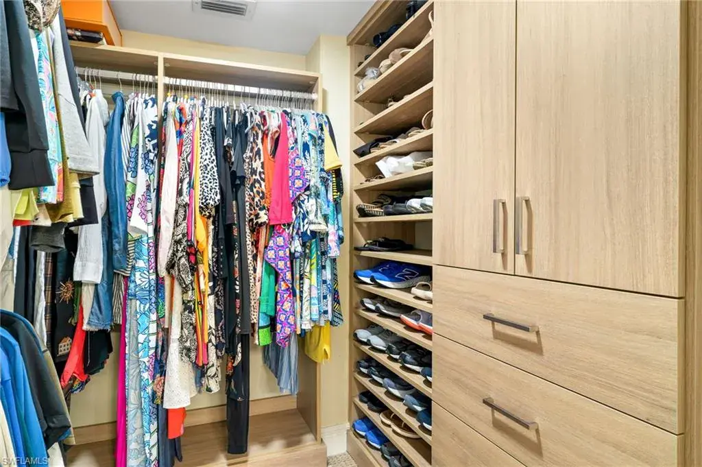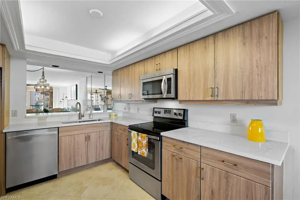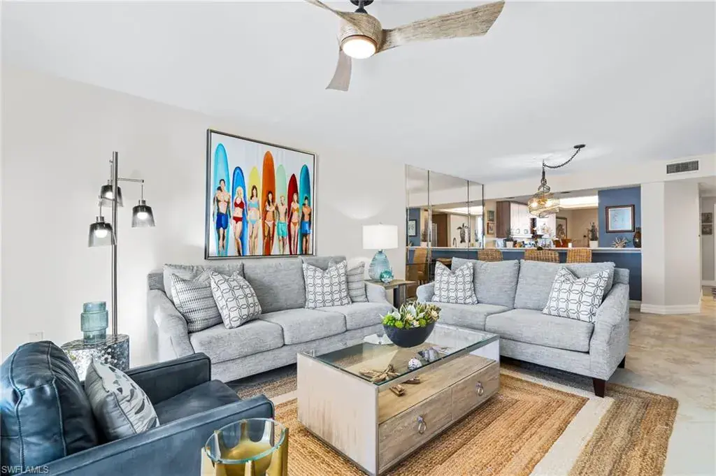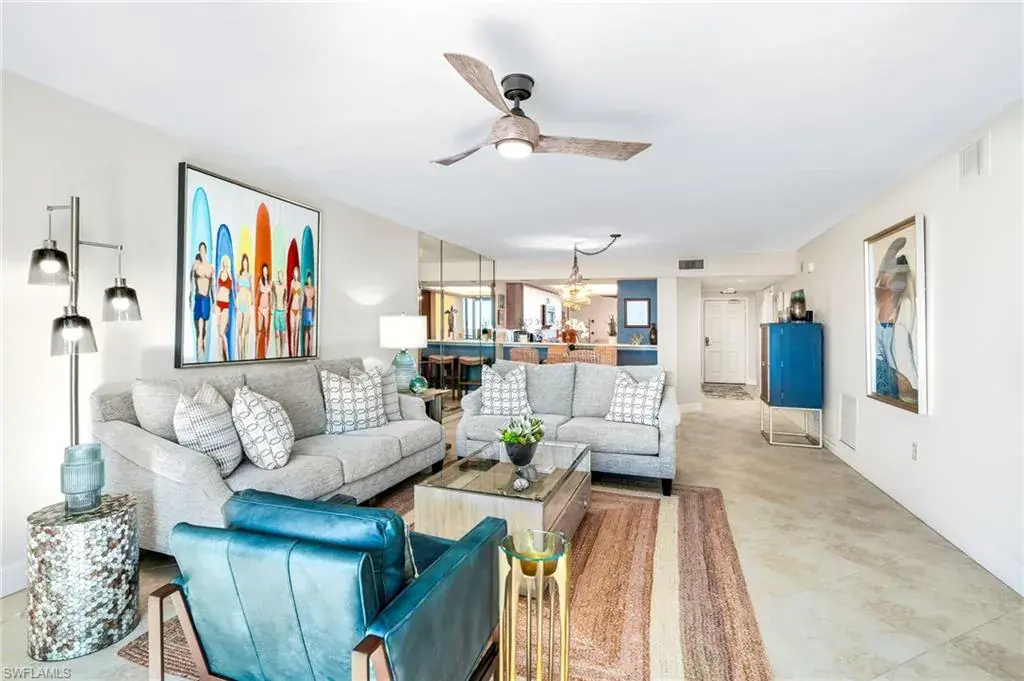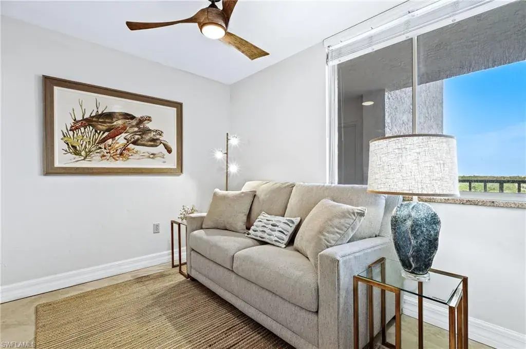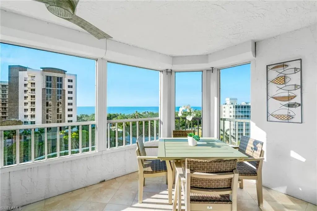 Sunsets, cocktails and dolphins! This luxurious 2-bedroom, 2-bathroom condo (almost 1500 sq ft) is located on the quieter north end of Vanderbilt Beach. Enjoy spectacular sunsets from your private screened lanai and watch dolphins play in the bay from your open rear balcony. This furnished and turnkey condominium includes many recent upgrades (2022): new kitchen cabinet fronts and countertops, fresh paint throughout, a custom California Closets master closet, new light fixtures, and new lanai furniture. The eat-in kitchen is perfect for casual dining or a home office, with ample counter space and pull-out trash/recycling. The spacious master bedroom features new carpeting, abundant natural light, and direct lanai access. The en-suite bathroom includes double sinks, an updated shower, a custom closet, and two additional closets. The guest bedroom offers bay views, twin beds, and a large closet. TVs are conveniently located in each bedroom and the living room. Enjoy private, keyed access to Vanderbilt Beach across the street. Electric shutters offer peace of mind and storm protection. Building amenities include a trash chute and individual air-conditioned storage unit (#702). Vanderbilt Landings (72 units between two buildings) offers tennis courts, bocce ball, a barbecue area, a fishing pier, and bike storage. Move right in and enjoy for 2025 season or take advantage of the flexible lease policy.