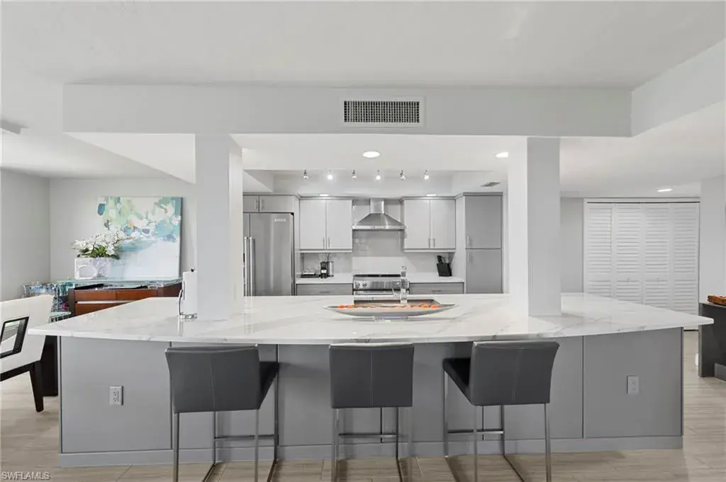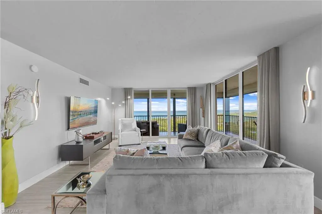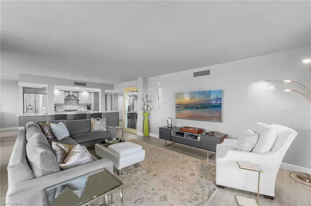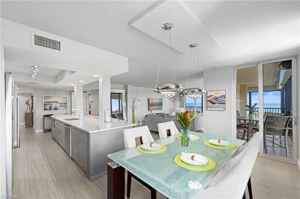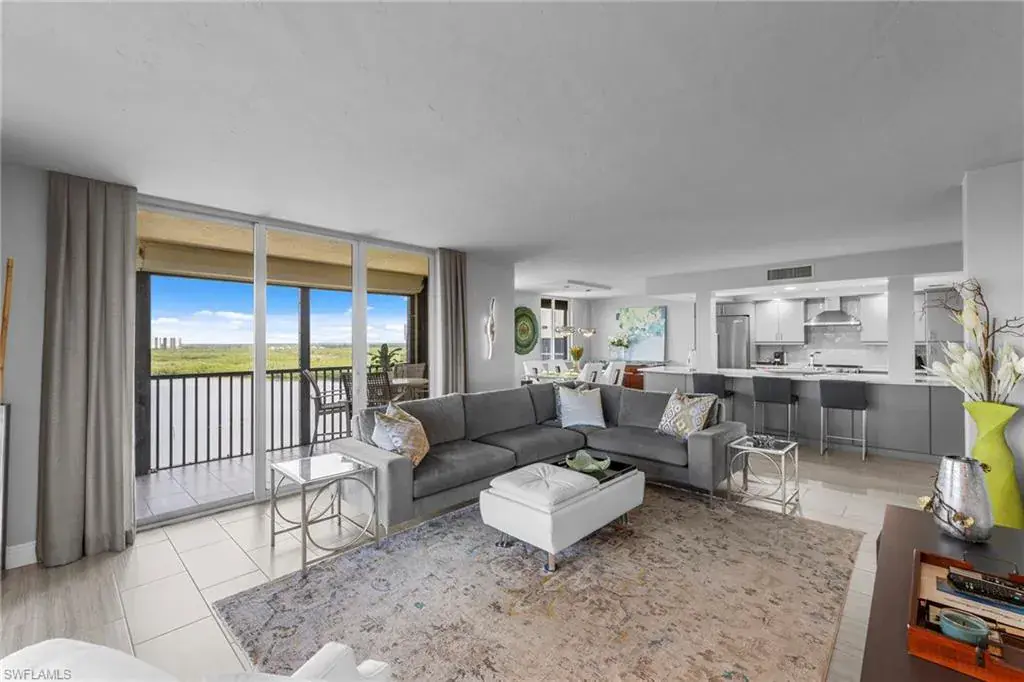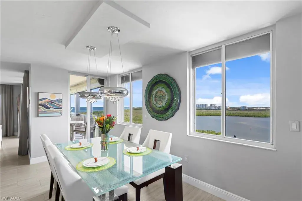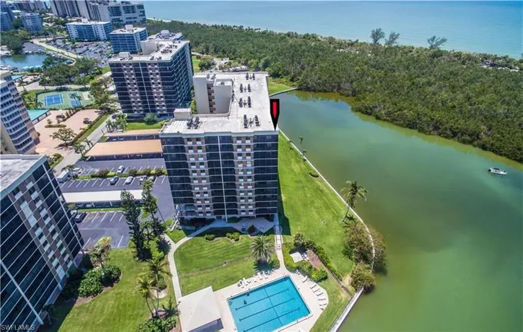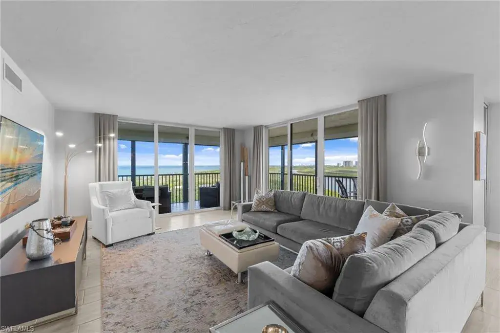 Enjoy unobstructed panoramic Gulf and bay views from this rarely available corner penthouse, just steps to Vanderbilt Beach and Delnor-Wiggins Pass State Park. This light-filled residence offers water views from every window and a spacious wraparound lanai, plus a private screened balcony off the primary suite. Completely remodeled with high-end modern coastal finishes. The open layout features two bedrooms and two full baths, neutral flooring, updated kitchen and baths, and electric storm shutters for peace of mind. A covered parking space and separate owner storage are included. Surf Colony II offers outstanding amenities: a bayside pool with lap lanes, tennis, pickleball, bocce, kayak storage, and the opportunity to lease boat slips when available, with direct Gulf access and no bridges. Enjoy daily beach walks, paddle through Turkey Bay’s mangroves, or watch dolphins and manatees from the shore. Located in one of Naples’ most desirable coastal neighborhoods—close to LaPlaya Beach Club, The Ritz-Carlton, Mercato, Waterside Shops, and Artis–Naples. The location, the views, and the lifestyle are exceptional. A perfect retreat for beach lovers, boaters, and sunset seekers alike. Move-in ready.