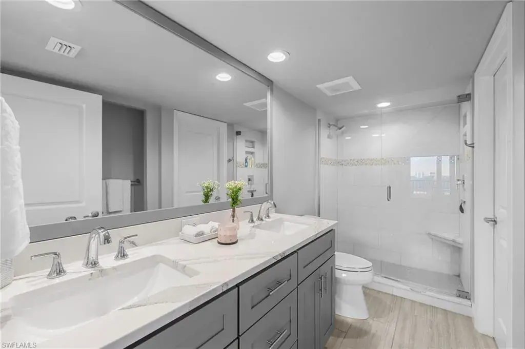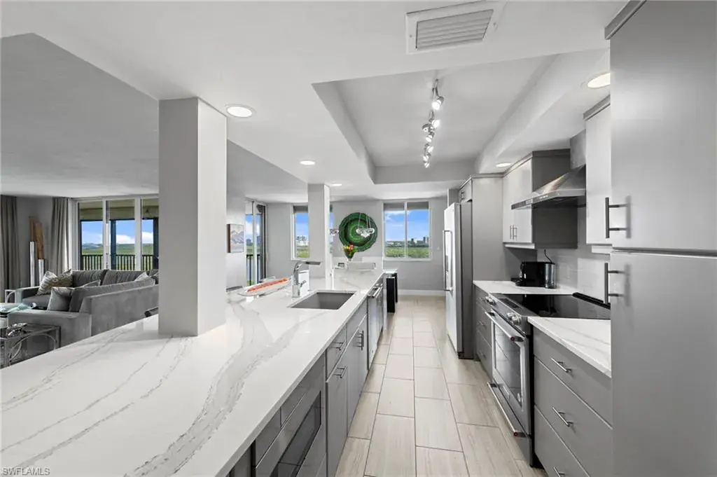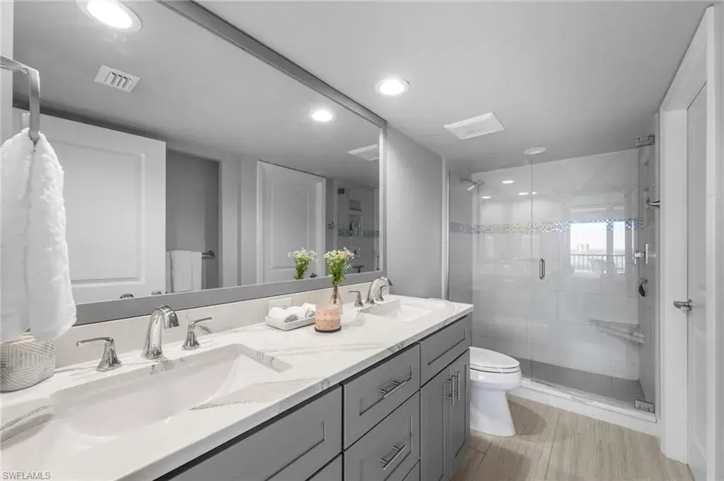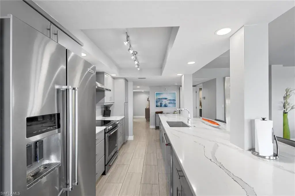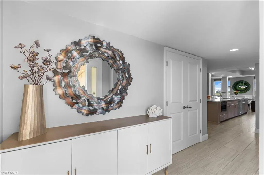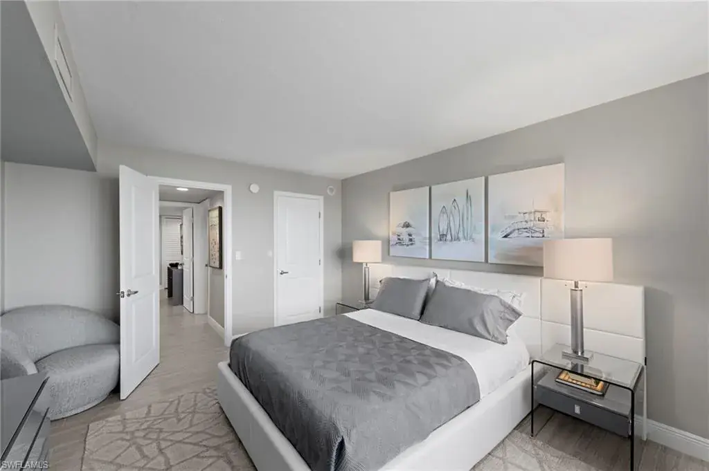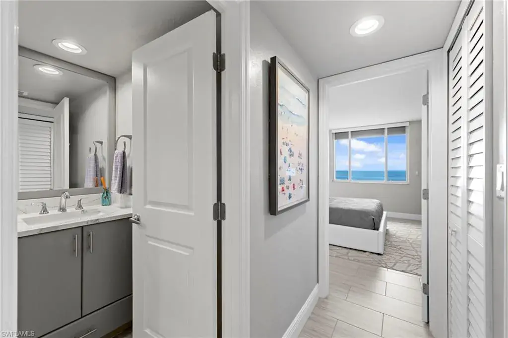 Enjoy unobstructed panoramic Gulf and bay views from this rarely available corner penthouse, just steps to Vanderbilt Beach and Delnor-Wiggins Pass State Park. This light-filled residence offers water views from every window and a spacious wraparound lanai, plus a private screened balcony off the primary suite. Completely remodeled with high-end modern coastal finishes. The open layout features two bedrooms and two full baths, neutral flooring, updated kitchen and baths, and electric storm shutters for peace of mind. A covered parking space and separate owner storage are included. Surf Colony II offers outstanding amenities: a bayside pool with lap lanes, tennis, pickleball, bocce, kayak storage, and the opportunity to lease boat slips when available, with direct Gulf access and no bridges. Enjoy daily beach walks, paddle through Turkey Bay’s mangroves, or watch dolphins and manatees from the shore. Located in one of Naples’ most desirable coastal neighborhoods—close to LaPlaya Beach Club, The Ritz-Carlton, Mercato, Waterside Shops, and Artis–Naples. The location, the views, and the lifestyle are exceptional. A perfect retreat for beach lovers, boaters, and sunset seekers alike. Move-in ready.