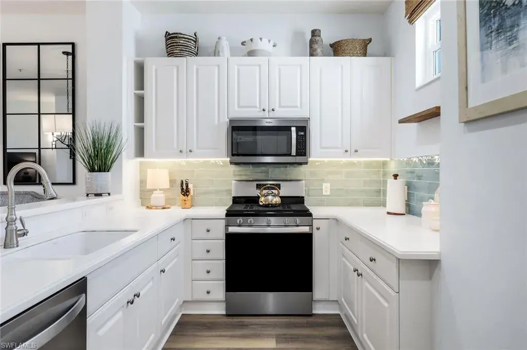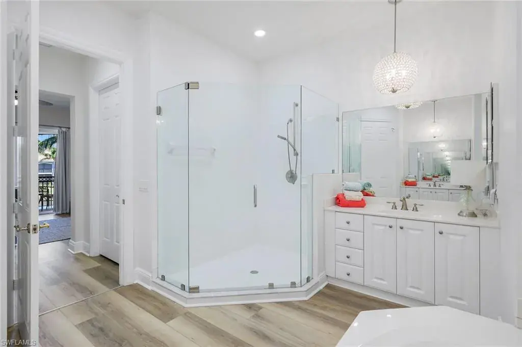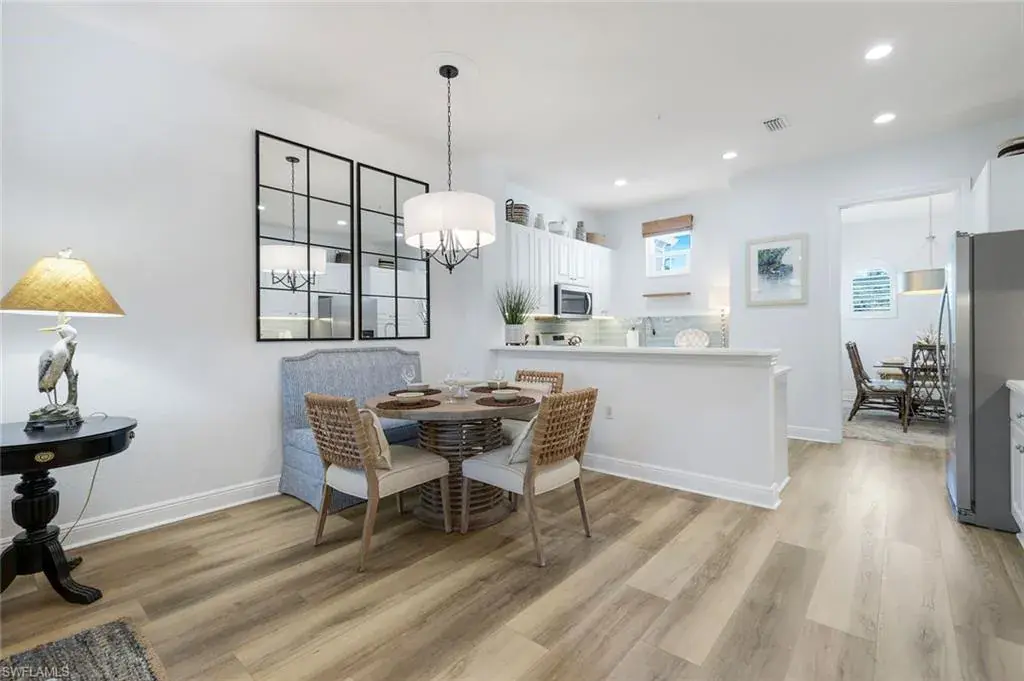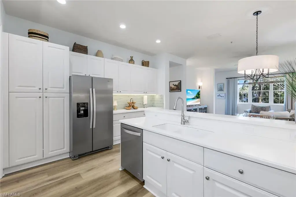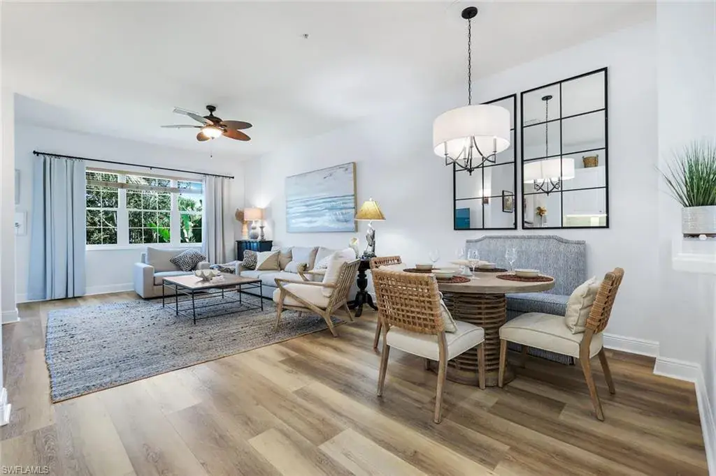 Step inside and be enveloped in the atmosphere of calm. This absolutely lovely, perfectly and completely furnished coach home in Fiddler’s Creek is the dream. Thoughtfully designed and decorated, using every area to create a moment. 3 spacious bedrooms, 3 baths, living room, dining room, family room, adorable casual dining area off the kitchen, plus an outdoor covered oasis on the private lanai means relaxation at every turn. Primary Suite offers 2 large walk in closets, dual vanities, soaking tub, new glass walled shower, and separate water closet. Large sliders off the bedroom feature water views and palms swaying in the breeze. New wide plank Cortec flooring throughout, 2 year old tankless water heater and AC, freshly painted white walls, and a warm comfortable palette of color that just feels perfectly harmonized. White kitchen with stainless appliances and new sky blue large tile backsplash adorns the wonderful heart of the home. The glorious Florida light streams in through the plantation shuttered windows and rooms at just the right moments, allowing bright good morning coffee on the lanai and cool shade in the afternoon to unwind. This unit has ample storage plus the ability to install an elevator if desired.The village of Varenna has the advantage of newer roofs, gutters, downspouts, impact windows, freshly pained exteriors ant it’s own village pool nearby. Situated on a quiet cut de sac in the fabulous community of Fiddler’s Creek, offering a resort lifestyle like no other. Amenities galore including the 54,000 sq ft Club and Spa, Fitness center, 2 resort pools, tennis, bocce, ample pickle ball, 2 restaurants, plus optional golf, beach club, and marina memberships. Minutes to Marco Island or downtown Naples, this is the one.