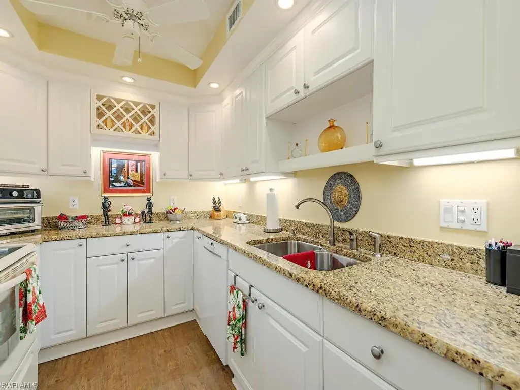 Tastefully decorated for comfortable living. The kitchen and bathrooms have been updated with granite counter tops, tray ceilings, under cabinet lighting, and ceiling fans in every room. Pull down hurricane shutters on the lanai, impact windows throughout and privacy shutter on the lanai/living room slider provide additional privacy. Laminate vinyl wood flooring in the living room, dining room, den, ceramic tile in the bathrooms, and carpeting in the bedrooms. All beautiful new clubhouse and lobby renovations make for a tranquil, lovely entrance. Don’t forget the amenities; pickleball, tennis, pool, clubhouse, library, game room, and the fitness center make for a healthy environment. Call for a showing today!