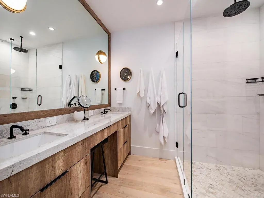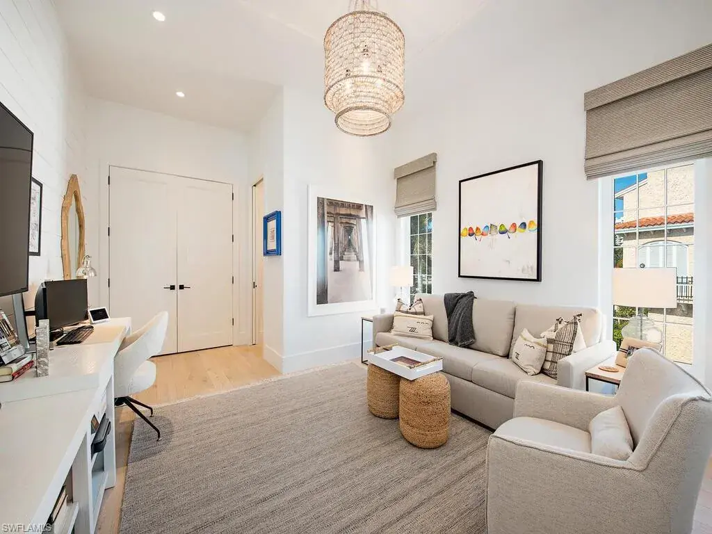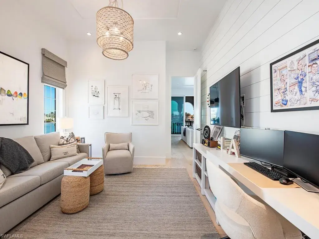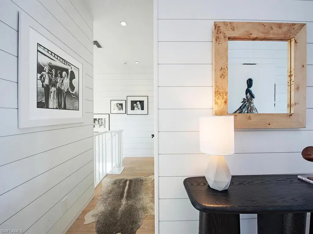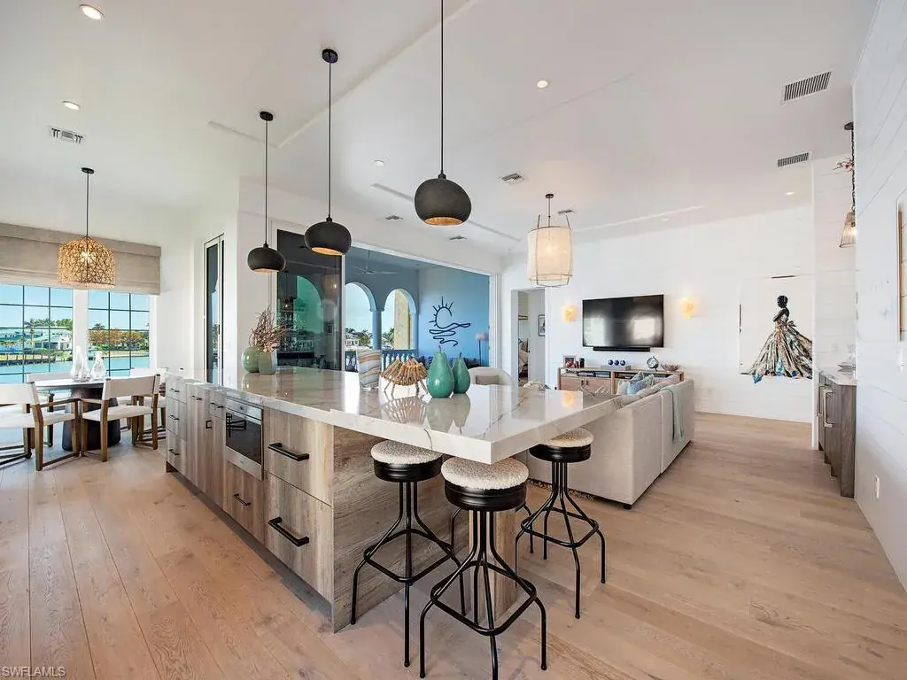 Step inside to discover elegant white oak floors, soaring high ceilings, and custom shiplap details throughout. The home has an airy, sophisticated ambiance, featuring 9-foot sliding doors onto the large, private lanai, a gourmet open kitchen with a spacious island that seamlessly connects to the great room and its bar area — ideal for entertaining. Each bedroom boasts generous closet spaces and beautifully outfitted ensuite bathrooms.