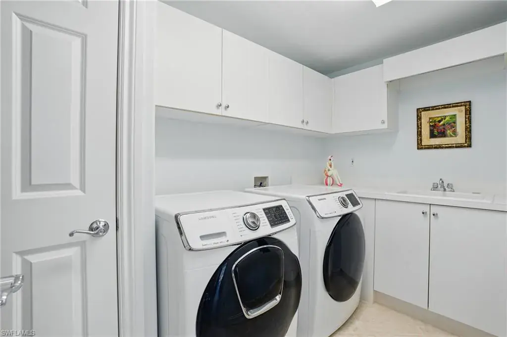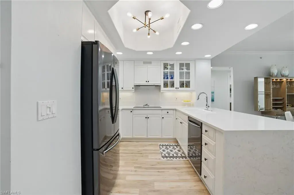 A beautifully updated, clean, professionally decorated 2-bedroom, 2-bathroom western-facing condo in the prestigious Ventanas at Tiburon. This elegant residence features modern quartz countertops with a waterfall edge, an induction cooktop, a built-in electric fireplace, and newly installed wood plank flooring in the living area. Both bedrooms have fresh tile flooring, and the unit is equipped with a water softener system for added comfort. This unit offers private, stunning sunset views with no buildings in sight. Ventanas condos offer new impact-resistant windows and sliding doors, a recently replaced roof, and resort-style amenities, including a large pool, spa, lap lanes, barbecues, and a ground-level garage with an assigned parking space and storage locker. Additional garage parking spaces are available for approximately $50 per month. Fully furnished with brand-new Restoration Hardware pieces, the unit also includes Hunter Douglas blinds, fresh paint, new ceiling fans, and an extended veranda beyond the screened lanai, ideal for enjoying stunning sunsets. PERFECT for a 1031 Exchange!