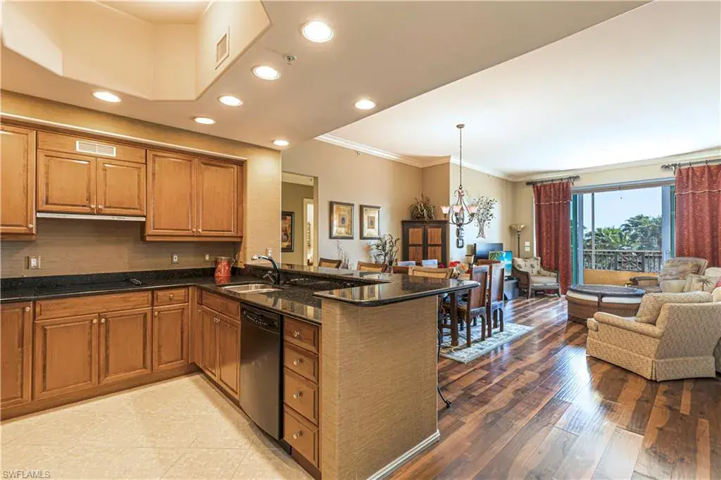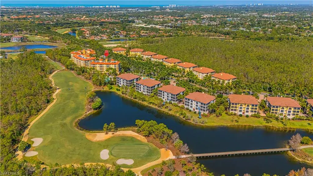 As you step inside you will be greeted by an open concept living space bathed in Natural light, thanks to large sliding glass doors that frame picturesque views of the pools, the Greg Norman designed Gold golf course, and surrounding landscape. The spacious living room features low maintenance Luxury Vinyl flooring, tasteful crown moulding creating an inviting ambiance for both relaxation and entertaining. The well laid out kitchen with black stainless steel appliances, plenty of cabinetry, and beautiful granite countertops make food prep a cinch. A large breakfast bar provides a perfect spot for casual dining, while the adjacent dining area is ideal for hosting parties with friends and family. The master suite is Large and features a walk in closet, and an en-suite bathroom that has dual sinks, a large soaking tub and a separate glass enclosed shower. The second bedroom is equally inviting with plenty of closet space as well as an easy access full bath, with a tub/shower combo. Stepping out into your screened in Lanai, you can enjoy morning coffee, or evening cocktails while enjoy beautiful golf course and pool views that truly define the beauty of Tiburon. Residents of this exclusive community can enjoy the many amenities offered, some with and without special memberships. Tiburon has a prime Naples location, being both close to the pristine beaches and upscale shopping and dining. This beautiful turnkey condo is the perfect place to call home for those seeking a luxurious and active lifestyle here in paradise. Come have a look and lets make it yours.