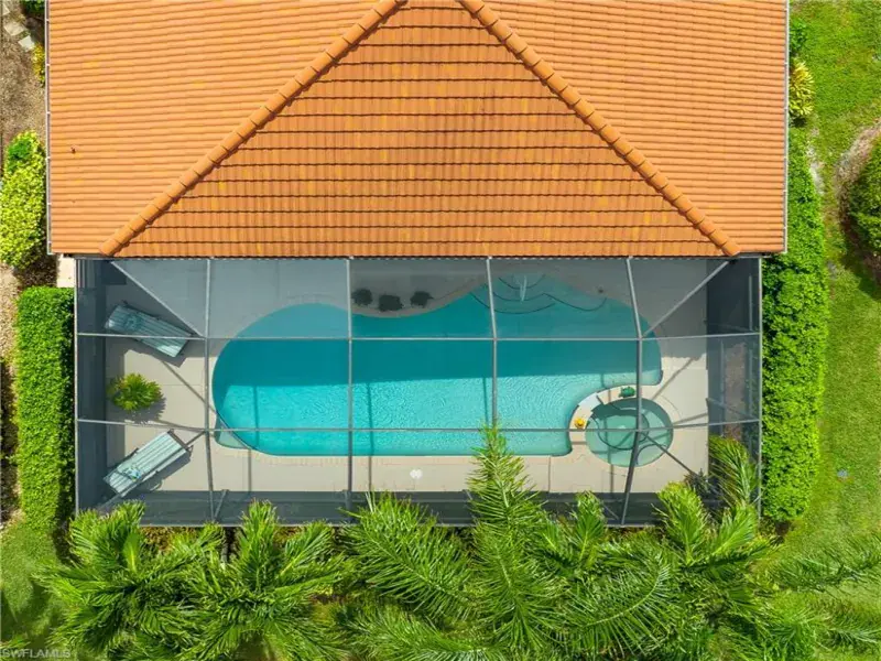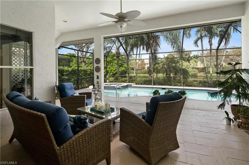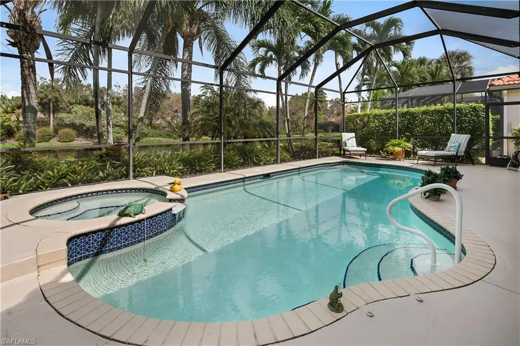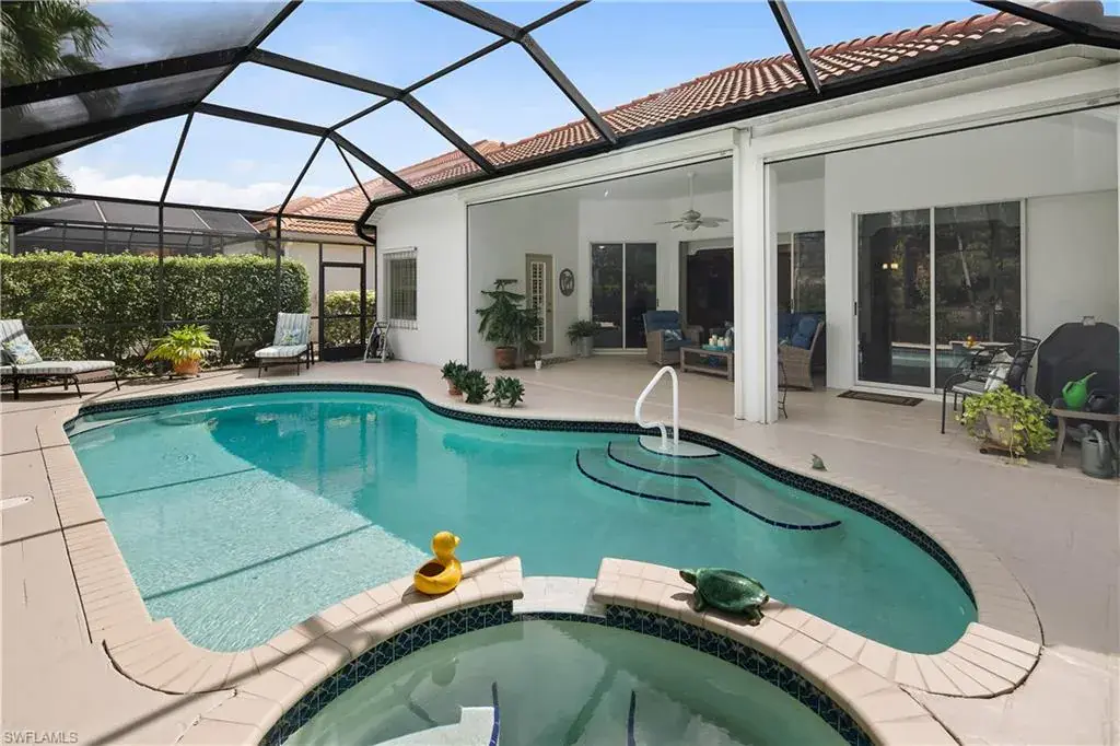 Nestled in the heart of ‘high and dry’ Pelican Marsh, this seldom available lakefront ‘Schooner’ model 3BR/2 -bath home in the beautiful Ventura neighborhood awaits. ‘One-Story-No Stairs-Move in Ready’! Total kitchen replacement includes quartz counters, cabinetry, and stainless GE Profile appliances, incl ‘French door’ fridge. Roomy breakfast nook overlooks lanai w/private pool & spa. Pristine water views in both directions. New electric remote-controlled storm screens across entire lanai and electric storm shutter at front entry. New hurricane-rated garage door. New roof 2018. Updated master-bath shower & comfy Kohler hi-boy commodes. Plantation shutters. Freshly painted exterior. Light and bright open concept living area with ample dining space beckons you past fully pocketing lanai doors towards the water. 3rd BR currently serves as study. Easy access to Pelican Marsh tennis, bocce, pickleball, fully equipped fitness facility, and championship golf/dining. Enjoy fabulous shopping, dining, and theatre at the nearby Shops of Mercado, and more shopping and gastronomic delights at the Galleria at Vanderbilt, which is easy walking distance from Ventura.