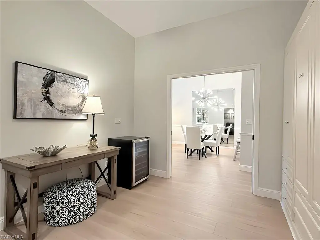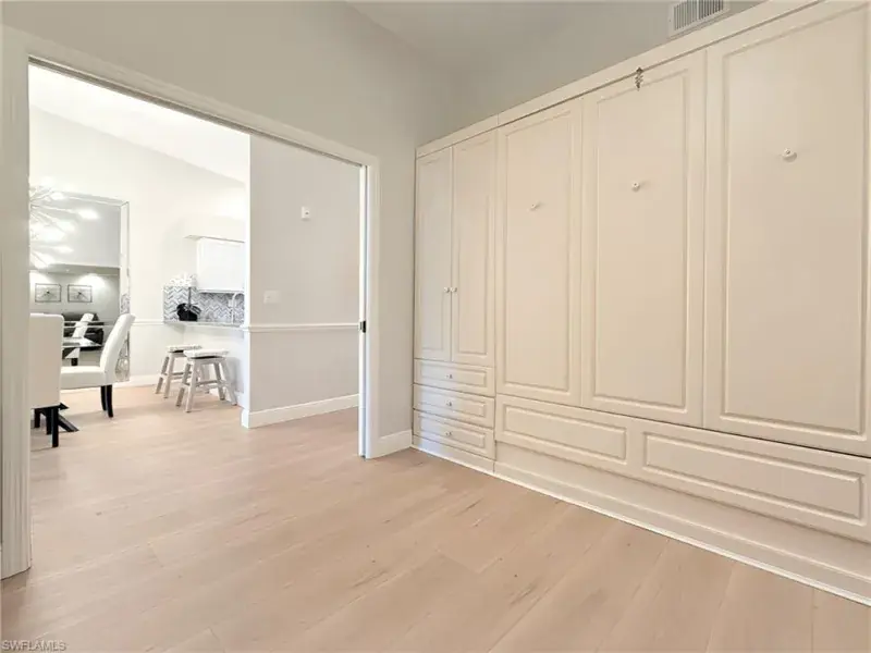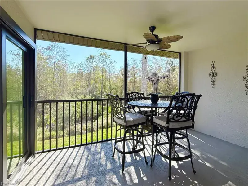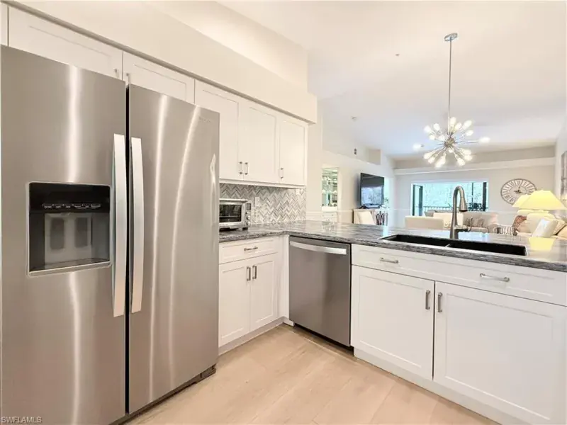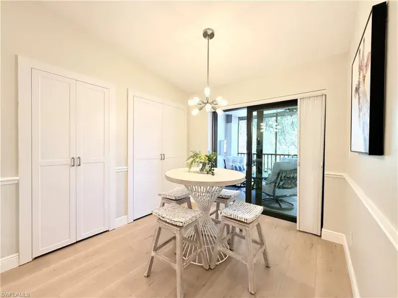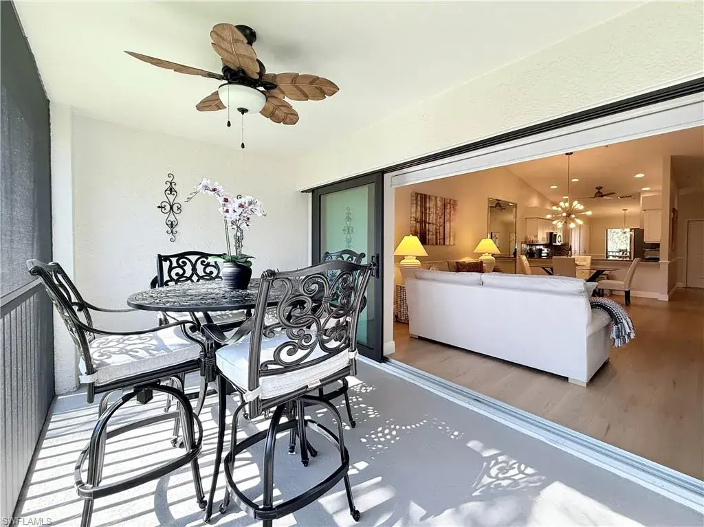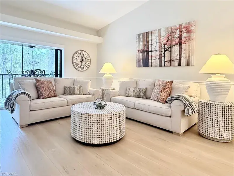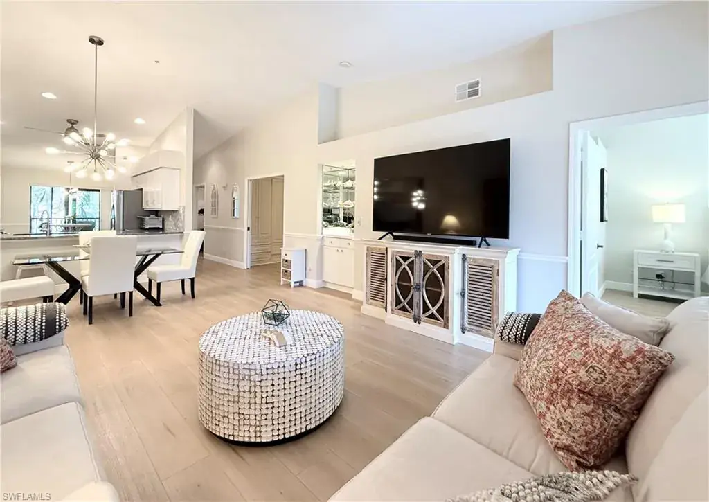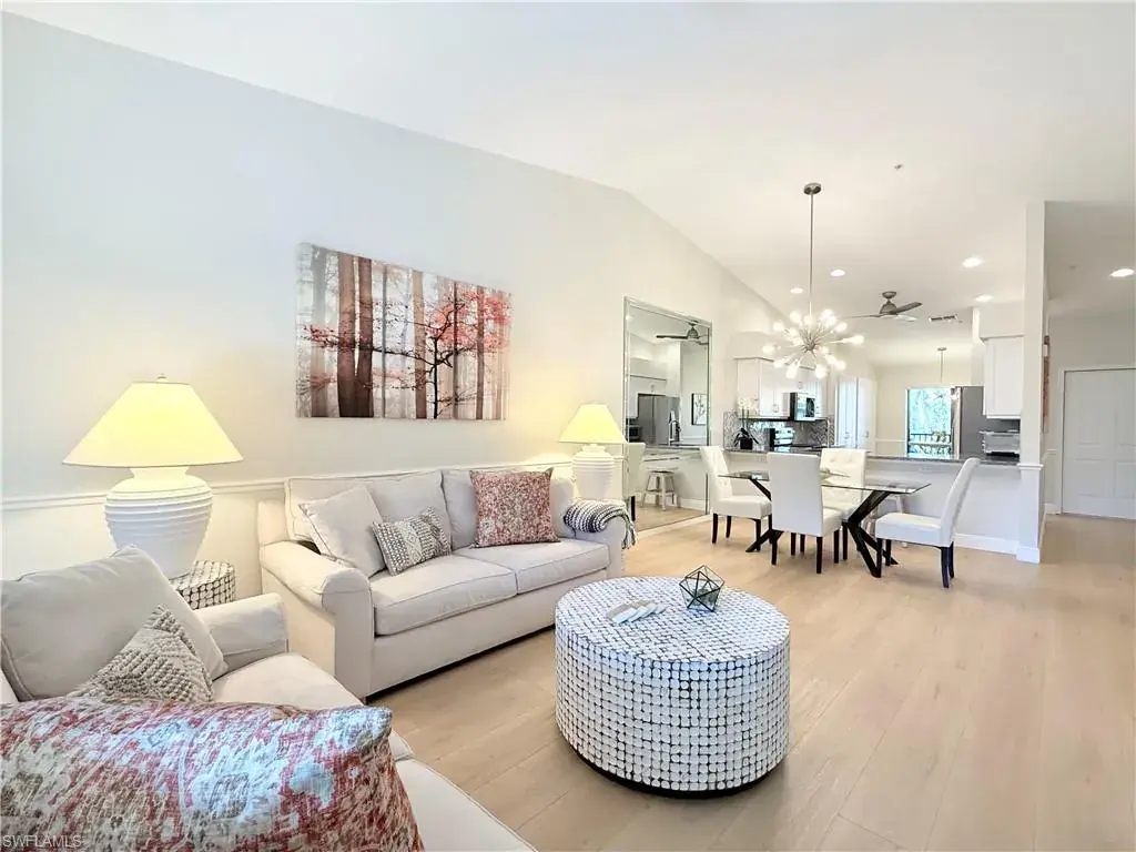 Absolutely gorgeous move in ready Veranda located in Naples Heritage Golf and Country Club!!! Unbelievable price – turnkey!!! 2 BR +DEN / 2 Bath Condo with Garage. This bright & beautifully furnished condo is ready for new owners. Situated on a quiet street within walking distance to clubhouse. You’ll fall in love immediately upon entry. Luxury vinyl plank flooring runs throughout condo with vaulted ceilings in main living area & primary BR. Interior is light and bright. Kitchen updates include white shaker cabinets, quartz countertops, custom tile backsplash, designer lighting & SS appliances. Kitchen has breakfast/eat in area with double pantry (shaker doors on pantries match cabinetry). Dining room and living room are open concept with bar. Den is located just off main living area. Pocket doors allow den to be closed off for privacy and used as 3rd BR (has Murphy Bed) or home office when needed. Spacious primary BR w/ 2 walk-in closets & bay window with sitting area. Primary bath has been entirely remodeled with top finishes. Primary BR split from guest BR for added privacy. Pocket door allows homeowner to create private bedroom and bath suite for guest. Enjoy relaxing and entertaining on both front and back screened lanais. Sliders from living room exit onto back lanai with view of golf and preserve. Sliders from breakfast/eat in exit to front lanai with view of courtyard. NEW HVAC, PGT IMPACT WINDOWS and SLIDERS, NEW LANAIS front and back. This is a MUST SEE Condo at a don’t miss out of price. Naples Heritage is bundle golf community with 18 hole golf course, driving range, putting green, resort style pool w/ cabana, tennis pavilion, fitness center, pickleball courts & bocce ball. Just minutes to downtown Naples and beaches. Come live the Naples Heritage lifestyle.