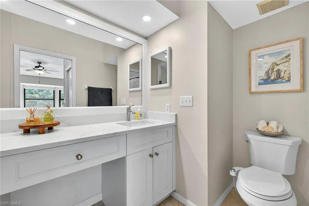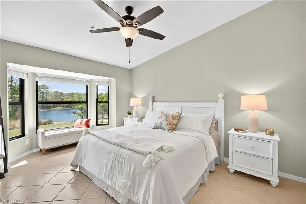 This remarkable home features a split floor plan with a spacious primary suite showcasing a bay window with beautiful golf course views, private lanai access, and two walk-in closets. Privacy is ensured for guests with a sliding door separating the guest suite. The den with pocket doors is perfect for use as an office or third bedroom. The open living and dining area flows seamlessly to the rear lanai, offering stunning views of the 18th tee, lake, and natural preserves. The eat-in kitchen opens to a large front lanai for additional outdoor dining and relaxation.
